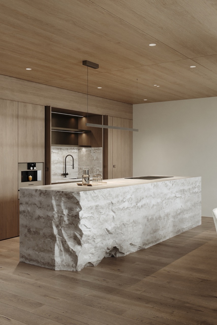 Концепция интерьера — современная интерпретация альпийской роскоши: сдержанной и спокойной, без демонстративных жестов, удобной и функциональной. Архитекторам было важно сохранить баланс между минимализмом и теплотой: фактуры дерева и камня, предметы мебели формируют ощущение уюта, при этом интерьер остается архитектурно чистым и выверенным. Основа — работа с природным контекстом: интерьерное решение построено на натуральных материалах, мягкой палитре спокойных, землистых оттенков. Эту идею дополняют большие панорамные окна — пространство становится светлым, открывается вид на Альпы.