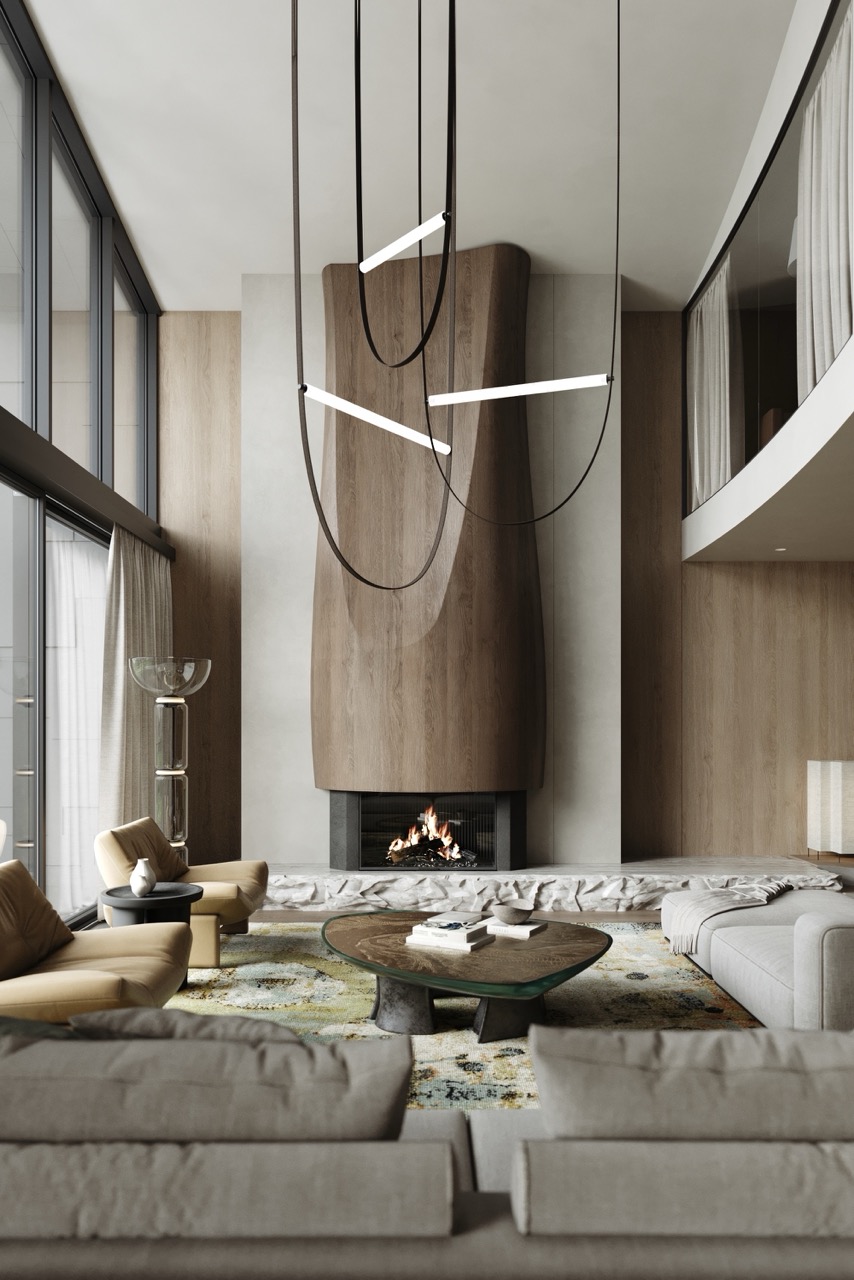 Центром жизни дома выступает третий уровень — это общее пространство кухни, столовой, гостиной со вторым светом и панорамой на альпийский пейзаж. Зона отдыха строится вокруг акцентного камина до потолка. Масштаб помещения подчеркивается подвесным светильником.