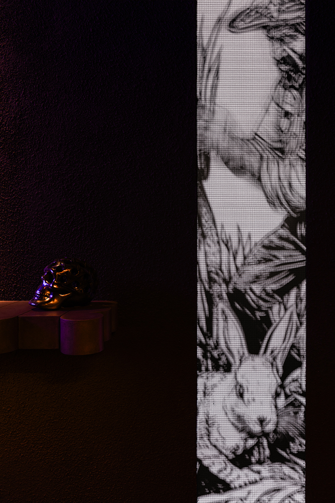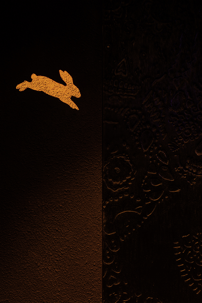 Также интерьер наполнен разнообразными ацтекскими изображениями и орнаментами, аккуратно интегрированными в общий образ: они появляются в рельефах на массивных бетонных стенах и на спинках лавок из черного дерева, на стенах уборных высечены надписи и рисунки, отсылающие к мастерству производства текилы. Важная для бара легенда ацтеков о кроликах богини Майяуэль, подарившей людям агаву, репрезентируется в пространстве не только благодаря фарфоровым фигуркам, но и через световую проекцию на стенах. Такой ход добавляет в интерьер дополнительную сценографию и интерактивность – кролики внезапно появляются и исчезают в случайных местах, интригуя гостей.