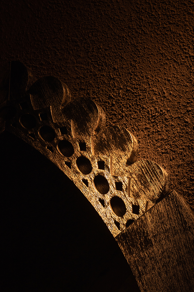 Одной из ключевых задач в работе над этим проектом стало создание сценария постепенного погружения гостя в обновленное пространство. В соответствии с разработанным сценарием он сначала попадает в темную зону входа, где ярко светится сиренево-розовым цветом давно знакомая вывеска «El Copitas». Затем его глаз начинает улавливать изменения и новые детали: резной шкаф, элементы отделки, ленты на гардеробе с надписями, перенесенными со стен старого бара, а также стрельчатую арку, ведущую в основной зал.