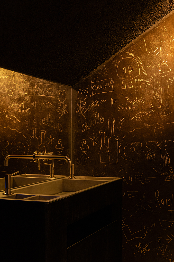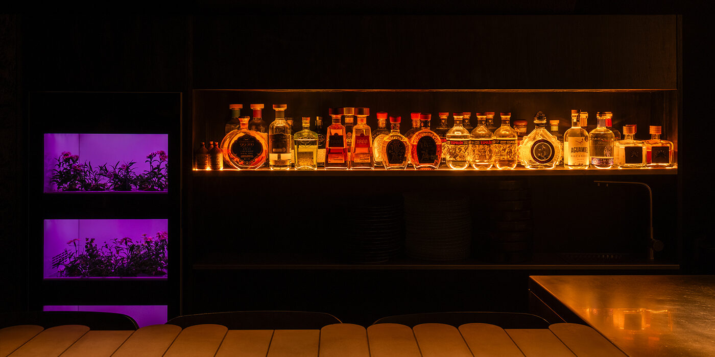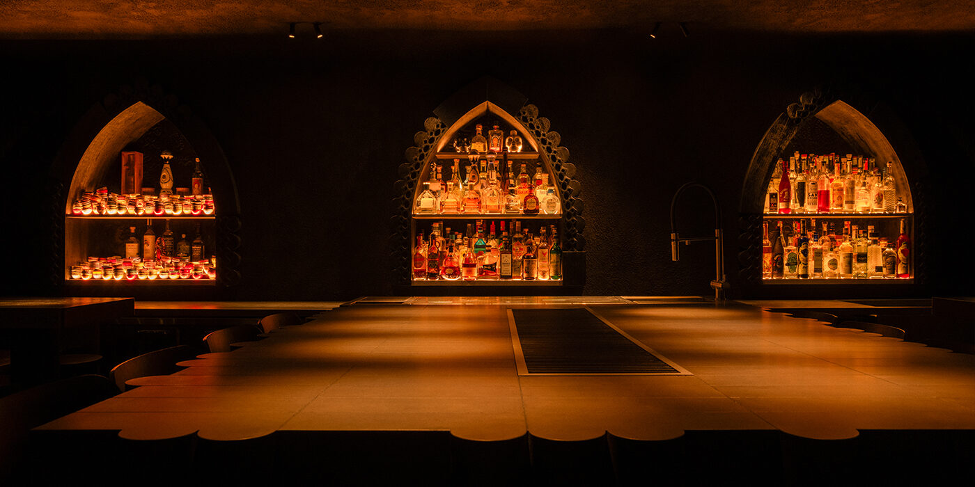 В основном зале, мягко погруженном в полумрак, заметно еще больше изменений: зона бара была развернута, посадки пустили по периметру, в центре по-прежнему размещен большой коммунальный стол из бетона, дополненный встроенной вентиляцией. За местом бартендера появились три подсвеченных «алтаря» в нишах со стрельчатыми арками, где расположены святыни бара – именные копиты и редкий мескаль.