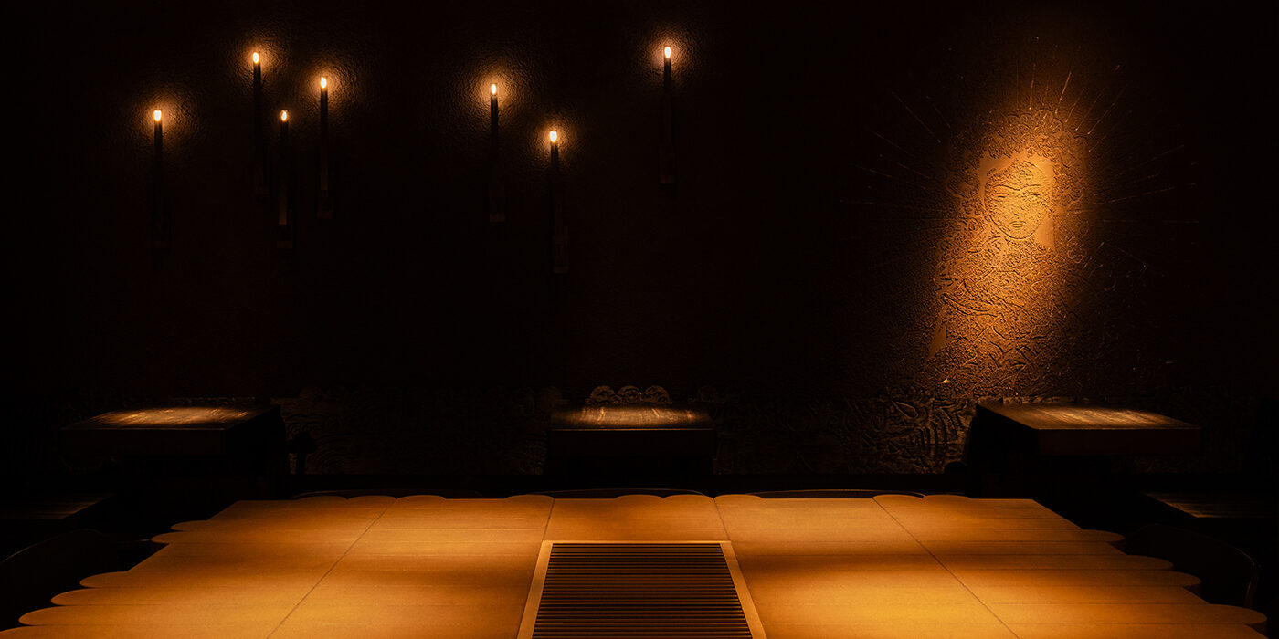 Интерьер был выполнен в полностью монохромной гамме: стены темно-коричневого, практически черного цвета, столешницы и стулья из темного дерева. По периметру мы установили светодиодные свечи, за баром – три локальных «алтаря». А «святыни», создающие уникальный дух бара на протяжении десяти лет, были элегантно интегрированы в новую историю.