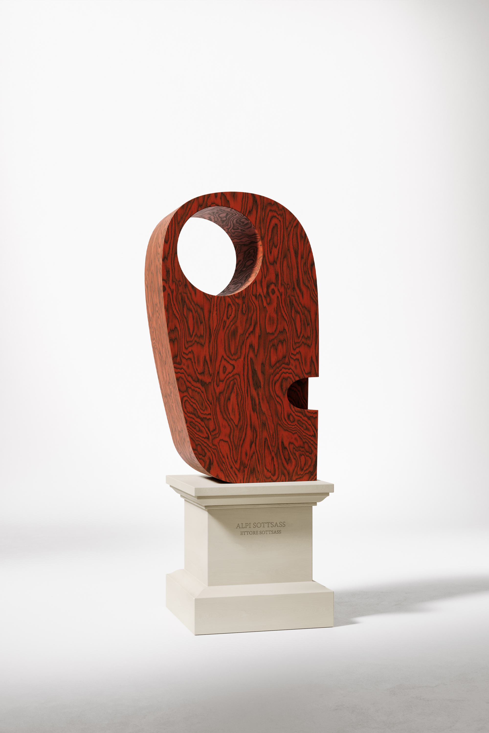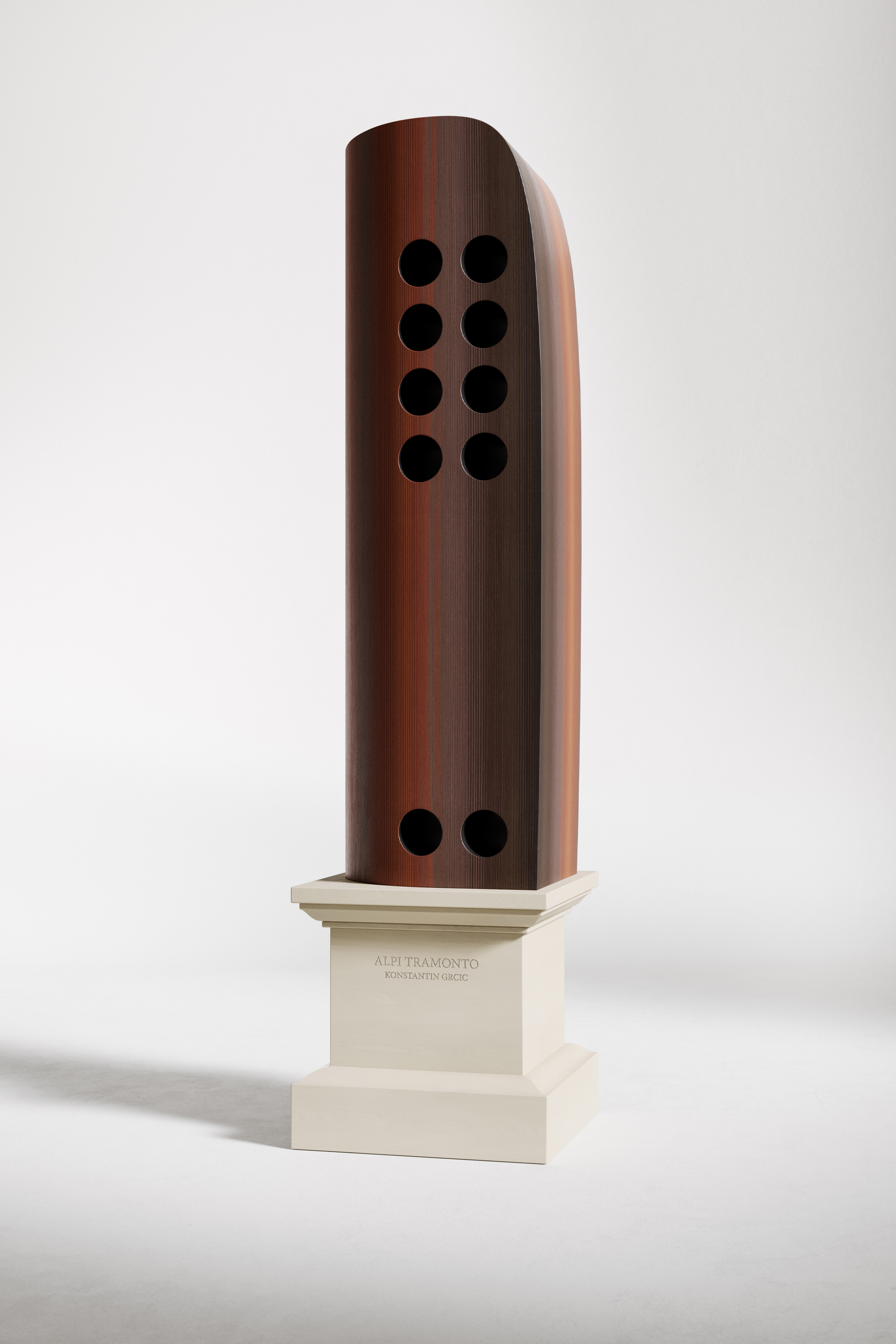 Композиция включает 14 деревянных тотемов, каждый из которых выполнен в уникальной отделке ALPI и установлен на одинаковых постаментах. Все они демонстрирует разные возможности шпона ALPI, разработанного как известными дизайнерами, так и внутри команды. Здесь и эффектный градиент Tramonto от Константина Грчича, и палитра Peacock and Grey от GamFratesi, и текстура Walnut Burl, имитирующая структуру капа. Среди других образцов: ALPI Kasumi Grey от nendo – мягкая текстура достигается за счет двухслойного шпона; Agreste Ouro и Prata от Estúdio Campana — визуальная аллюзия на потрескавшуюся землю бразильской Каатинги; Sottsass Red — радикальный красный, разработанный Этторе Соттсассом в 1980-х.