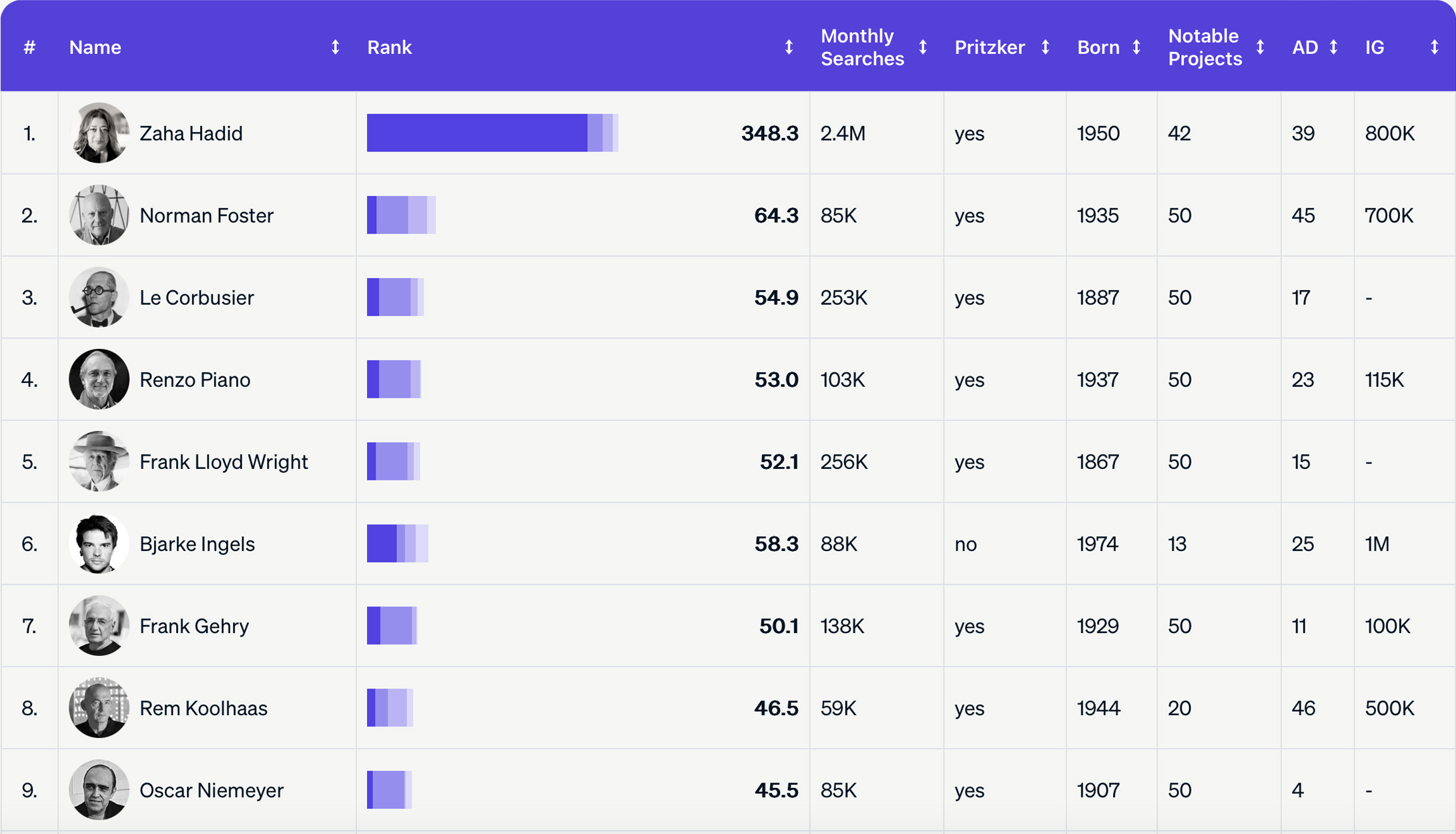 Как можно сравнивать популярность известных архитекторов? Для установки степени популярности известных архитекторов, мы обращаемся к модели STAR™ (v0.2), разработанной командой архитектурных аналитиков из MIT.