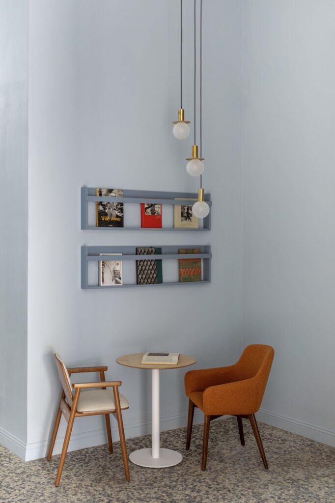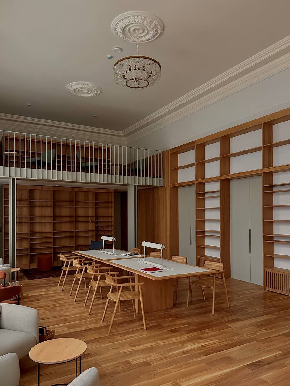 В просторном зале павильона с окнами, выходящими на главную аллею, располагается читальный зал и коворкинг. Высокие потолки позволили сделать в торце зала антресоль, создающую дополнительные общественные зоны. Архитекторами сохранены и бережно отреставрированы исторические люстры, восстановлен потолочный карниз. На фоне стеллажа с книгами, выстроенного по длинной стороне зала, формируются разные зоны для чтения и работы за ноутбуками: центральный стол на восемь рабочих мест, кресла вдоль окон, уютные места под антресолью.