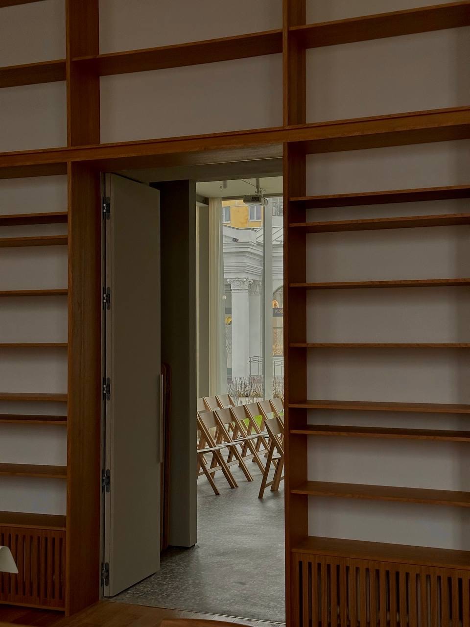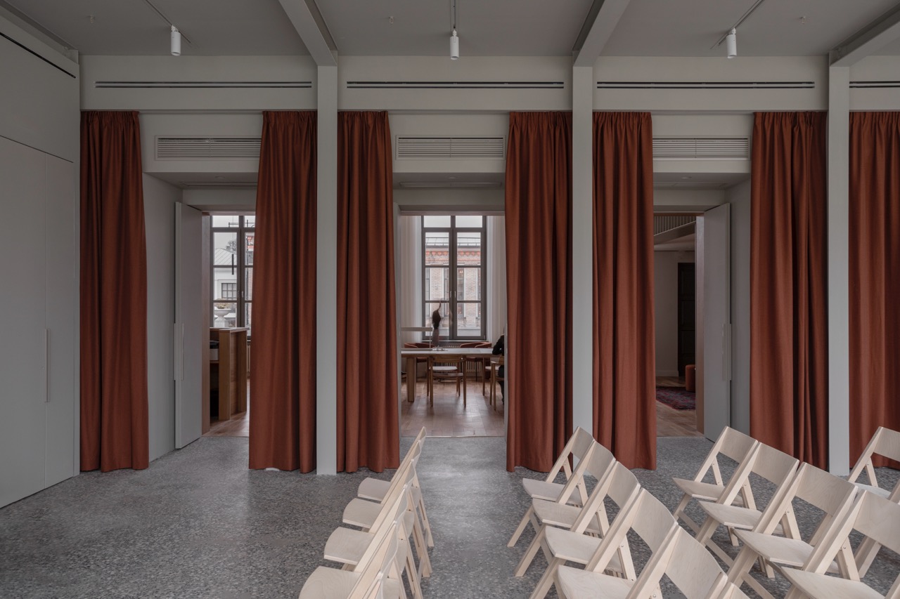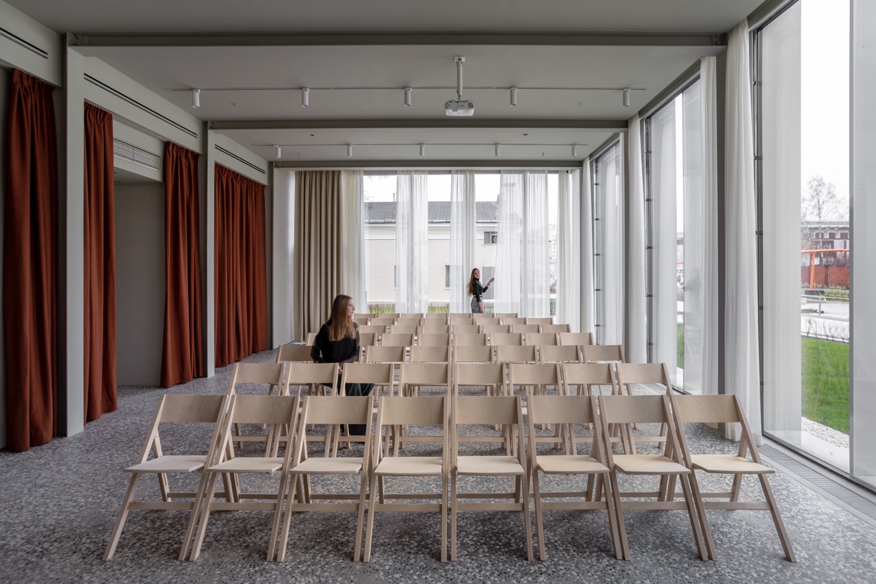 Универсальный зал имеет гибкое архитектурное решение: его можно быстро преобразовать под разные задачи. В режиме лекции или кинопоказа он вмещает до 54 человек. Здесь также можно проводить выставки, воркшопы и групповые занятия, архитекторами предусмотрены места для хранения мебели и стульев. Три проема на месте исторических окон соединяют пространство с читальным залом, позволяя при необходимости использовать их совместно.