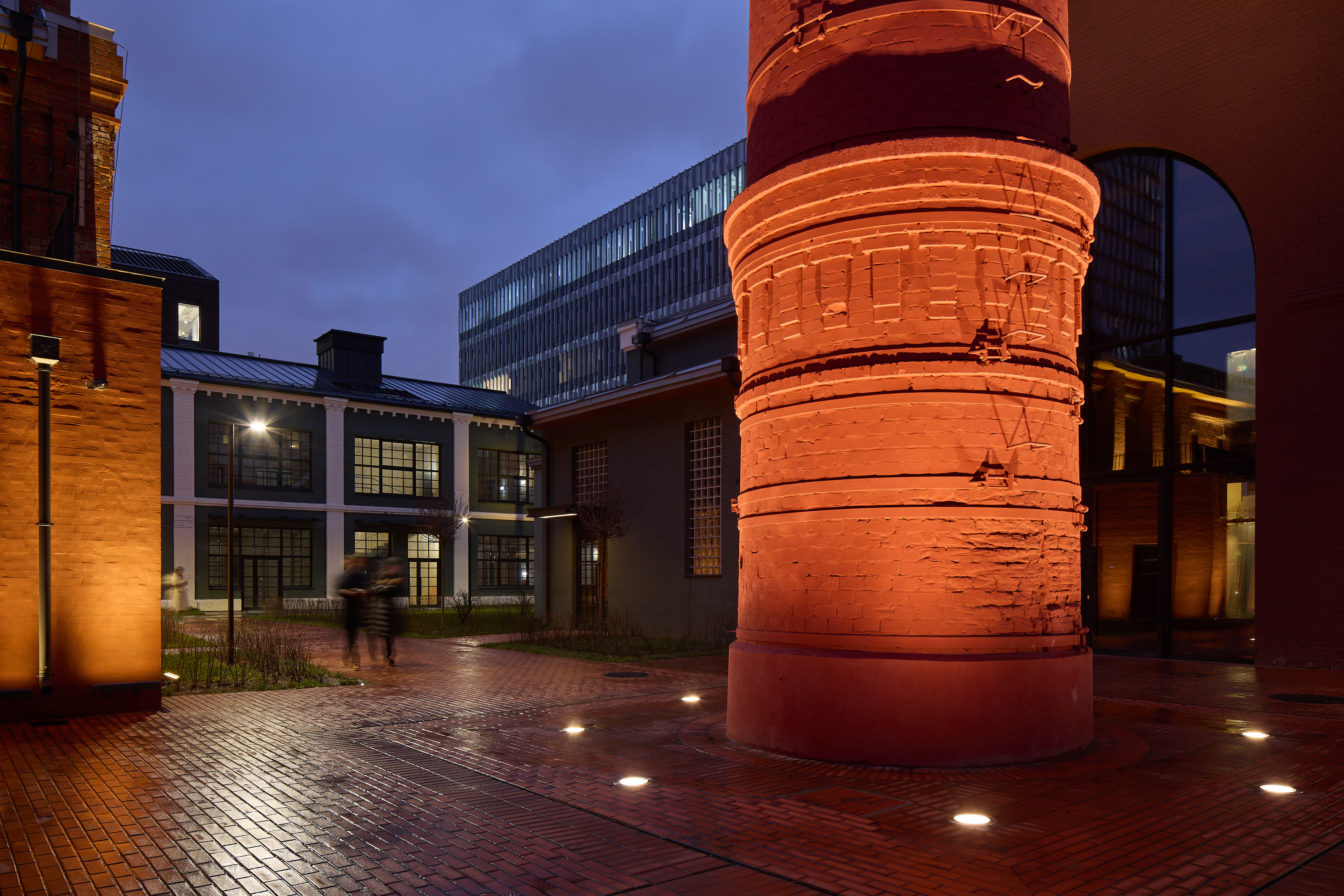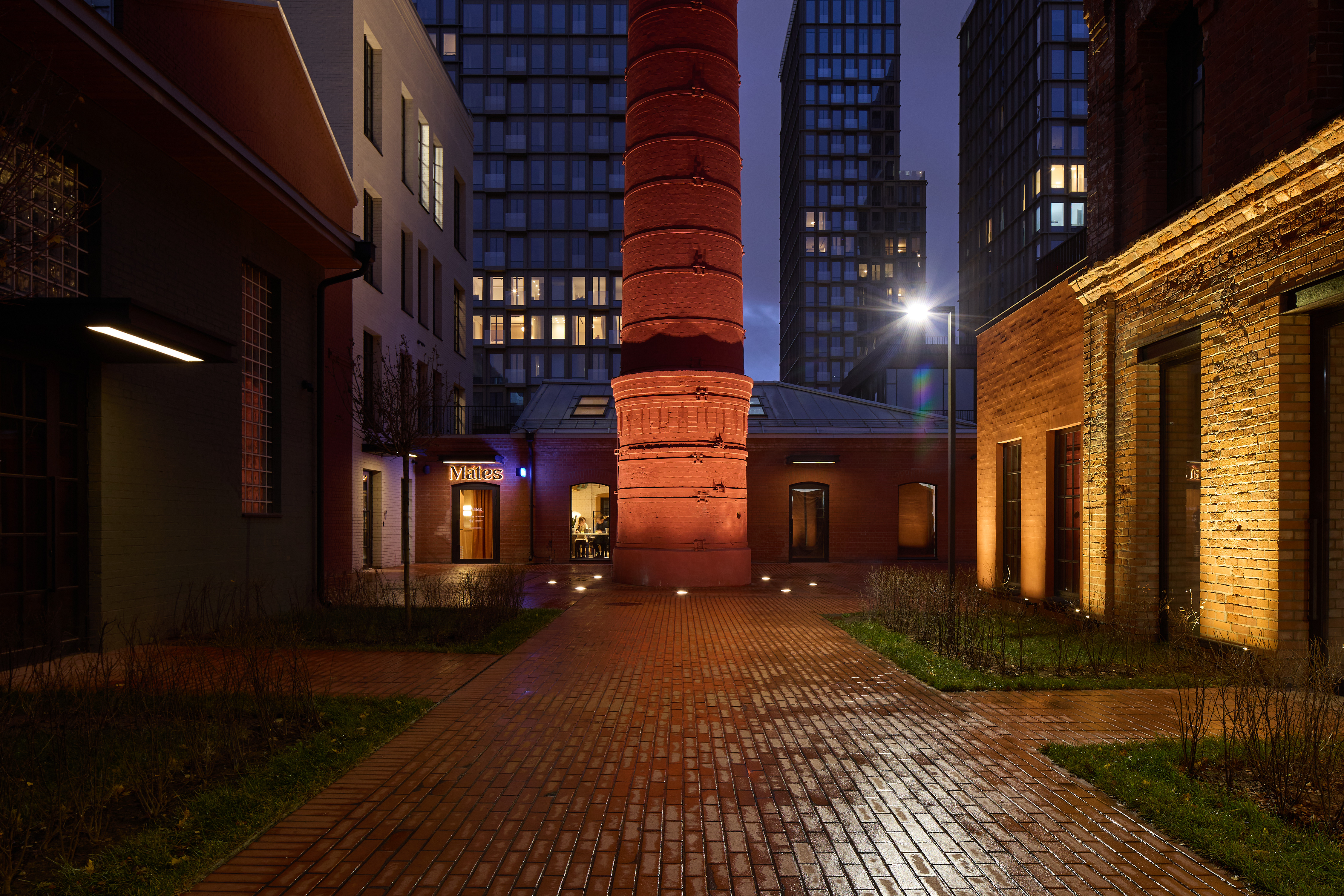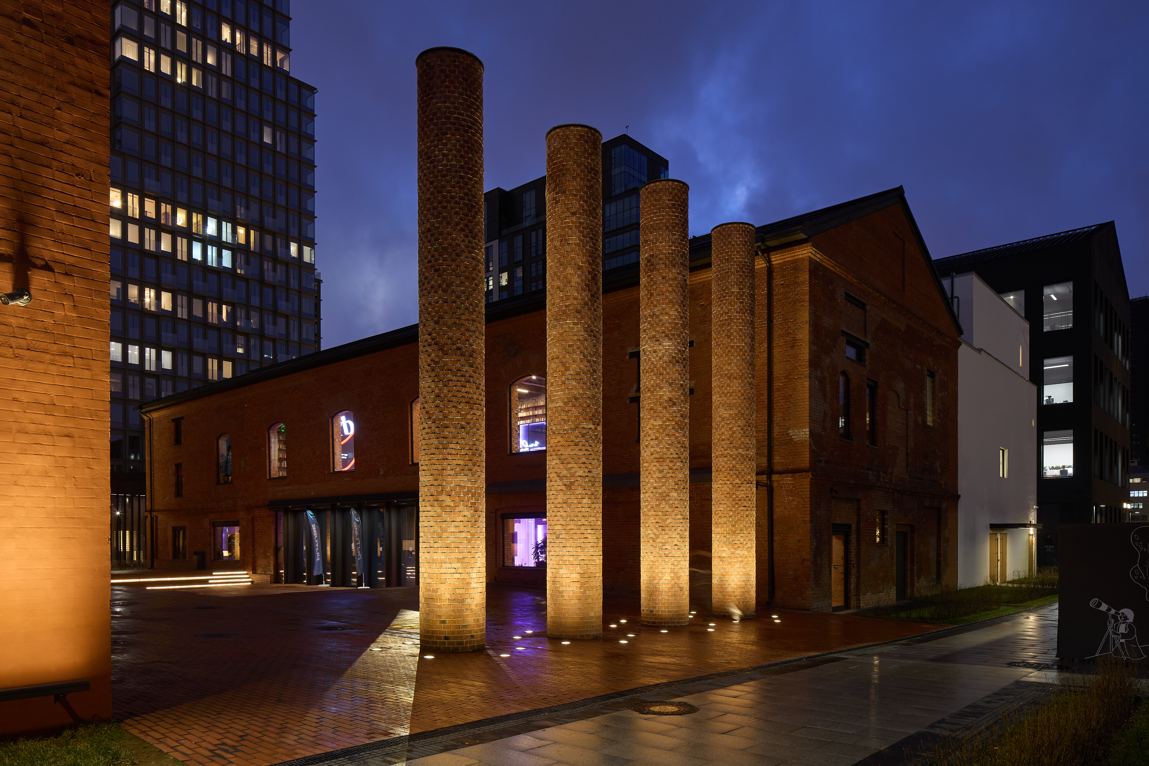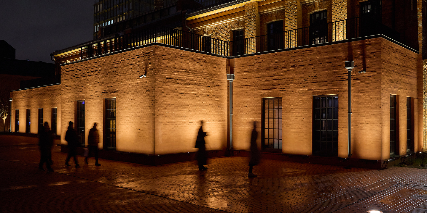 Одним из запоминающихся элементов Lucky стал световой дизайн заводских труб, расположенных на территории квартала. Округлая форма, монолитность сооружения и кирпичная фактура поверхности вступают в диалог со светом. Нам было важно подчеркнуть уникальность нестандартных объектов, доставшихся Lucky в наследство от бывшего лакокрасочного завода. Такое решение создает эффект «маяка» в городской среде. Каждая труба становится не только источником света, но и элементом общего дизайна пространства и точкой притяжения горожан.