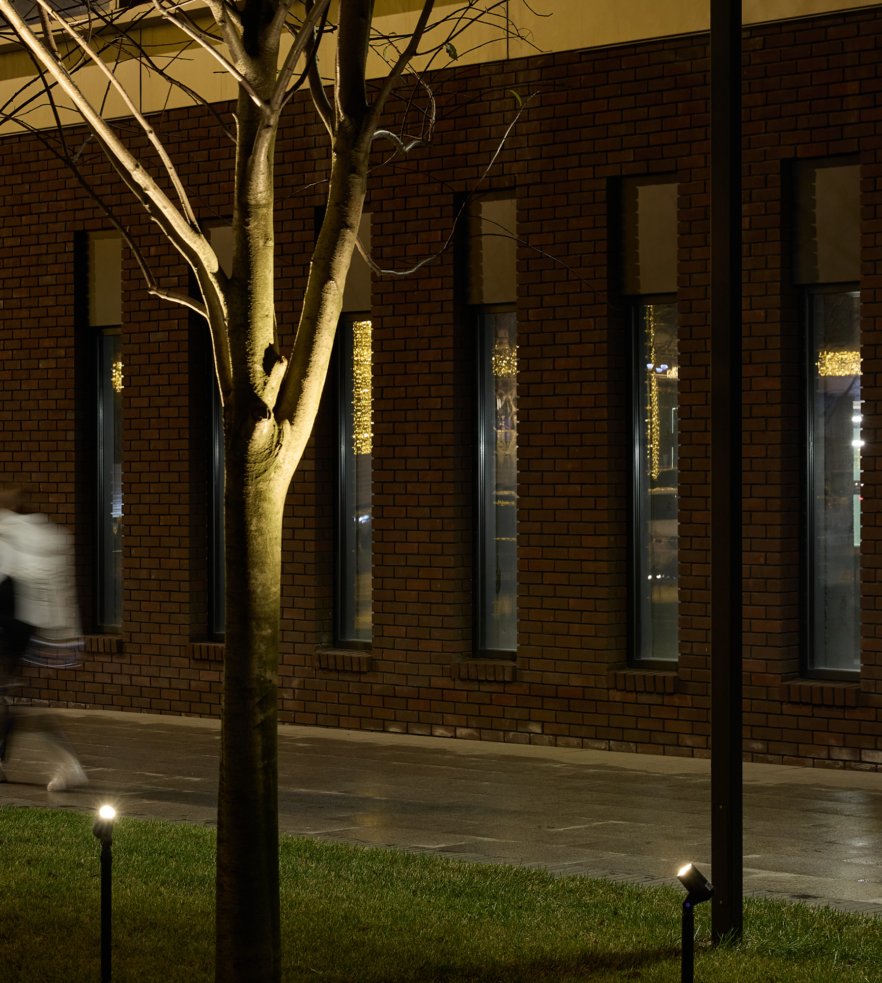 Один из главных ноу-хау проекта – использование фасадного освещения вместо традиционного уличного. Из-за многочисленных сетей и коммуникаций под зданиями на некоторых участках было невозможно установить в грунт опорные конструкции для наружного освещения. Продумав несколько вариантов, нашей команде удалось найти изящное решение. Вместо уличных фонарей мы установили на зданиях светильники, которые освещают фасады снизу, выполняя одновременно две роли: эстетическую и функциональную. Деликатный, скользящий по красному кирпичу свет, создает ощущение мягкости и уюта. Тонкость такого решения кроется в кастомизированных деталях. Например, антибликовые решетки, установленные в светильники, были специально напечатаны на 3D-принтере, чтобы результат соответствовал задуманной концепции. Сами светильники – авторская разработка нашей компании. Глубокое понимание нюансов устройства и работы светильника позволило найти самое удачное и комфортное решение для проекта. Жители и посетители квартала чувствуют себя комфортно и безопасно, прогуливаясь по территории квартала без единого уличного фонаря.