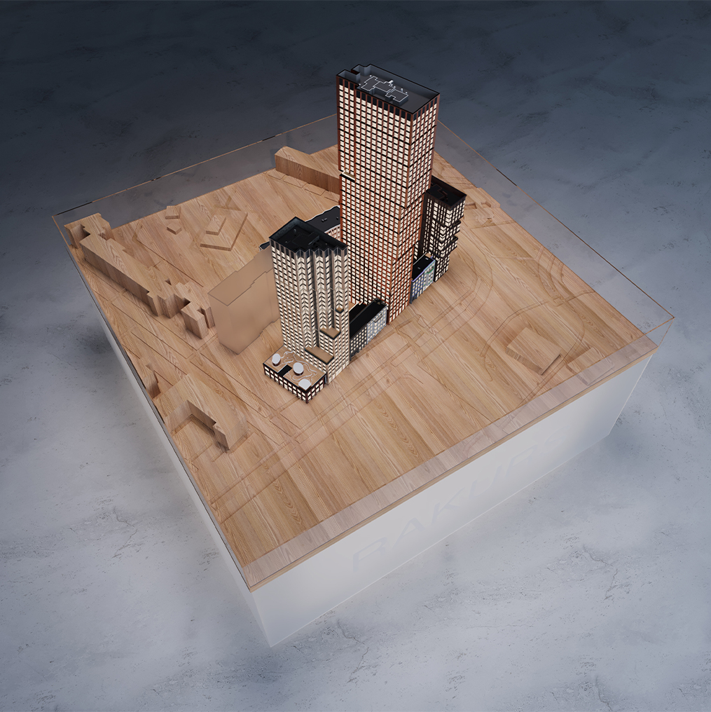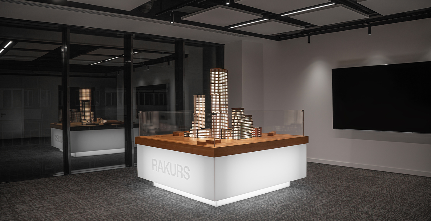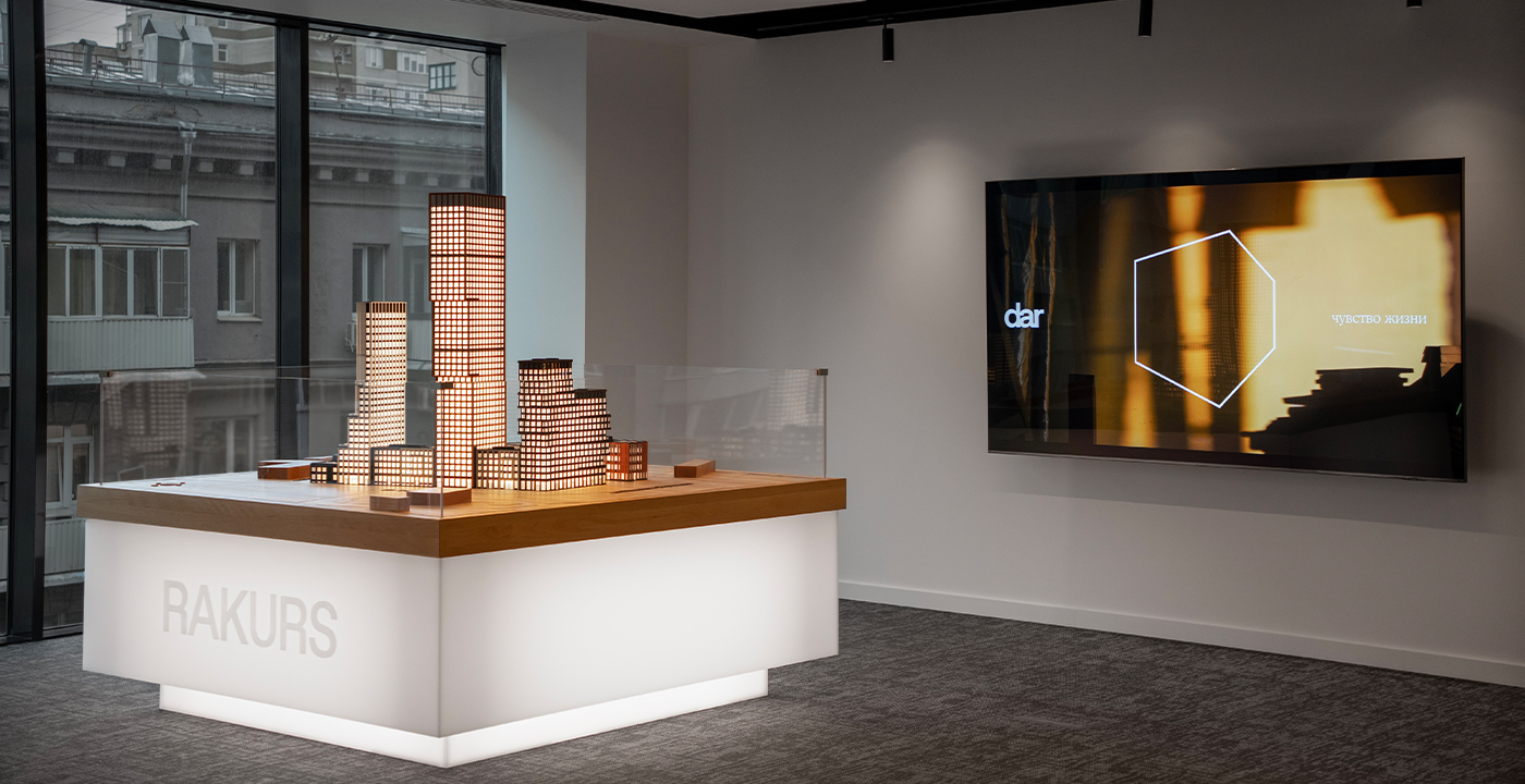 Макет жилого комплекса «Ракурс» для девелоперской компании Dar стал удачным экспериментом по созданию высоко детализированного макета с упрощенным окружением и концептуальной подачей. Такой подход позволил акцентировать внимание на архитектуре комплекса, сделав ее центральным элементом экспозиции.