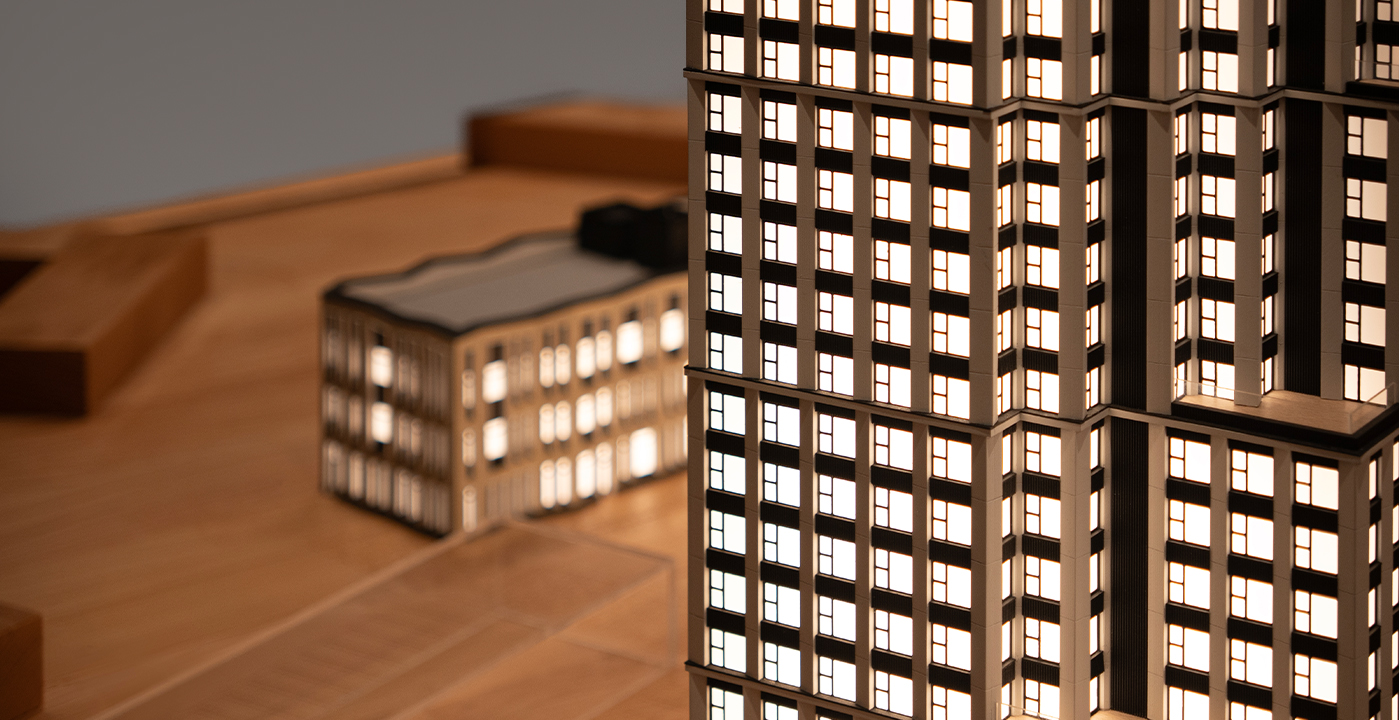 Основной задачей было создание нетипичного макета для офиса продаж, сочетающий минимализм трактовки окружающей среды и высокую детализацию самого здания. Мы сознательно отказались от отвлекающих элементов – деревьев, людей, транспорта, сосредоточив внимание исключительно на архитектуре. Фоном для комплекса стал массив бука, который благодаря своей теплой текстуре добавил элегантности композиции. Макет был установлен на простой светящейся тумбе из сатина, которая усилила чистые современные решения всего объекта.