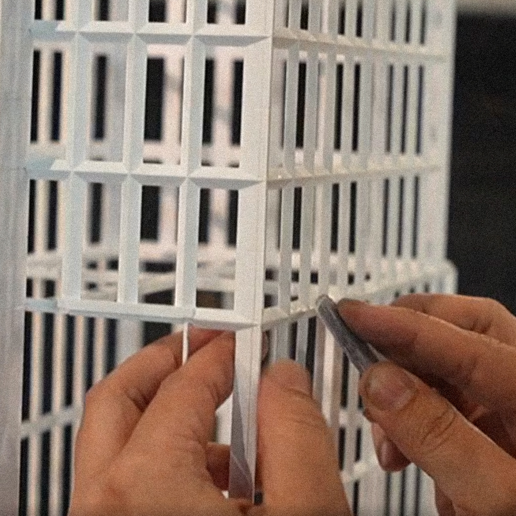Следующим шагом стало проектирование всех деталей макета. На данном этапе мы проработали точную раскройку всех элементов от фасадов зданий до мелких архитектурных деталей. Важно было учесть, как все элементы будут собираться, чтобы не только макет выглядел безупречно, но и процесс сборки был удобным и точным.