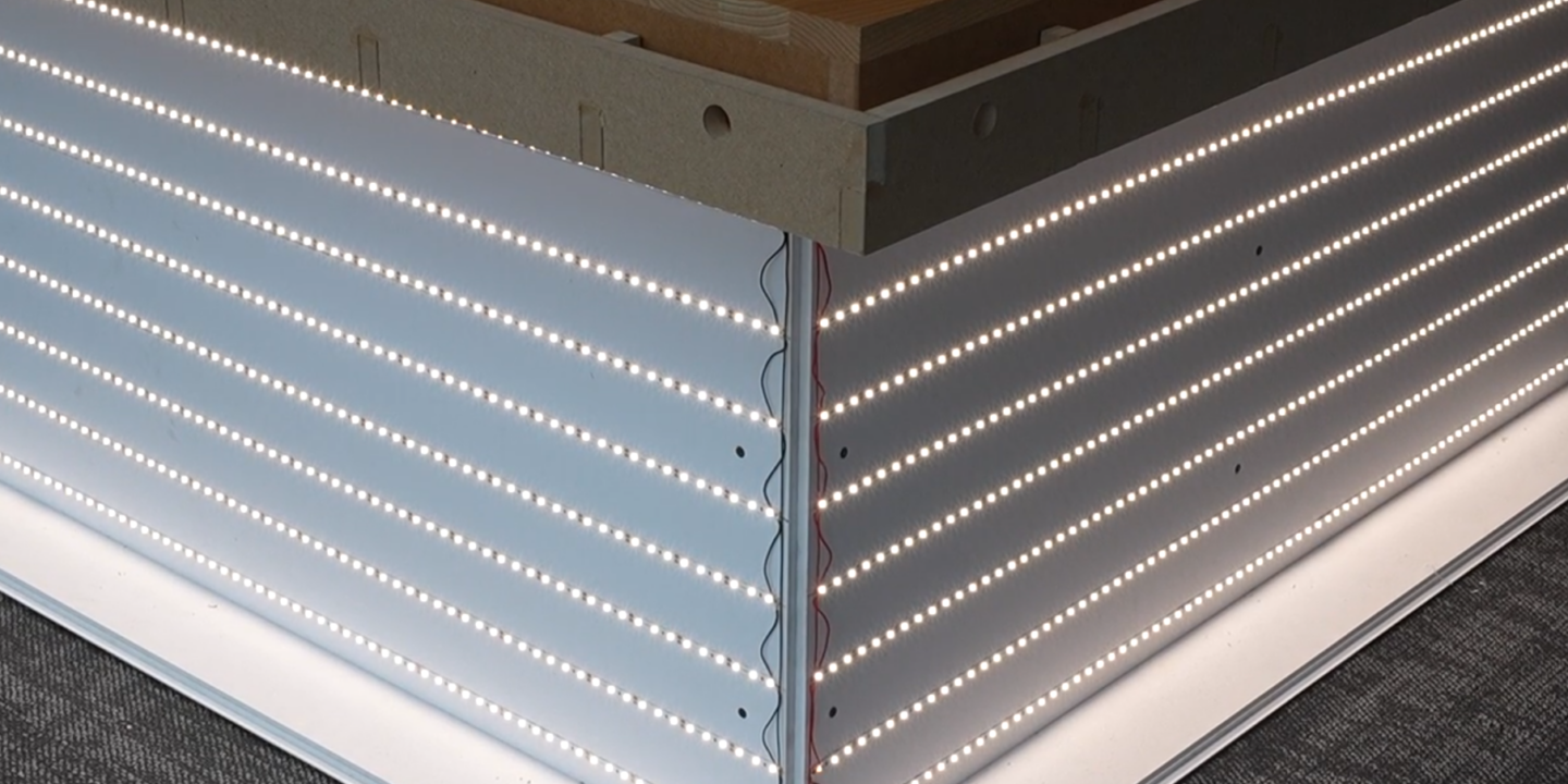 Светящиеся элементы – это большая часть макета и отдельная работа электриков. Для равномерного и мягкого освещения мы использовали лайтбоксы внутри зданий.