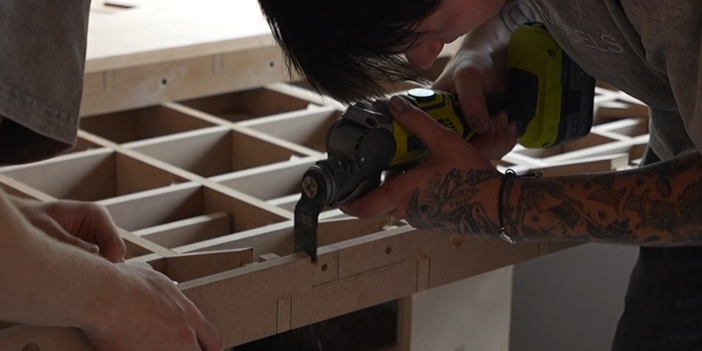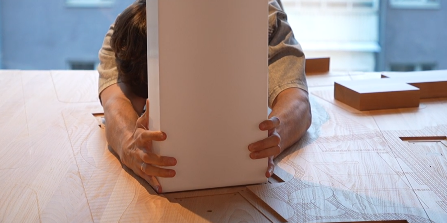 После того, как все детали были готовы, мы приступили к монтажу. Установили в офисе продаж каркас, собрали тумбу, провели в ней электрику и установили сверху деревянное основание. Сначала устанавливаются лайтбоксы, затем на них сверху «надевается» здание корпус за корпусом. В финале – крыши, козырьки и другие хрупкие элементы.