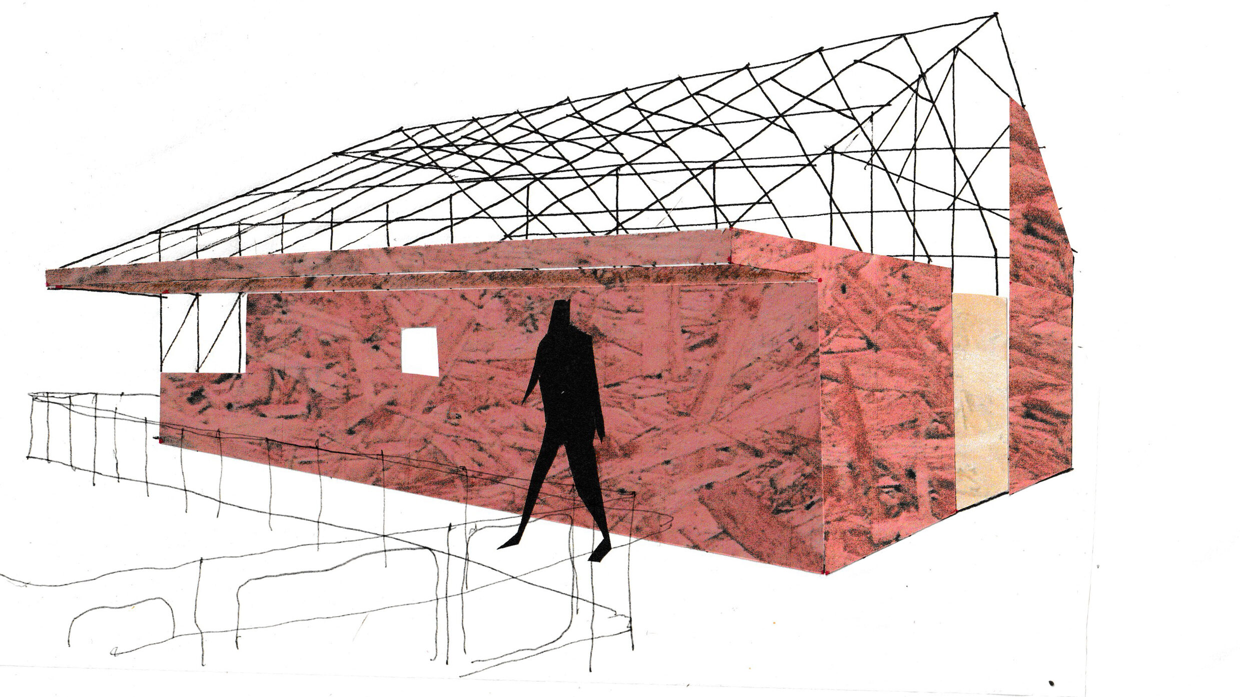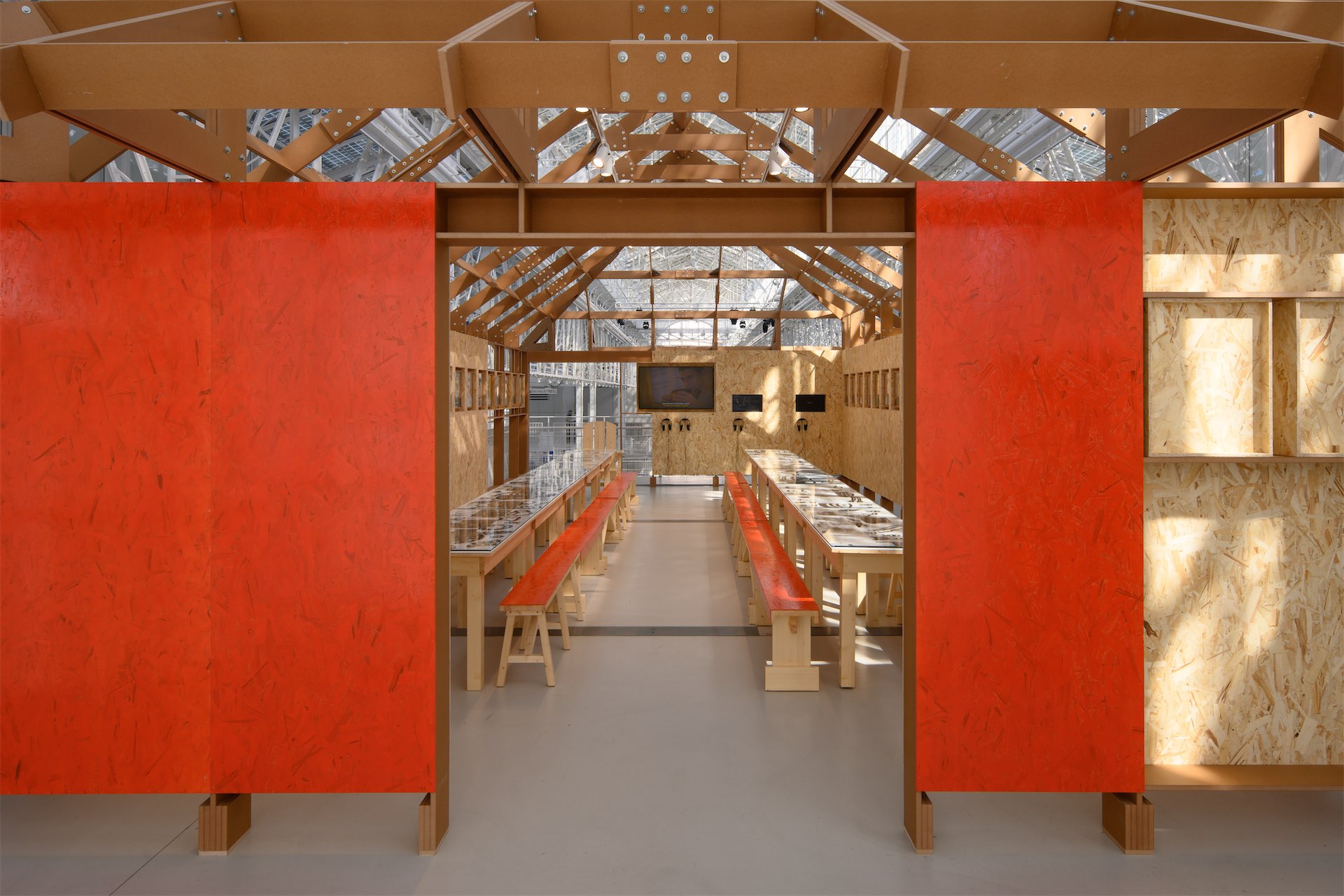 Выбор материалов и конструктивного принципа напрямую связан с тем, что мы увидели в Осетии. Основной материал — ориентированно-стружечная плита (ОСБ), часто используемая в хадзарах. Это доступный материал с выразительной фактурой. Важным акцентом стал ОСБ, покрытый ярким красным цветом и слоями глянцевого лака — прием, подсмотренный в одном из дворов.