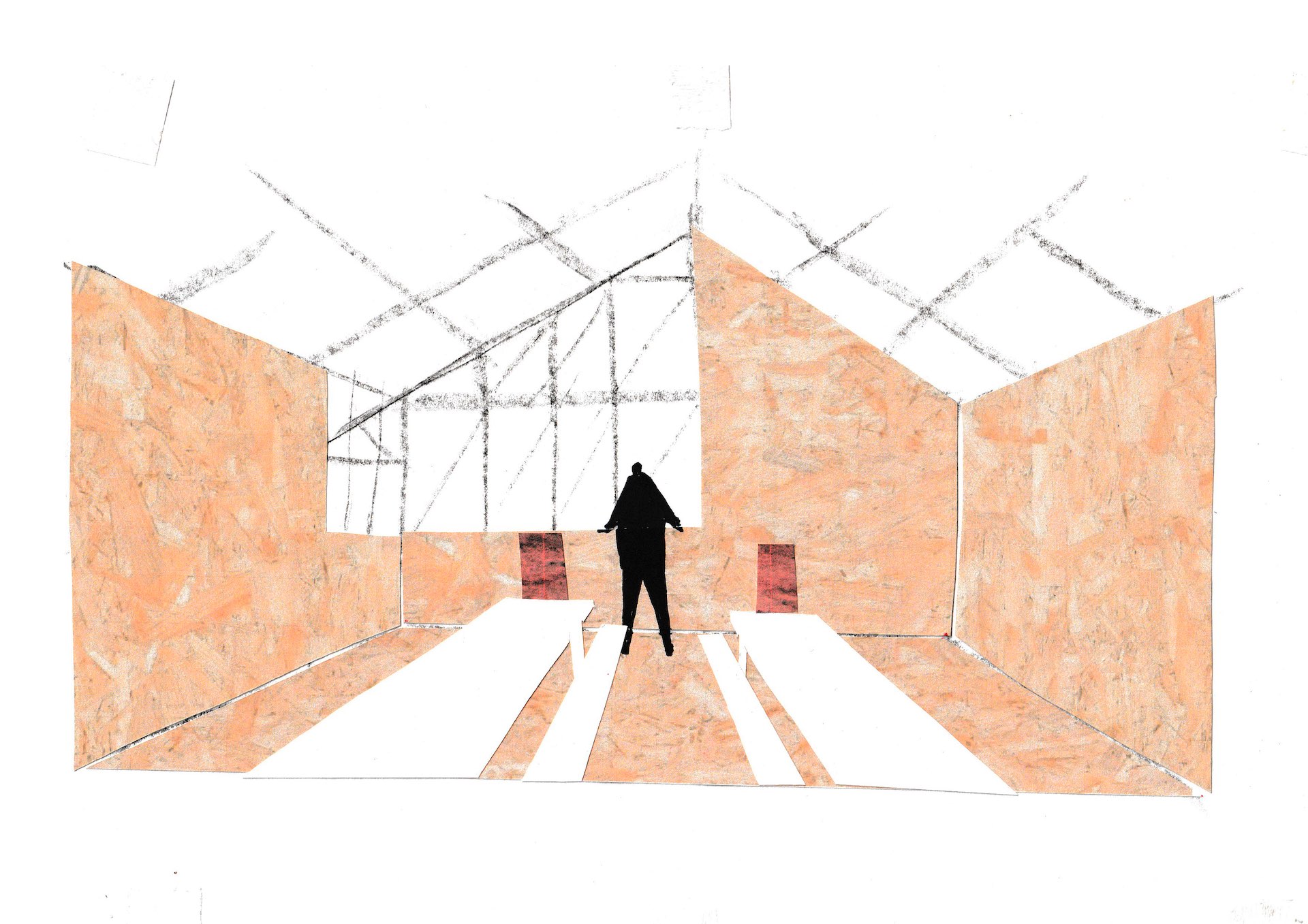 У нас сформировались три принципа работы с материалом и пространством. Первый — это мокап: воспроизведение отдельных элементов, увиденных на месте, но не буквальное копирование. Поэтому мы используем плоские, «нарезанные» материалы — в нашем случае МДФ, — которые подчеркивают условность, «картонность» и позволяют сохранить дистанцию по отношению к реальному объекту.