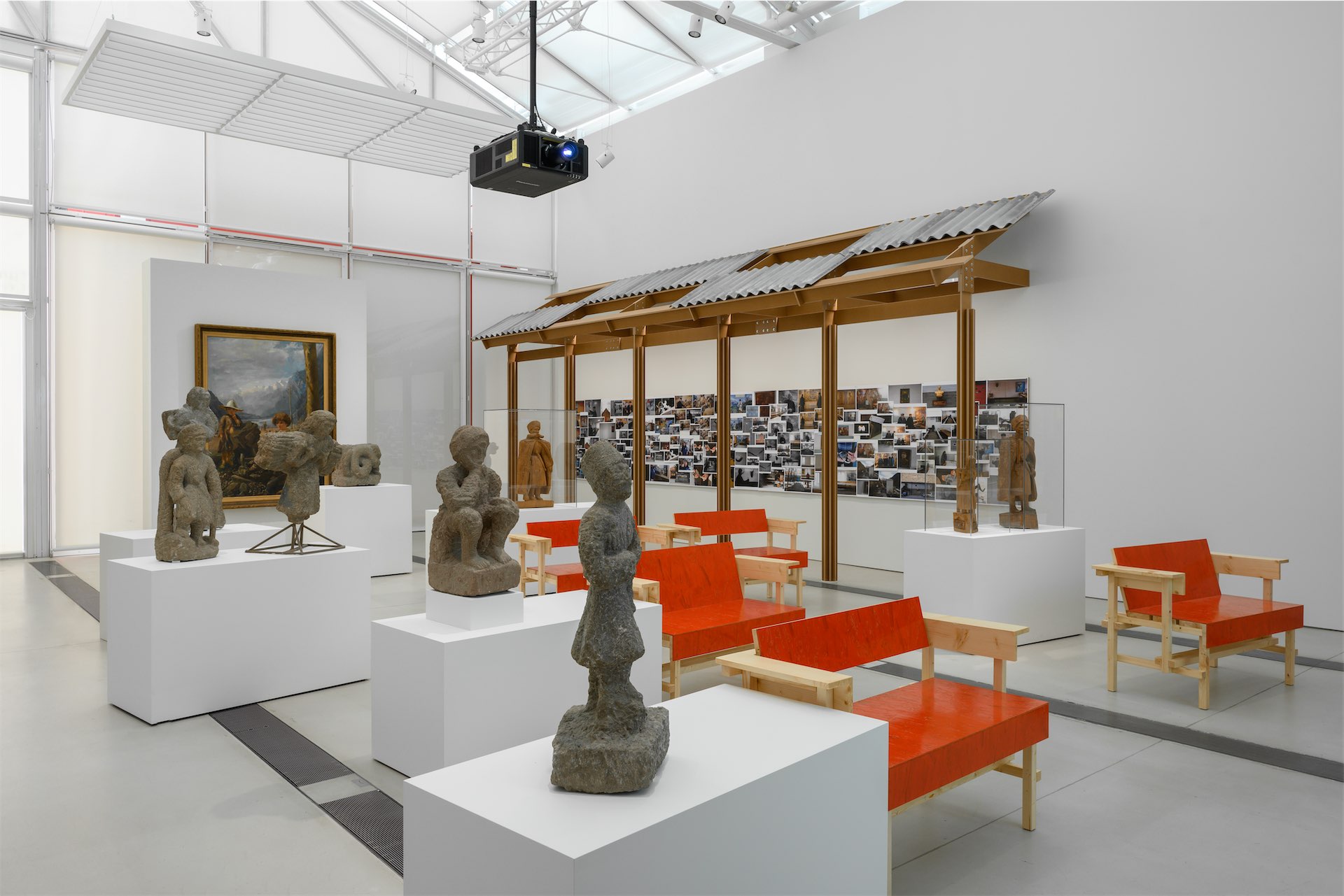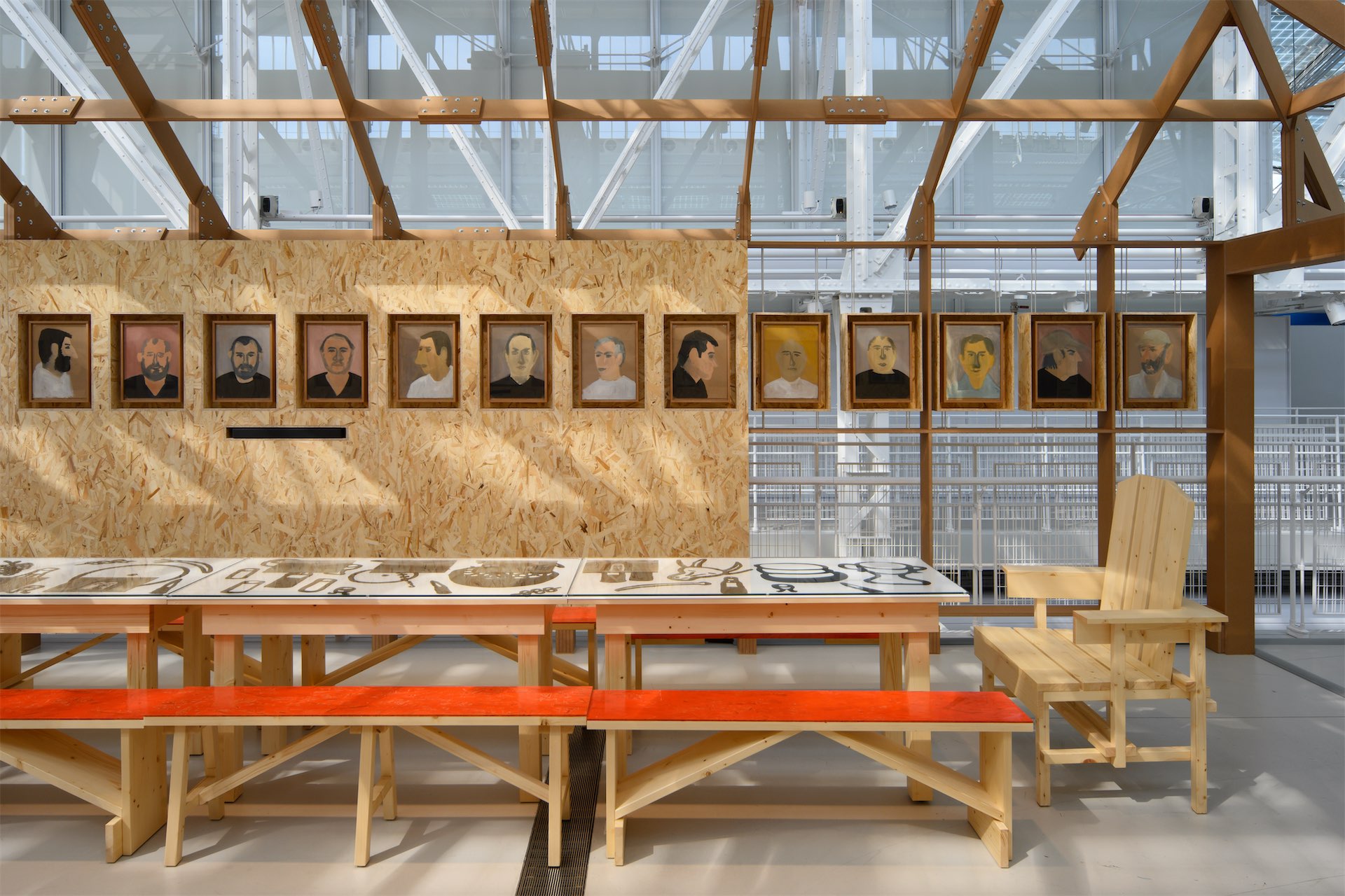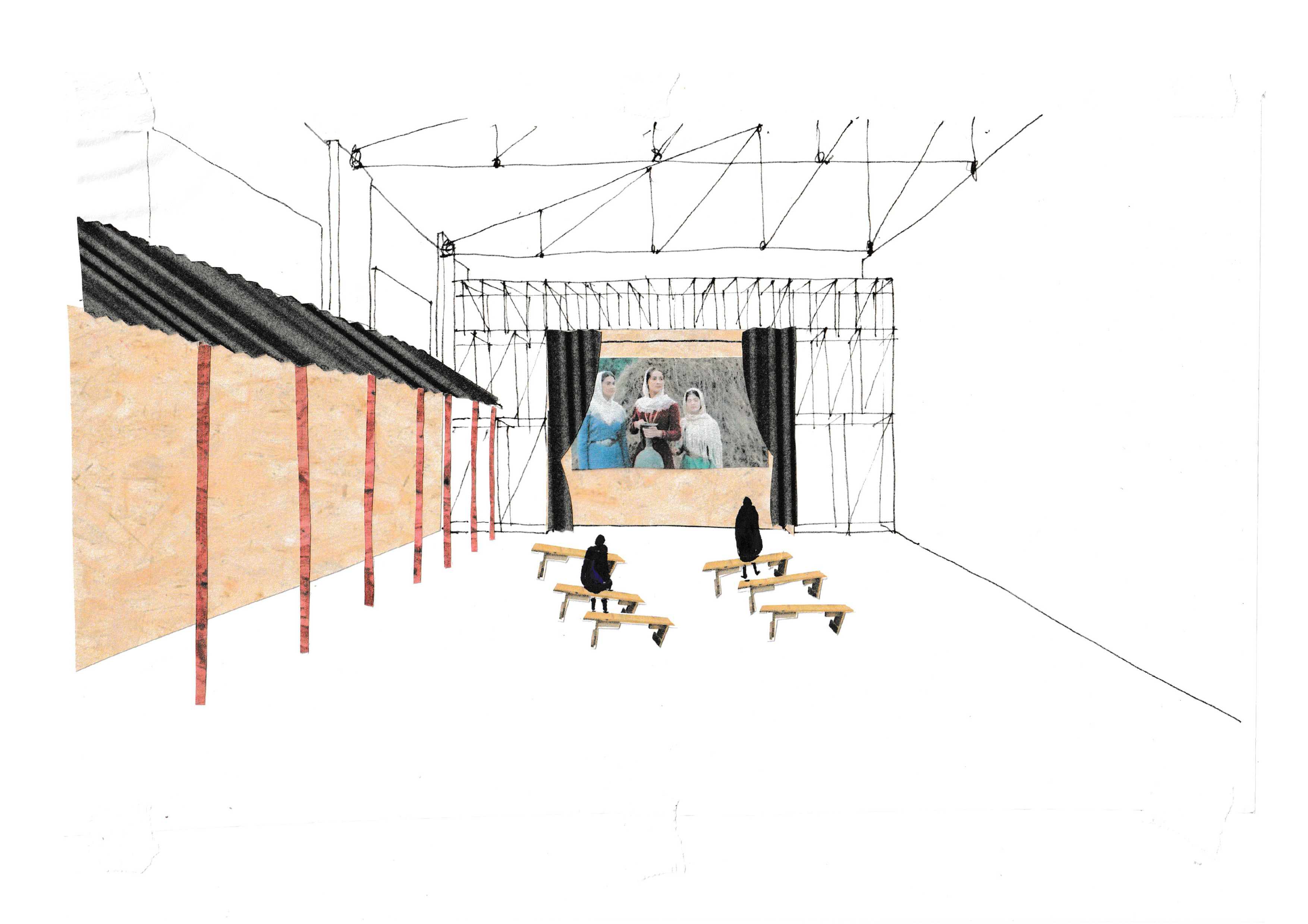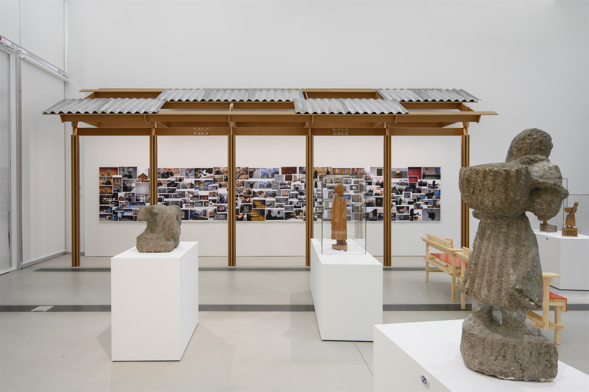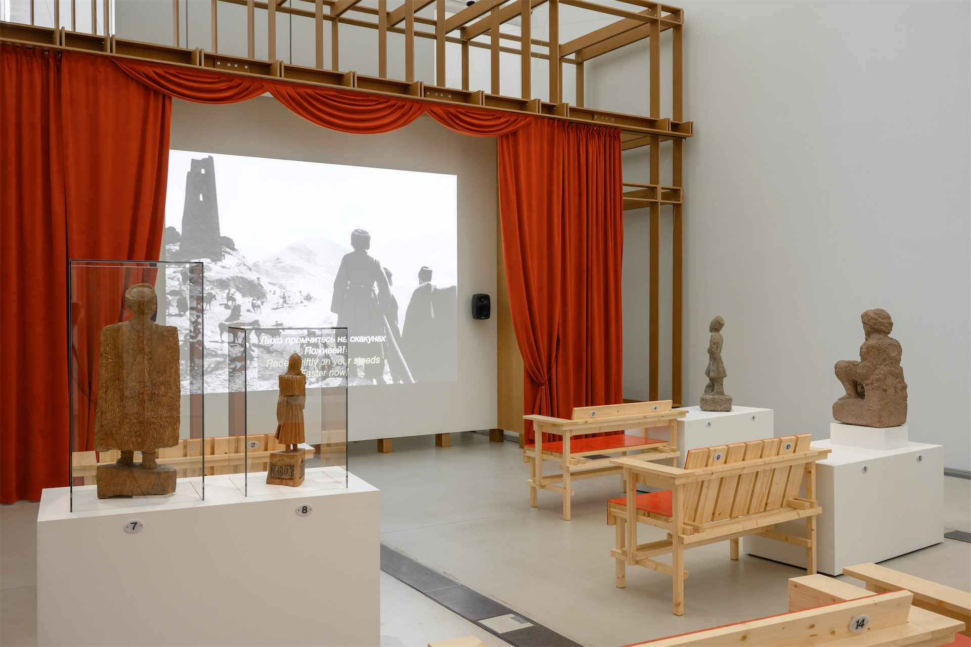 С другой — навес из шифера, под которым проходит жизнь во дворе. Скамьи кинозала — это интерпретация самодельной дворовой мебели, которая за счет цвета и положения обретает торжественность. Третий элемент коллажа — постаменты со скульптурами, которые встраиваются в ряды с пронумерованными местами, становясь вместе с посетителями зрителями киноэкрана.