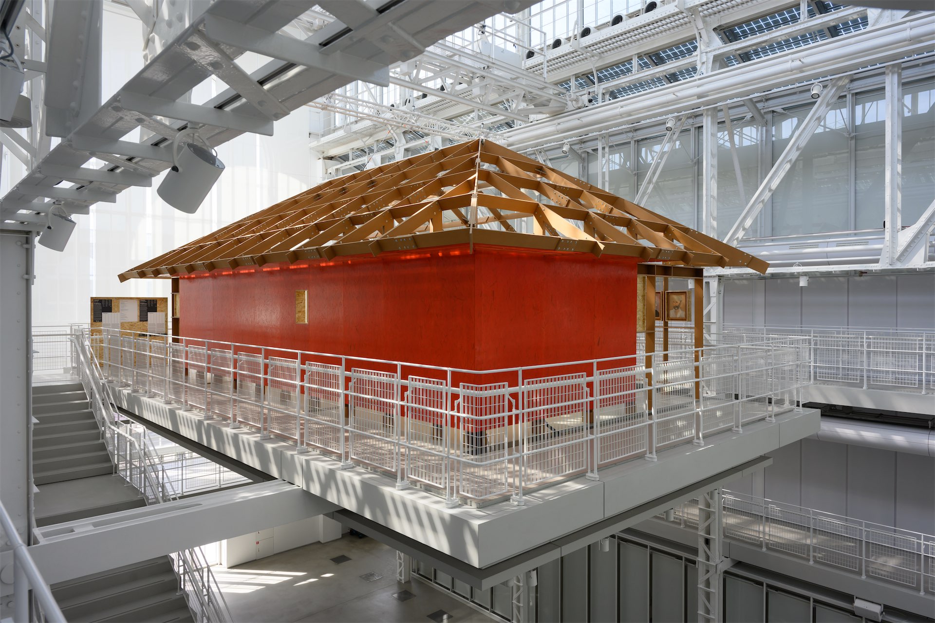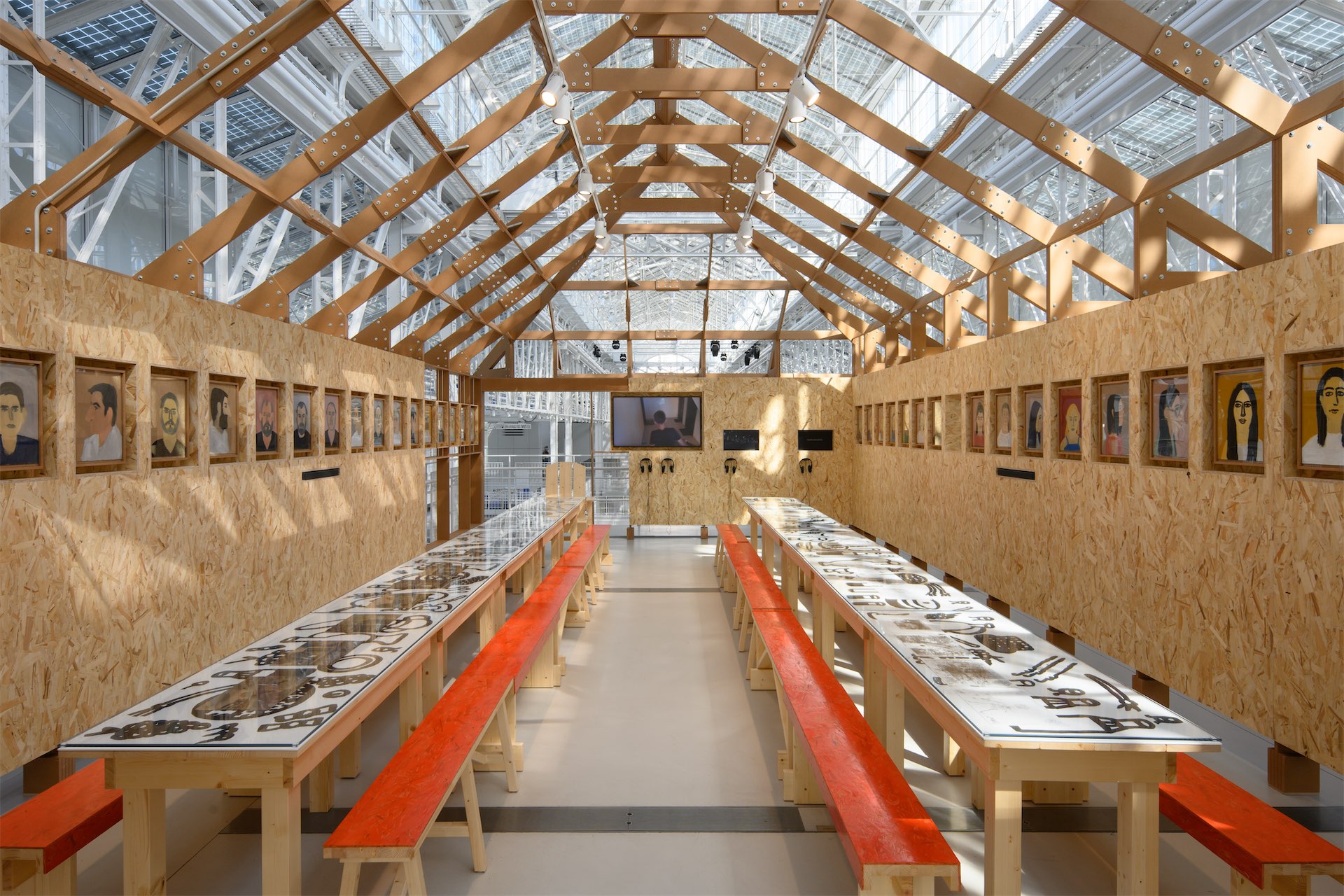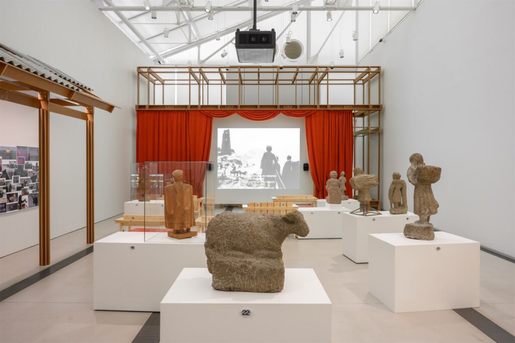 Третий принцип — незавершенность. Хадзар как социальное пространство всегда находится в процессе, и это состояние перенесено на выставку через каркасность, открытые элементы, балки, стойки и ощущение, что структура может продолжаться и меняться.