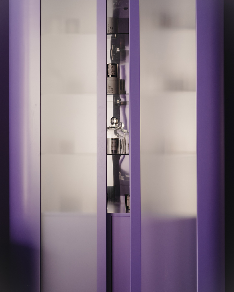 Акцентным элементом интерьера стал шкаф в углу. Подобно серванту, он хранит в себе все самое ценное и увлекательное, приглашая посетителей к исследованию и погружению в мир тонких ароматов. Шкаф таит свои секреты: размывающие силуэты стекла создают загадочную атмосферу, а встроенные зеркала по периметру создают эффект бесконечности.