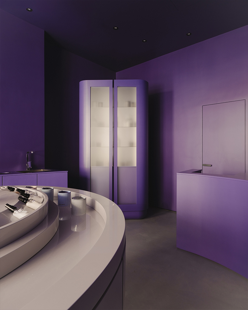 Пространство бутика представляет собой камерное, уютное помещение с обволакивающими округлыми формами. Массивные элементы мебели задают траекторию движения, создавая ощущение непрерывности и позволяя посетителям неспешно исследовать пространство. Основной цвет интерьера — глубокий оттенок Future Dusk на грани дня и ночи, вдохновленный вечерним небом Санкт-Петербурга. Этот баланс яркости и спокойствия одновременно отсылает к дуальности бренда, сочетающего контрастные элементы.