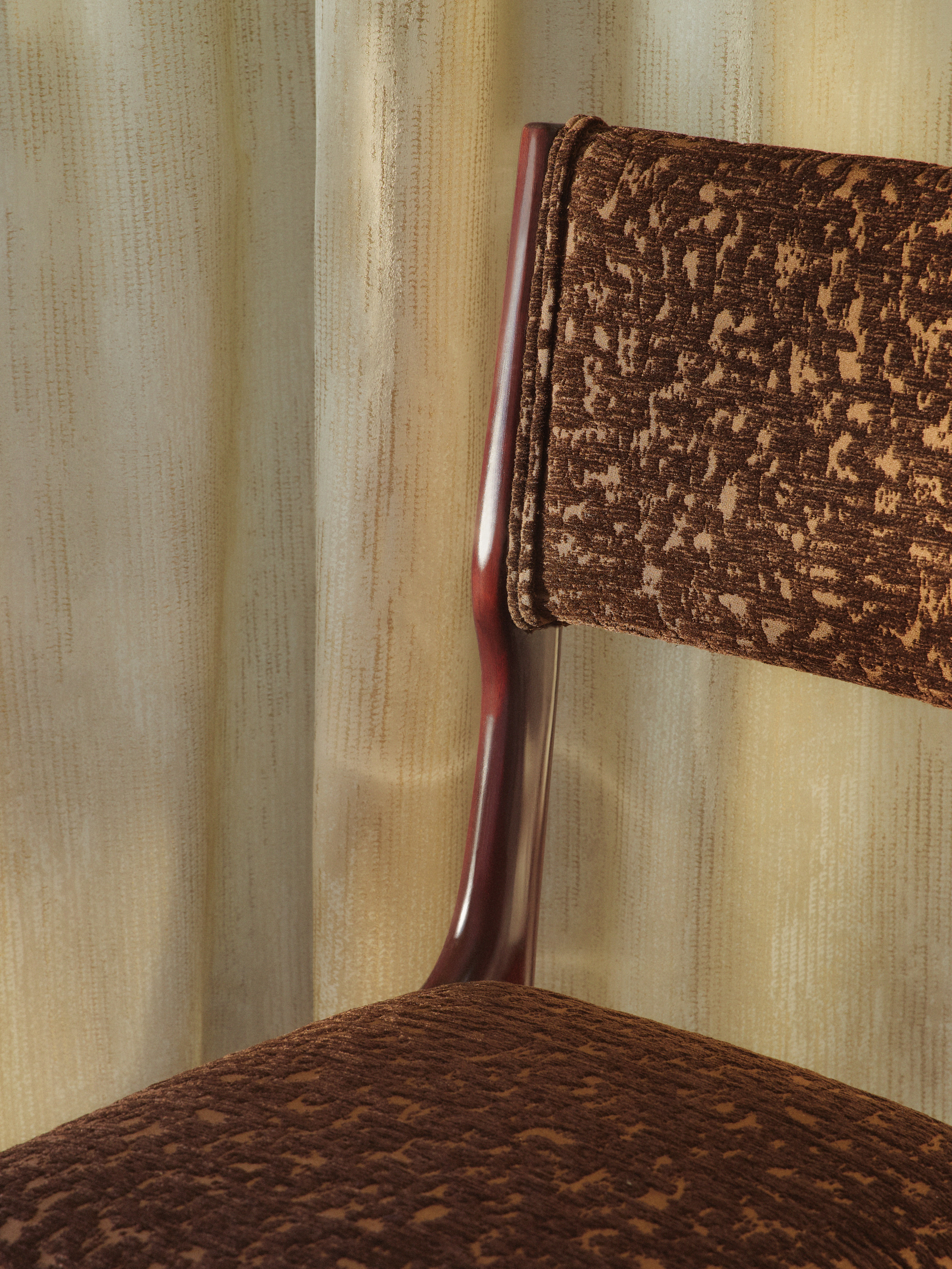 Ткани коллекции задуманы как инструменты работы со светом. Плотность переплетений, структура нитей, сочетания материалов напрямую влияют на то, как пространство «звучит» в течение дня. Именно из этого наблюдения рождается ощущение глубины цвета, который не лежит на поверхности, а словно формируется изнутри.