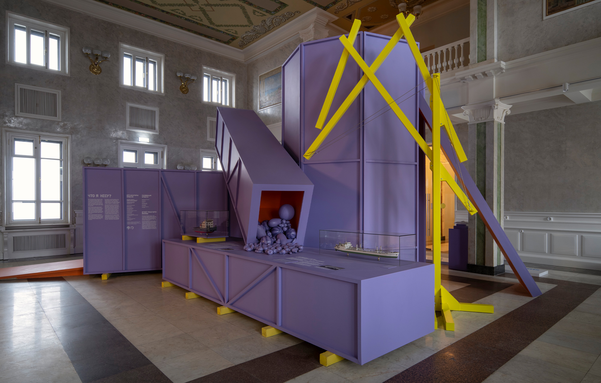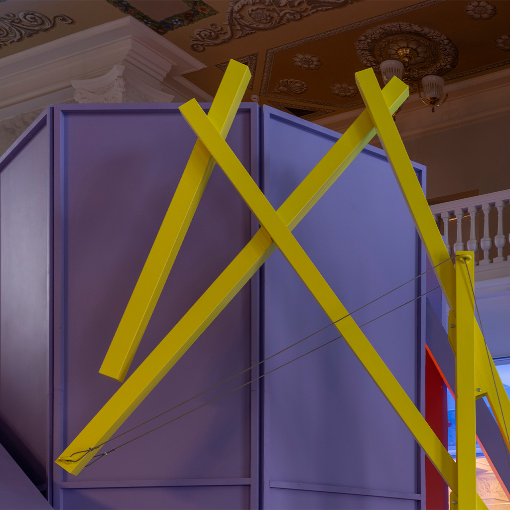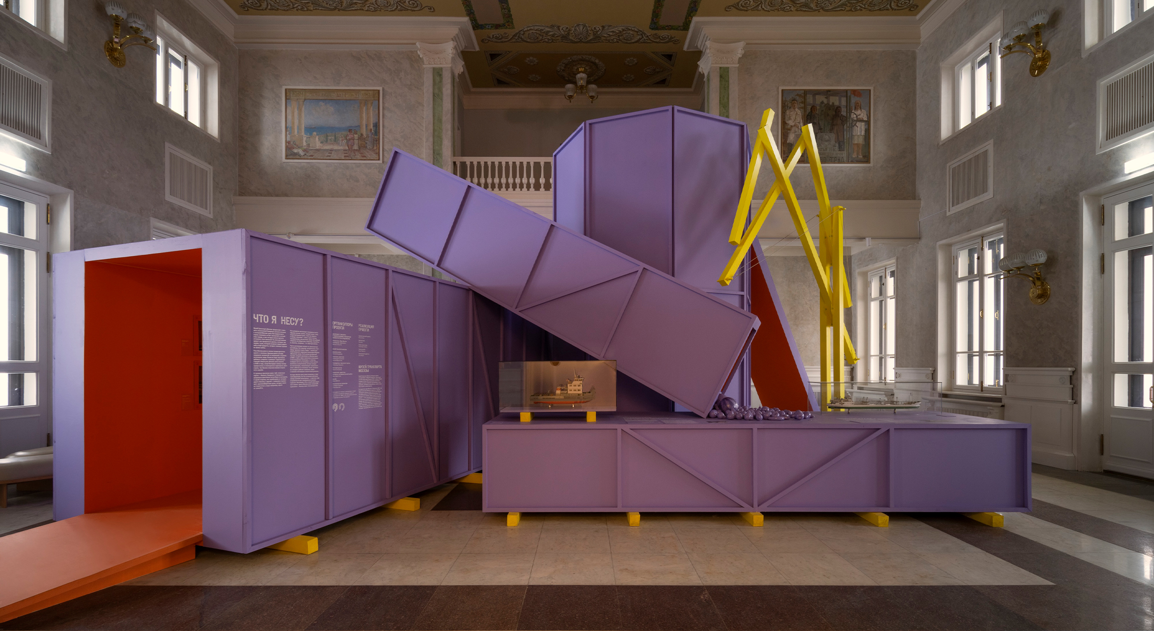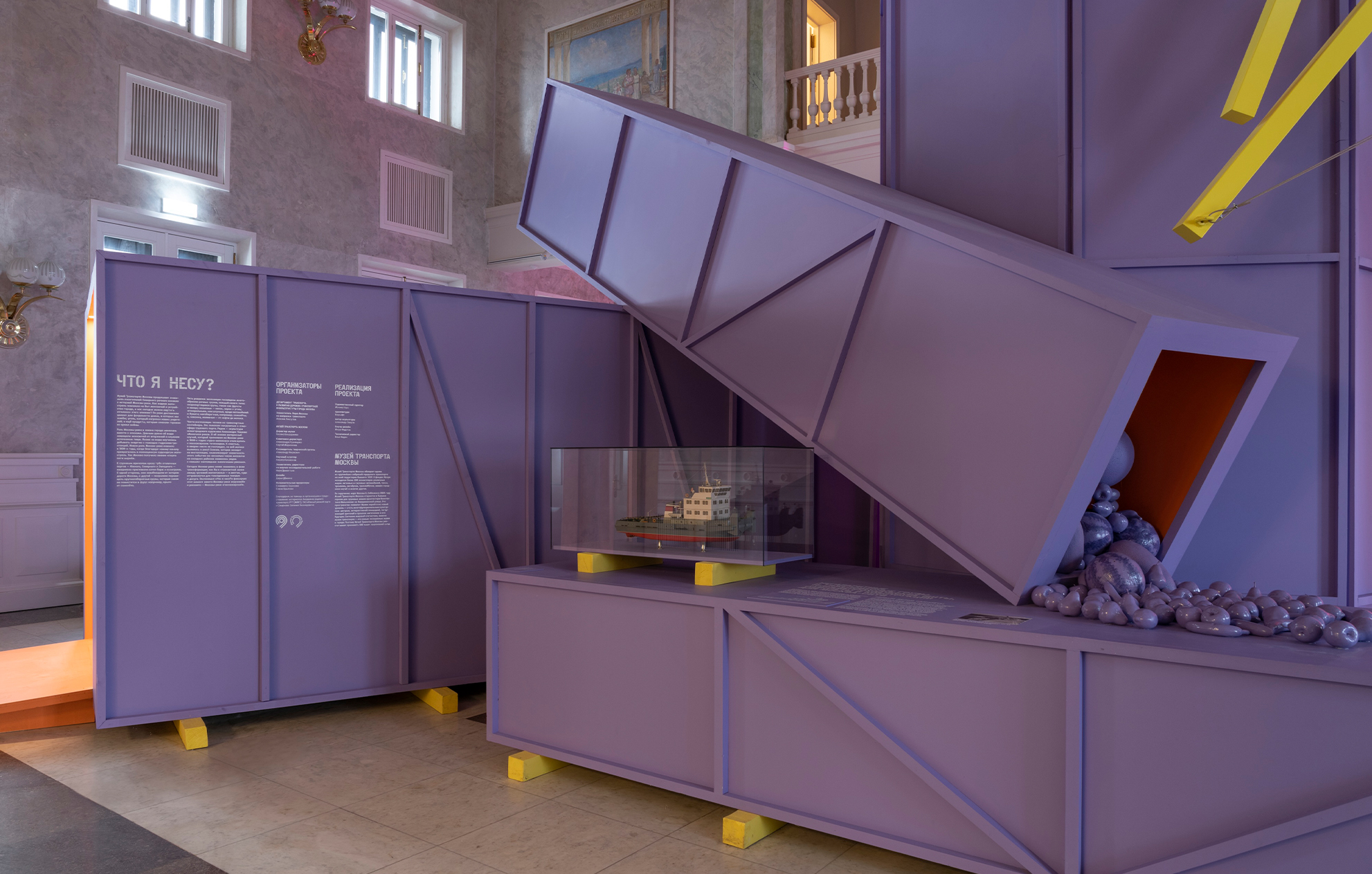 «Работа над экспозицией в Северном речном вокзале стала для нас интересным вызовом. Нам предстояло вписать абстрактные объёмы экспозиции в классическое пространство зала, сохранив баланс между современным языком и историческим контекстом. Отдельной сложностью стала колористика: зелёные оттенки зала буквально поглощали цвета объектов, и нам пришлось несколько раз подбирать палитру, чтобы добиться нужного эффекта. В итоге мы обратились к конструктивистским цветовым решениям, вдохновившись работами художника Михаила Матюшина.