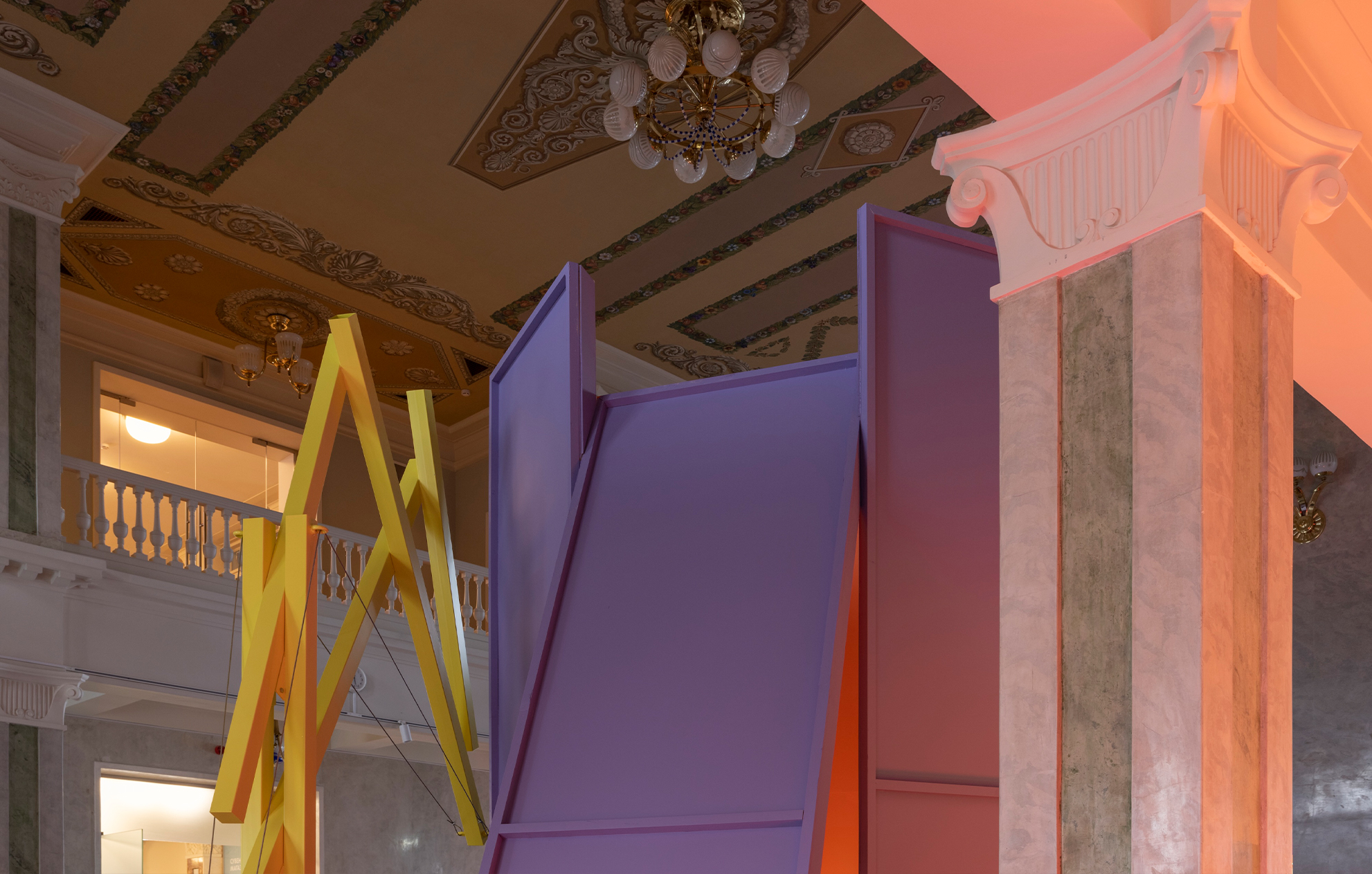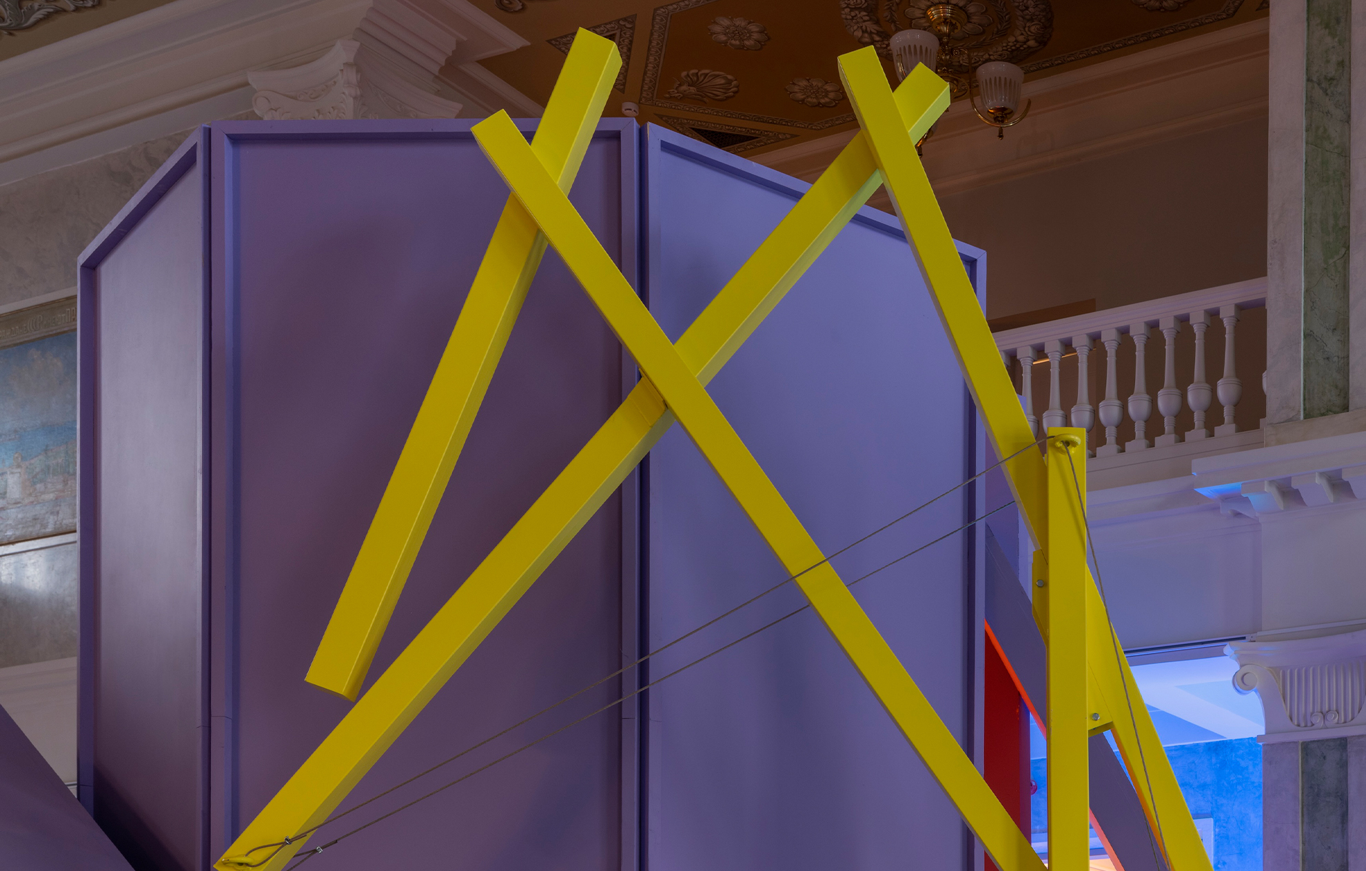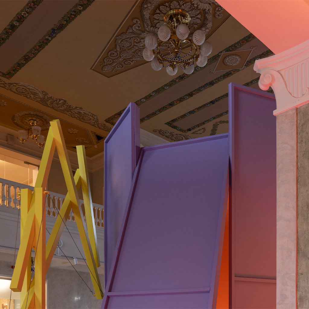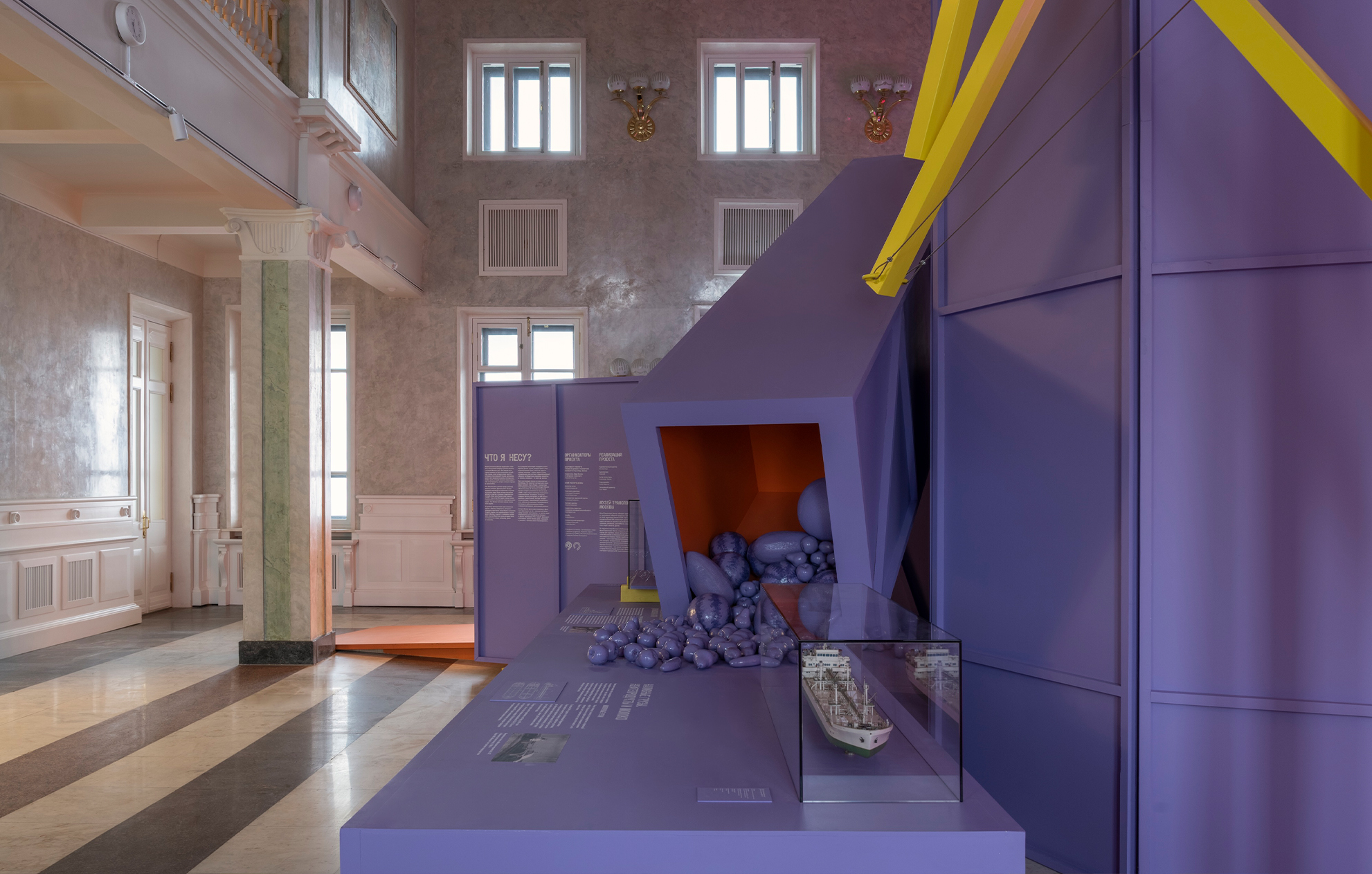 «Работа над экспозицией в Северном речном вокзале стала для нас интересным вызовом. Нам предстояло вписать абстрактные объёмы экспозиции в классическое пространство зала, сохранив баланс между современным языком и историческим контекстом. Отдельной сложностью стала колористика: зелёные оттенки зала буквально поглощали цвета объектов, и нам пришлось несколько раз подбирать палитру, чтобы добиться нужного эффекта. В итоге мы обратились к конструктивистским цветовым решениям, вдохновившись работами художника Михаила Матюшина.