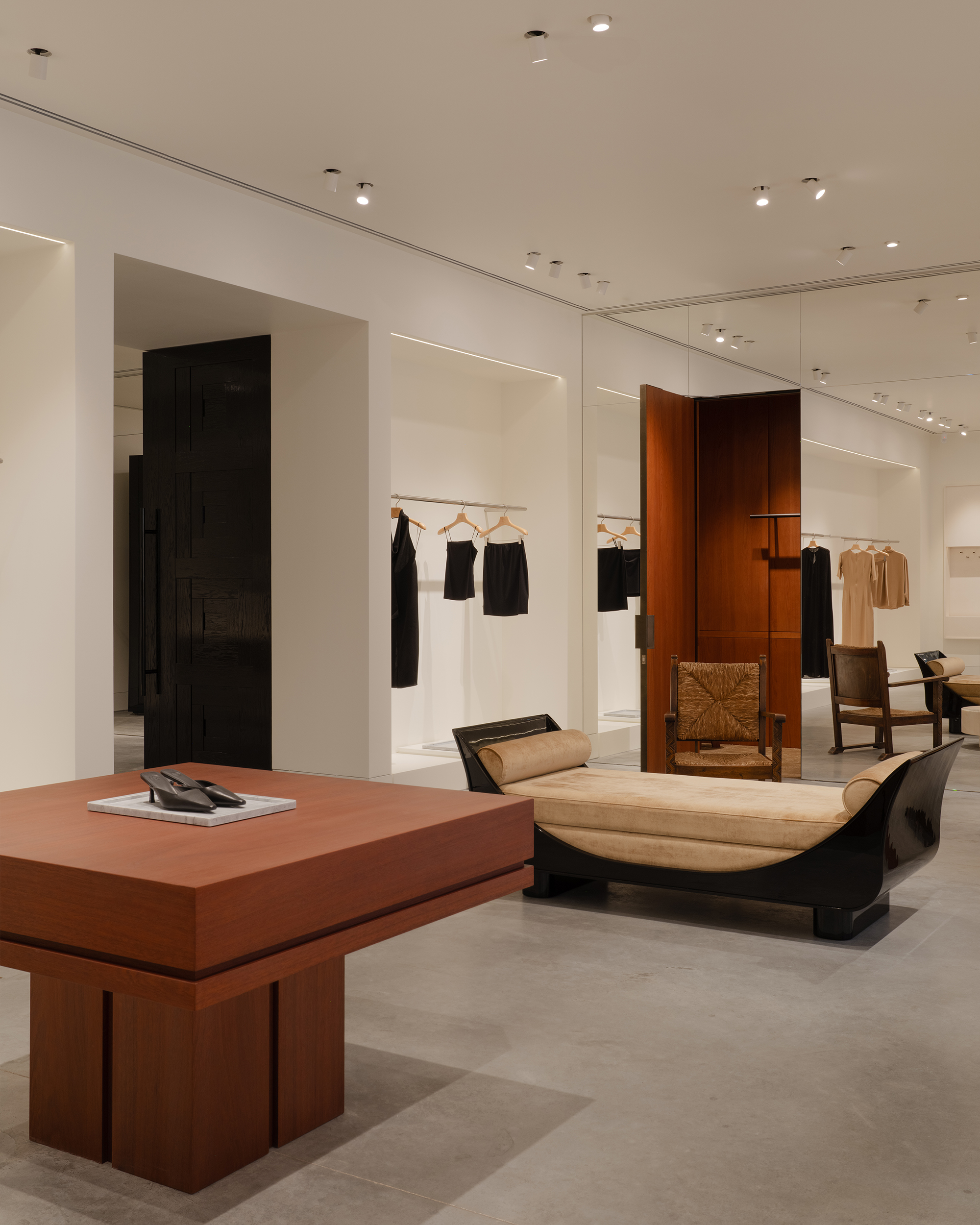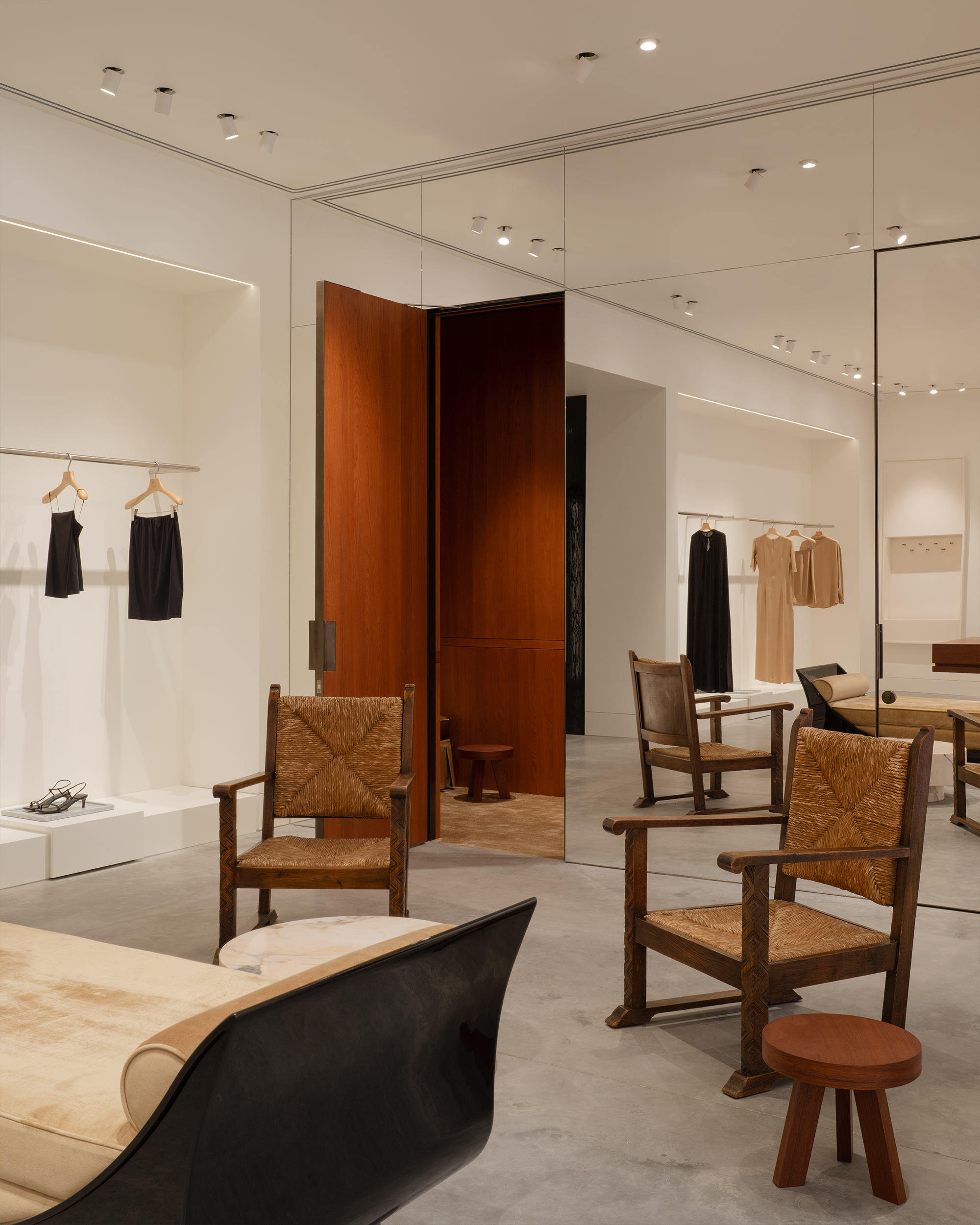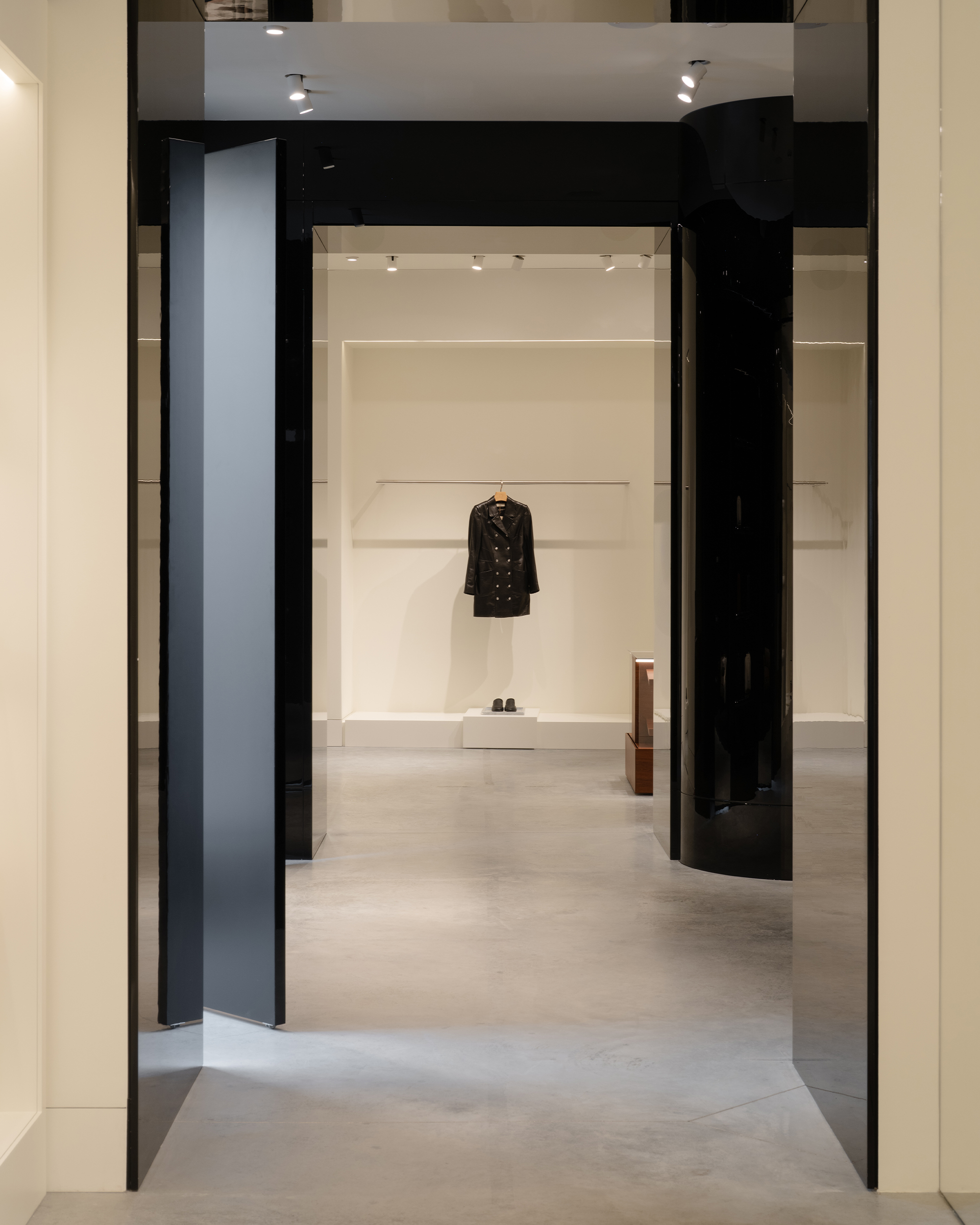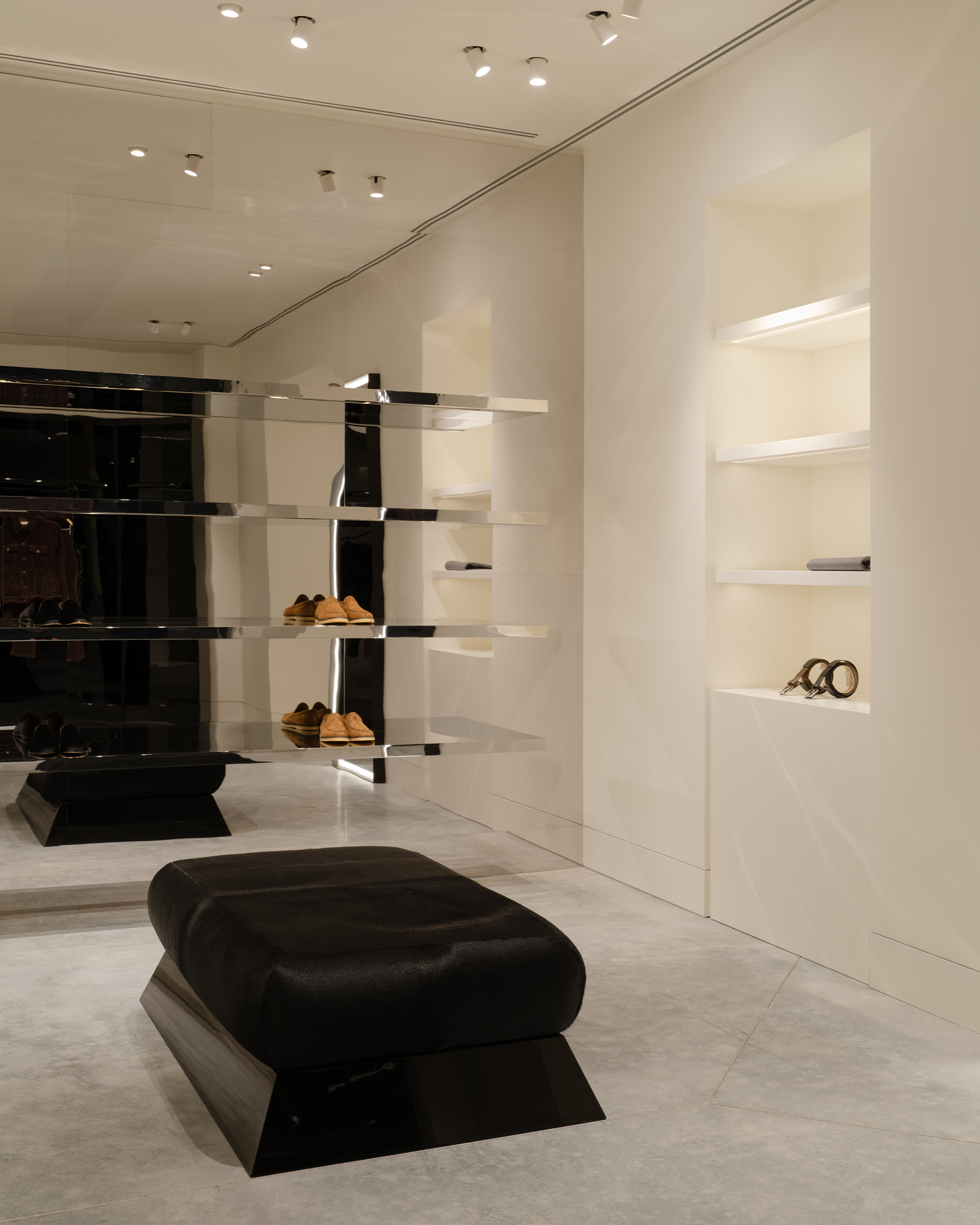 Оказываясь в бутике, посетитель попадет сразу в центральный зал, где представлена коллекция женской одежды. От него пространство расходится: с левой стороны располагается мужская линия, справа — женская. Продуманное использование зеркал создают иллюзию бесконечного пространства. Дополняет это ощущение черная обувная комната слева, залитая 100% глянцем — невероятно сложным в создании и итоговой стыковке. После нее следуют два мужских зала со своей примерочной. Правое крыло включает в себя пять залов, в самом дальнем из которых располагается зона касс с оборудованием под аксессуары и домашнюю коллекцию. В женской части также расположены примерочные. Фактурный материал отделки примерочных — шпон. Легкий французский флер задан спроектированными сиденьями и пуфами, отсылающими к классическим формам. Интересный акцент в одной из примерочных — роспись потолка. Архитекторы хотели добиться эффекта ушедшего времени, создать новый артефакт, искусственно состаривая фреску.
