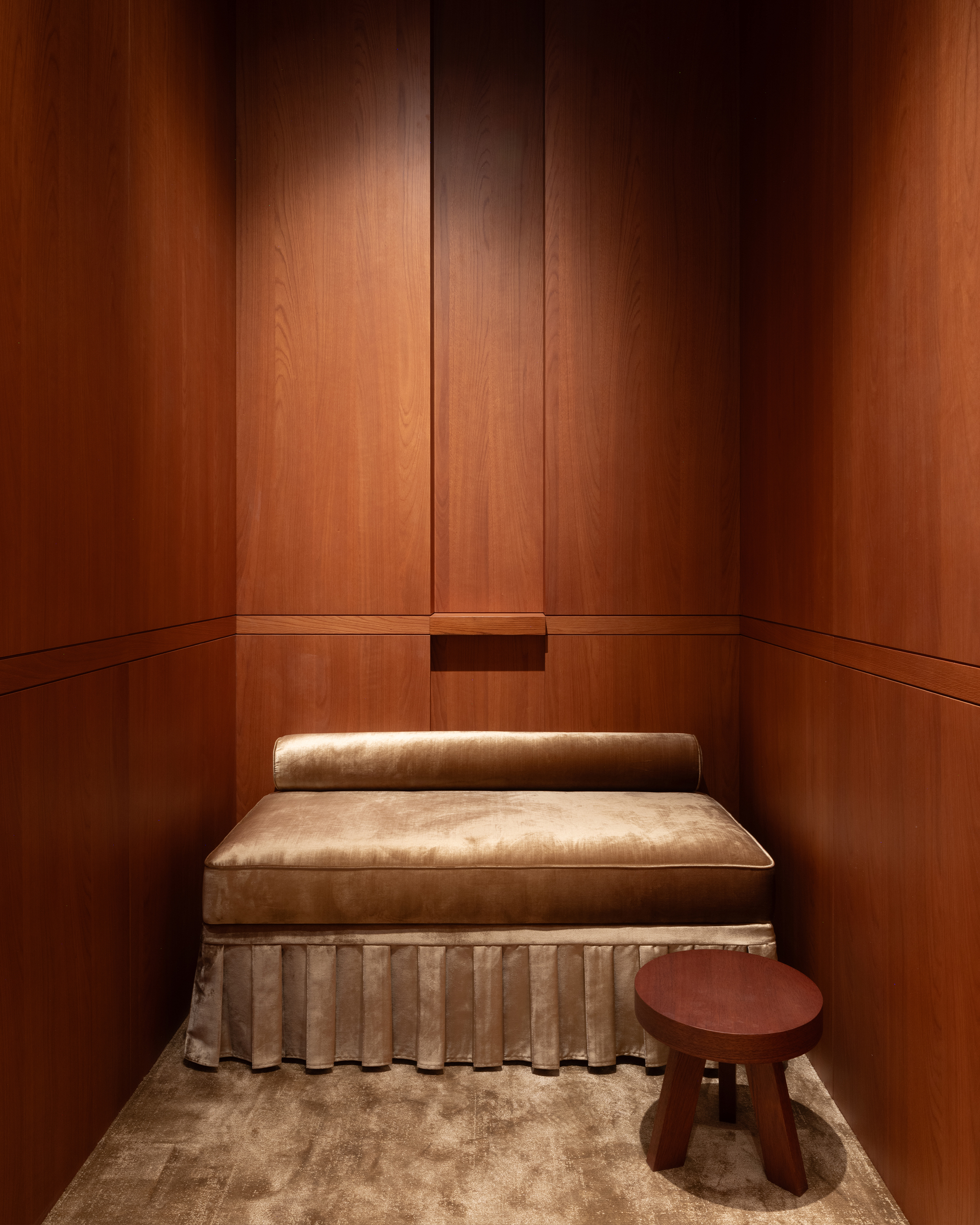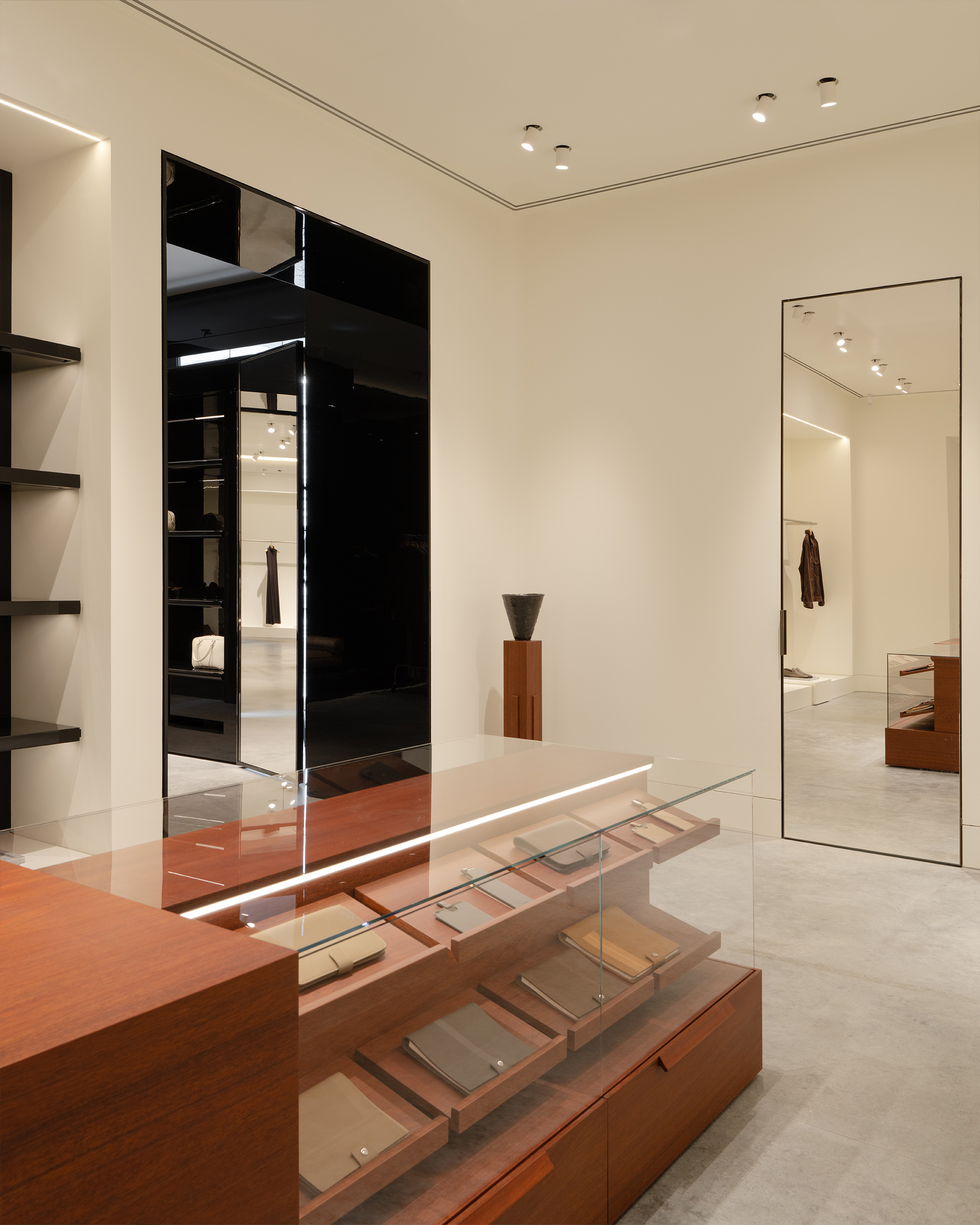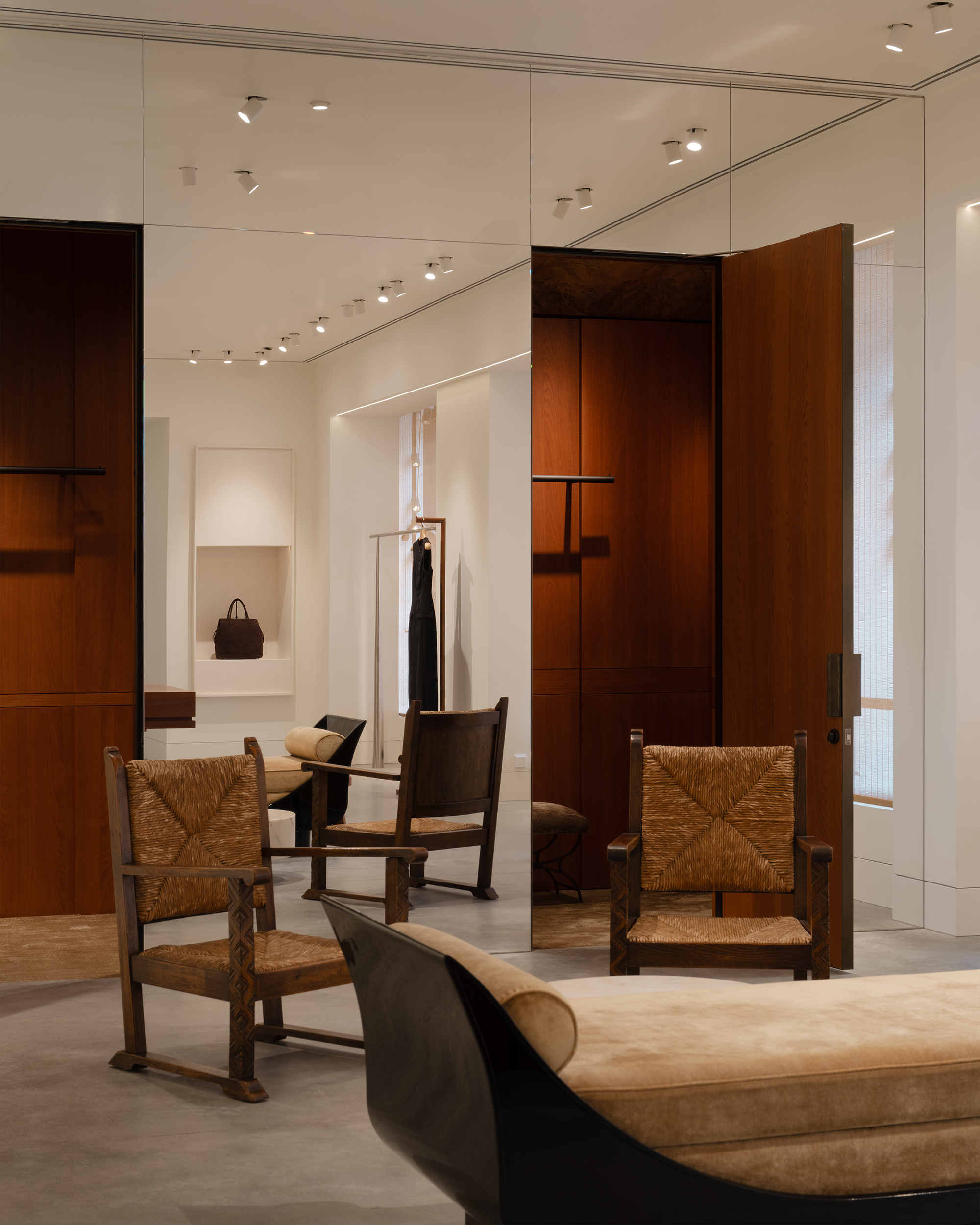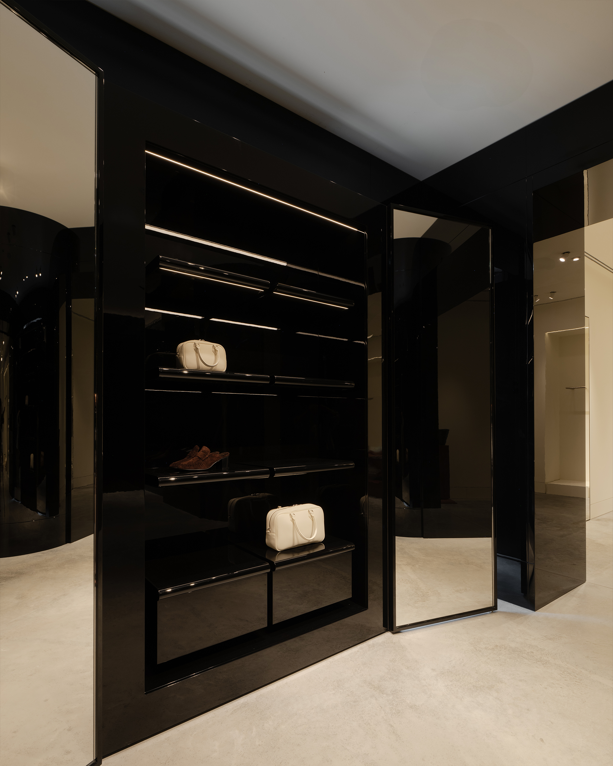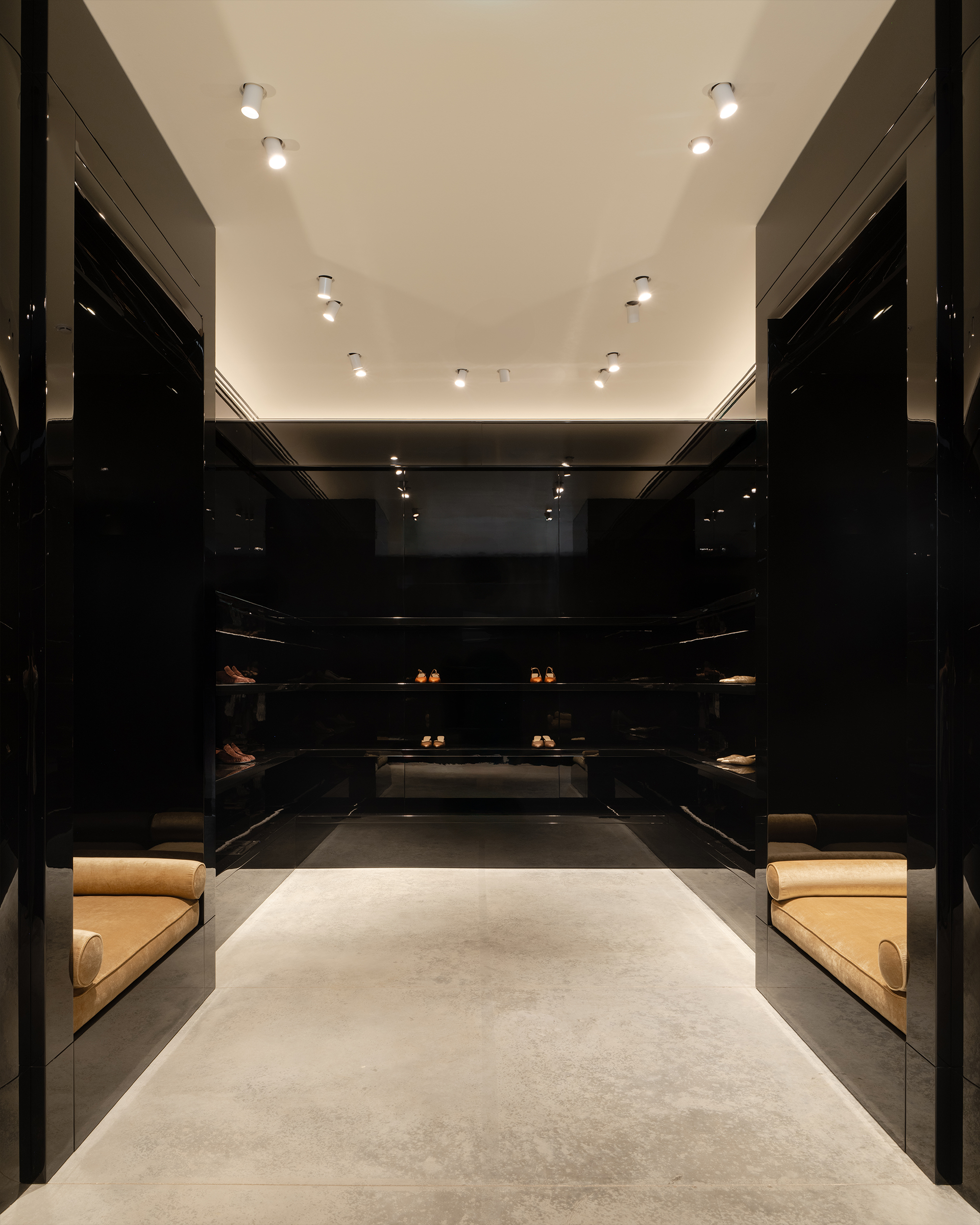 Оказываясь в бутике, посетитель попадет сразу в центральный зал, где представлена коллекция женской одежды. От него пространство расходится: с левой стороны располагается мужская линия, справа — женская. Продуманное использование зеркал создают иллюзию бесконечного пространства. Дополняет это ощущение черная обувная комната слева, залитая 100% глянцем — невероятно сложным в создании и итоговой стыковке. После нее следуют два мужских зала со своей примерочной. Правое крыло включает в себя пять залов, в самом дальнем из которых располагается зона касс с оборудованием под аксессуары и домашнюю коллекцию. В женской части также расположены примерочные. Фактурный материал отделки примерочных — шпон. Легкий французский флер задан спроектированными сиденьями и пуфами, отсылающими к классическим формам. Интересный акцент в одной из примерочных — роспись потолка. Архитекторы хотели добиться эффекта ушедшего времени, создать новый артефакт, искусственно состаривая фреску.