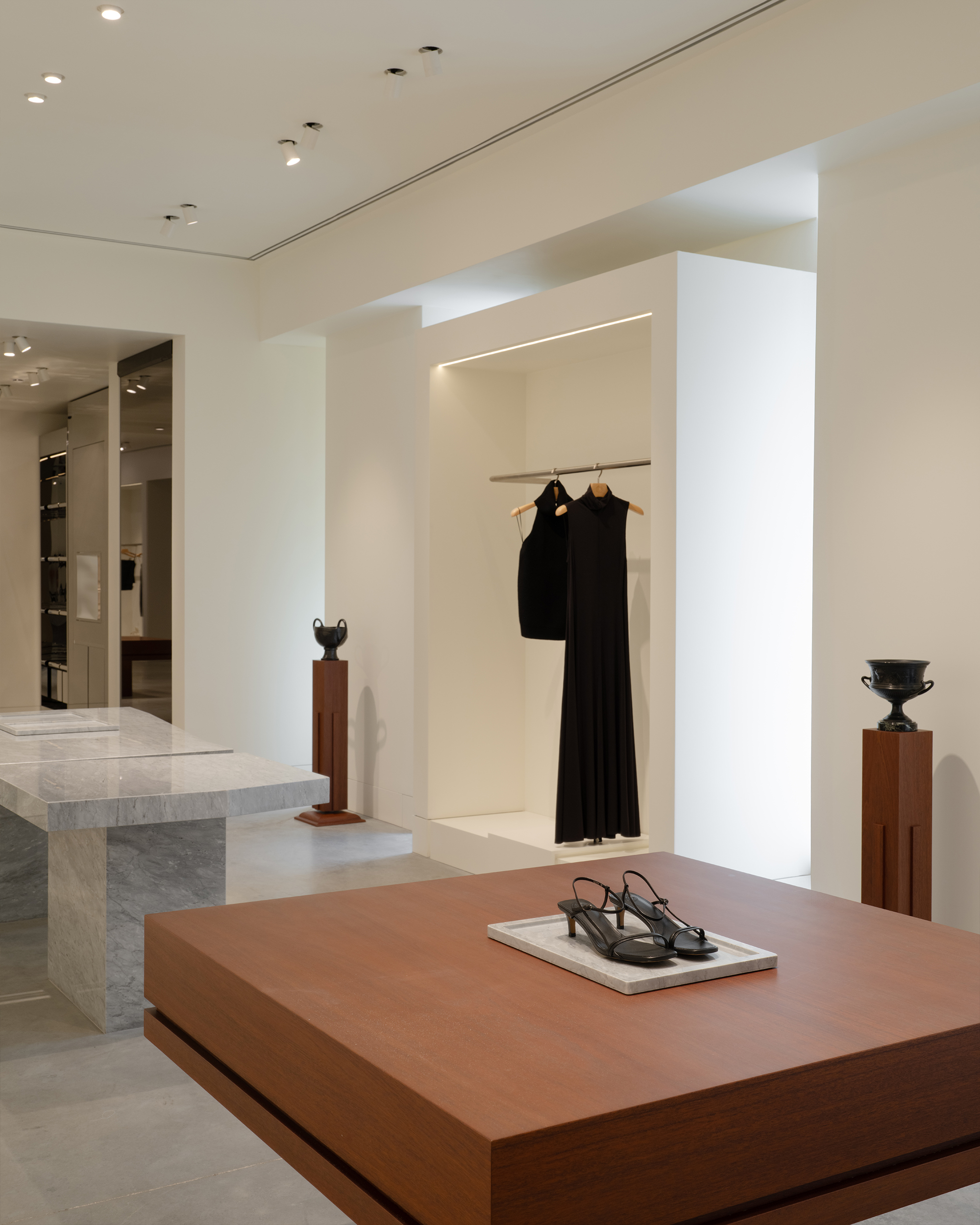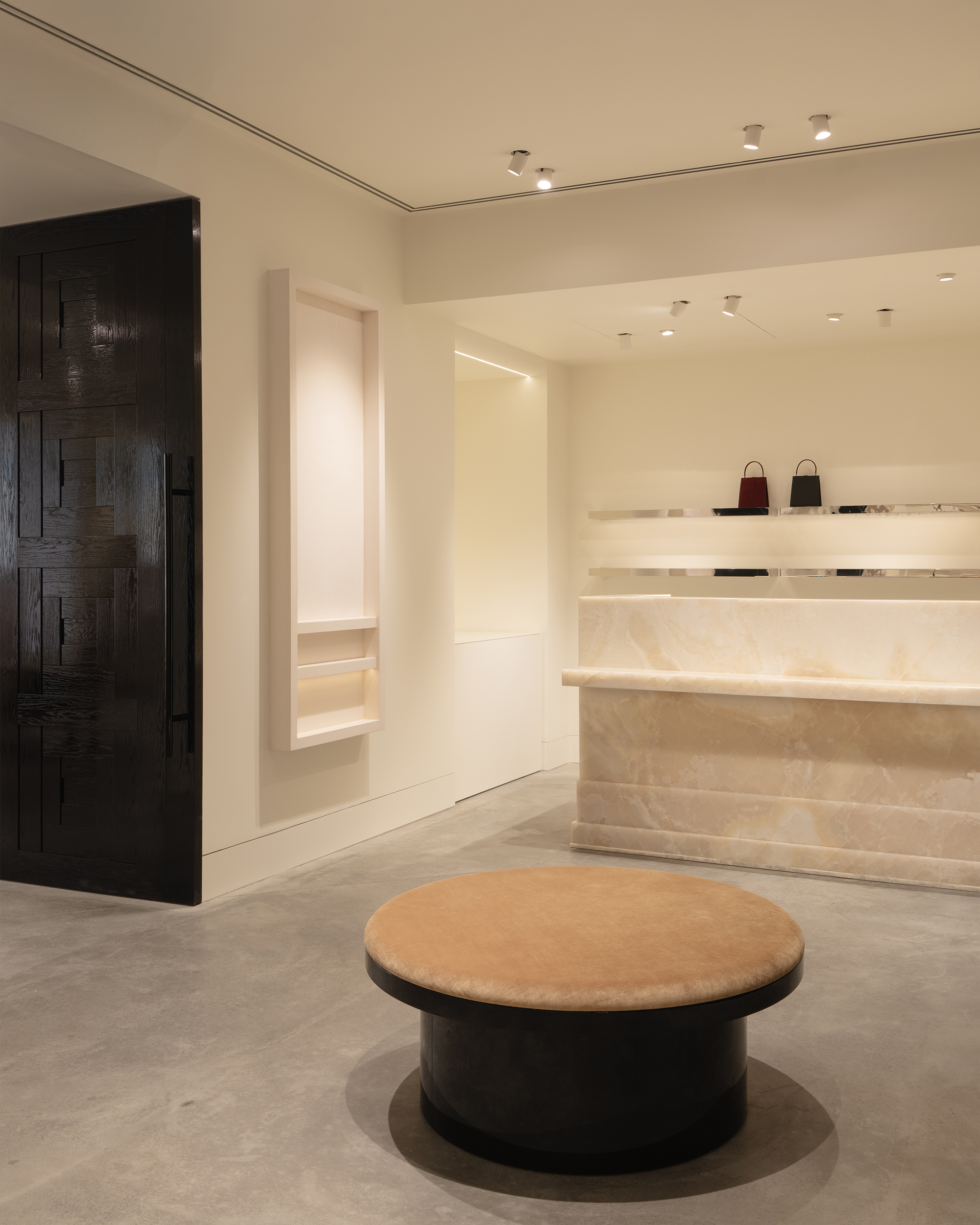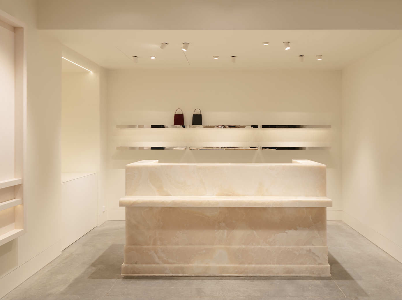 В белизне дальнего зала сделан акцент на материале — это кассовый стол. Оникс, глубокий и просвечивающий, стал также основой и некоторых столов в витринах.