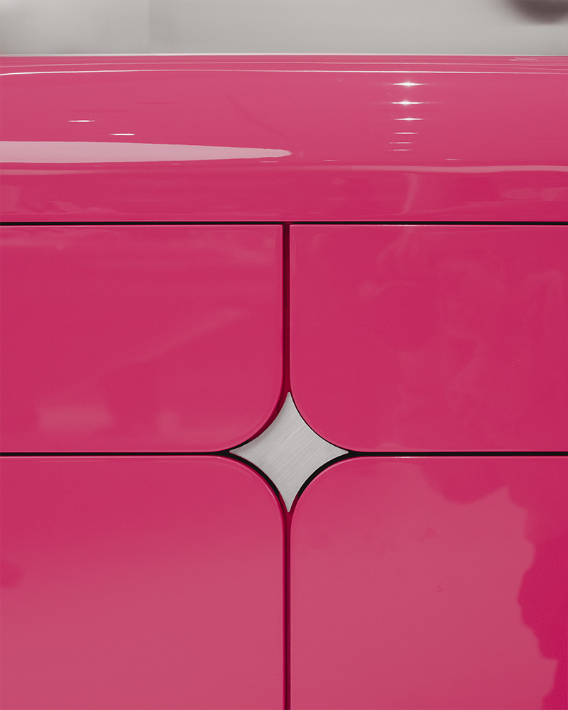 Мы также добавили небольшие акценты, подчеркивающие эстетику бренда. Например, форма звезды на фасаде дверей тумбы не только украшает ее поверхность, но и служит скрытой ручкой, обеспечивающей доступ к содержимому ящика.