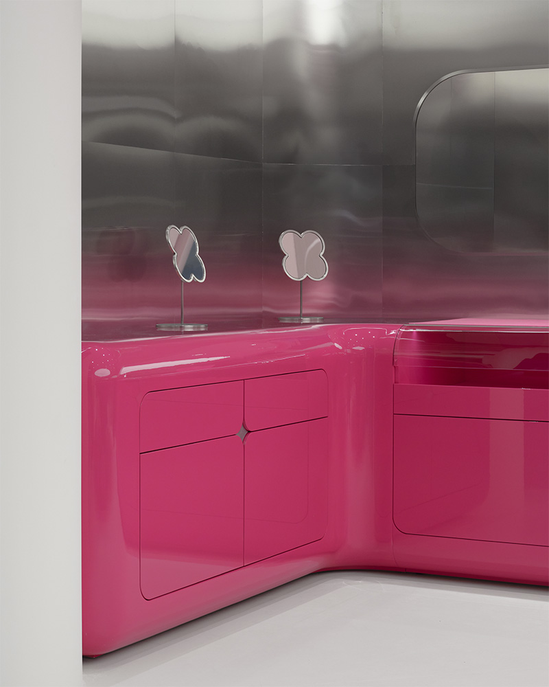 Пространство построено на игре отражений, объемов и перспектив. Главный элемент интерьера — полукруглая консольная тумба, нависающая на 2,5 метра. Позади нее располагается зеркальная стена, создающая эффект отражения: полукруг превращается в завершенный круг, а само помещение визуально расширяется. Помимо центральной тумбы в интерьере присутствует угловая консоль. Она имеет более лаконичную форму, но дополнена деталями, которые делают ее выразительной и функциональной. Одна из особенностей — закругленный стеклянный угол, через который можно увидеть украшения. Доступ к ним обеспечивают выкатные ящики, созданные для удобной организации пространства.