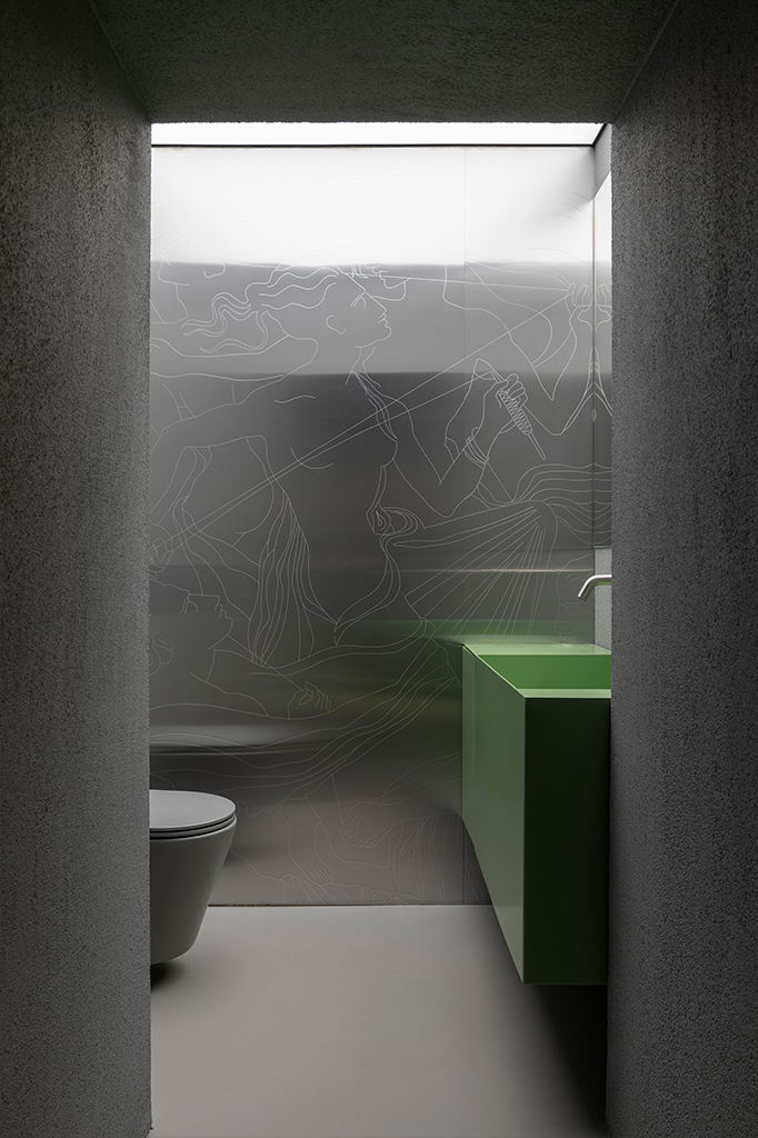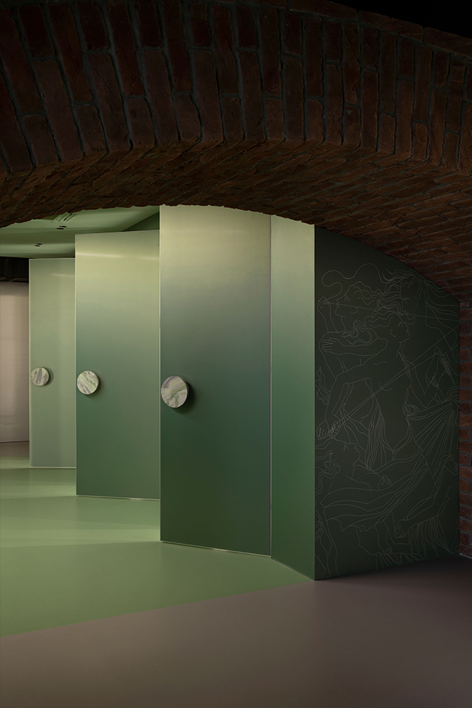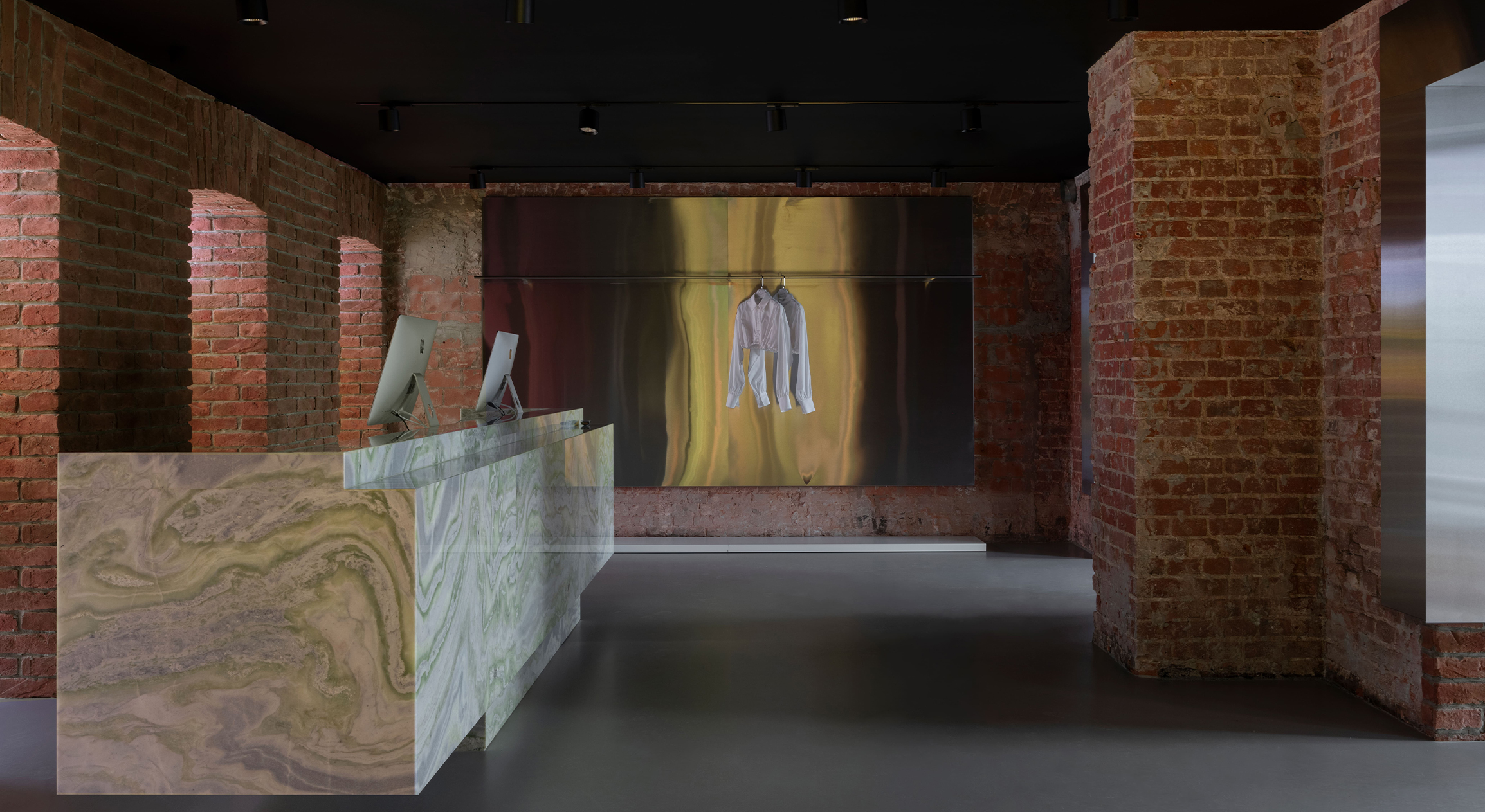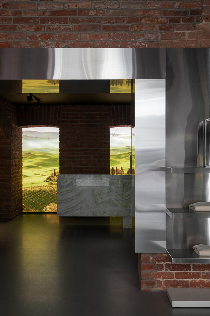 Кирпич стал основным материалом, формирующим архитектуру пространства и отсылающим к историческому наследию. Мы постарались по максимуму привести его в порядок, не нарушив целостности конструкции сводов и стен. Через такой честный подход к материалу (кирпичу более 120 лет) нам было важно показать его историю, мы оставляли трещины и другие отпечатки времени. Двусторонние шинотреки позволили, с одной стороны, подчеркнуть своды и текстуру кирпича, а с другой — направить их на предметы. В противовес фактурному кирпичу мы взяли чистые технологичные и современные материалы, которые добавляют современности и ощущение футуризма в интерьер. Нержавеющая сталь с ее отражающей шлифованной поверхностью и сложный ярко-зеленый цвет, повторяющийся в натуральном ониксе, формируют отдельные функциональные зоны. Чтобы добиться нужного оттенка , нам пришлось путем эксперимента изобретать новый материал, ранее с которым еще никто не работал.