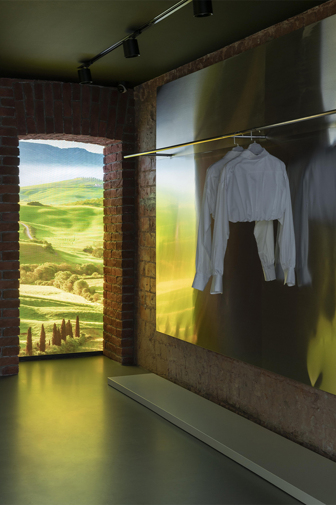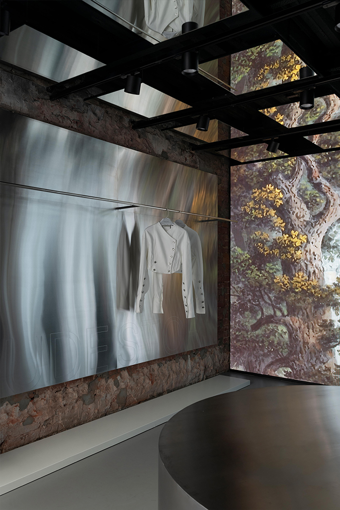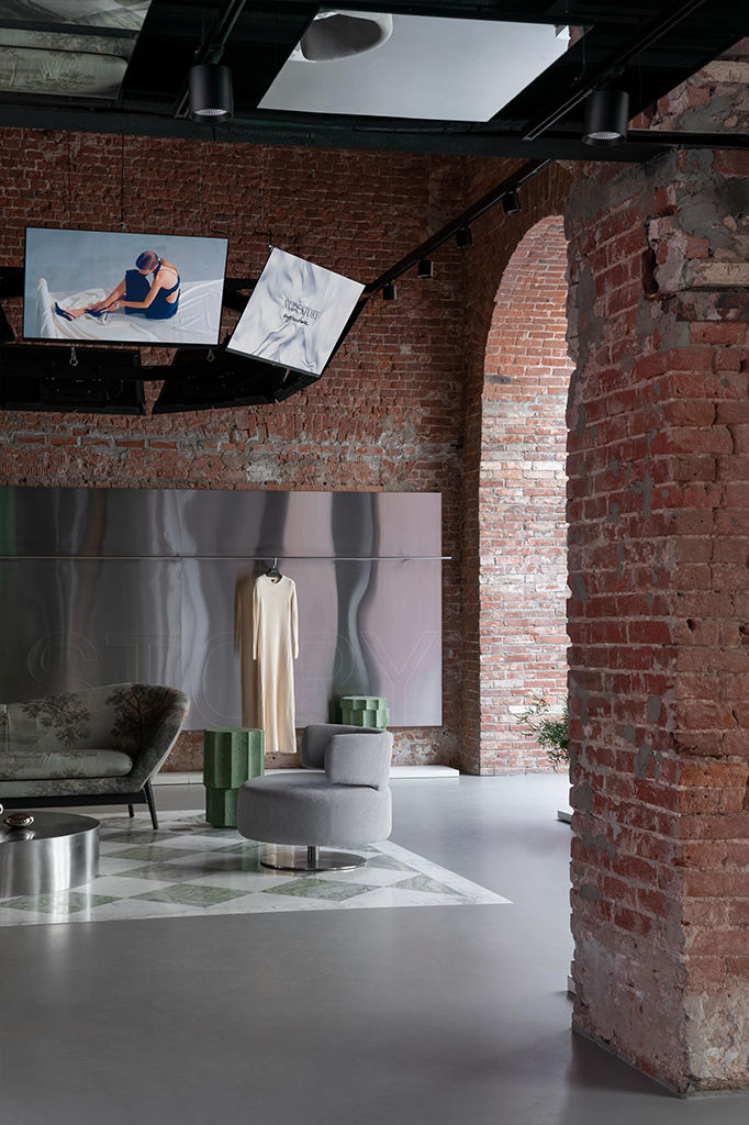 Важную роль в интерьере играют медиа-панели для контента бренда, органично вписанные в пространство. Мы выделили три основных диджитал-фишки. Так, в первом зале посетителей встречает большой экран во всю стену, который занимает почти 20 м², а его ширина – 7,3 м. Экран придает бутику необходимую атмосферу за счет транслируемого контента как в модных домах. Отражающая поверхность зеркал на потолке усиливает его эффект, работая на проходящий мимо магазина поток людей. Когда мы делали демонтаж всех перегородок, то обнаружили настоящие окна под гипсокартоном, которые когда-то выходили во двор (сейчас там пристройка). И у нас возникла идея использовать окна как ниши для LED-экранов. В них также транслируется контент бренда: модный показ, переходящий из одного окна в другое, или широкий ландшафт на все четыре экрана, создающий ощущение пребывания в путешествии. Отдельным элементом композиции стала люстра из экранов в главном зале со сводчатыми потолками. Подобное исполнение отсылает к традиционным люстрам, а экраны служат эффективным медиа-инструментом продаж. В ночное время ее работа выглядит особенно эффектно. Современная мебель контрастирует с исторической архитектурой, создавая интересный диалог между прошлым и настоящим. Это подчеркивает уникальность как мебели, так и пространства.
