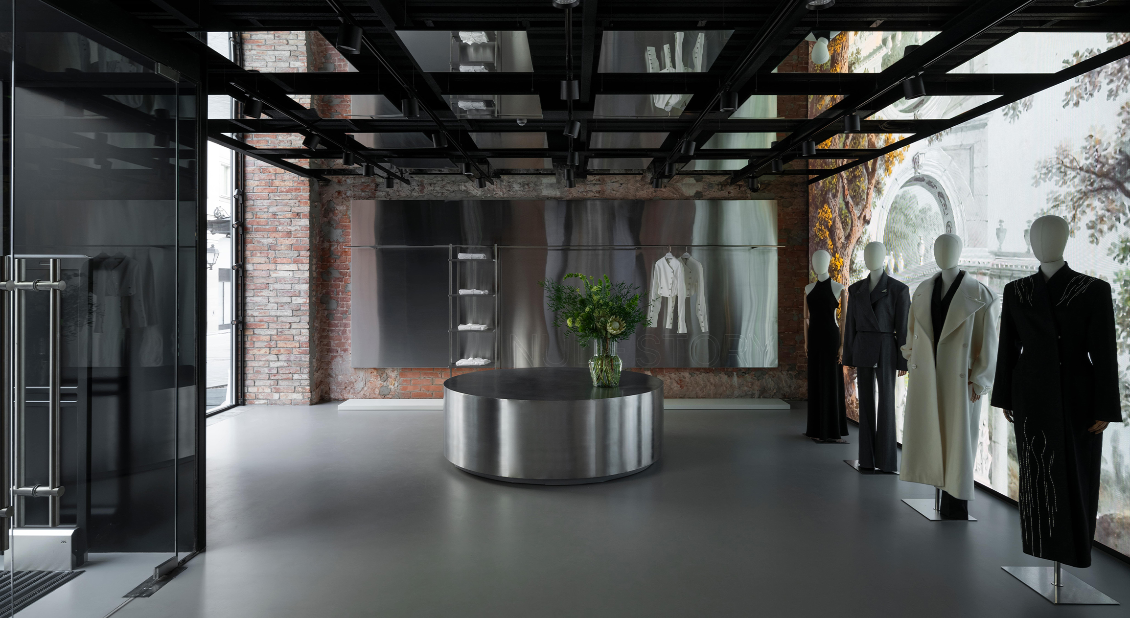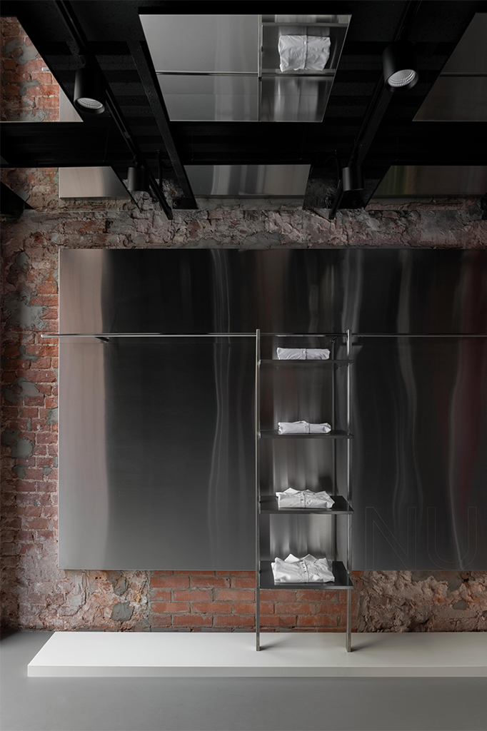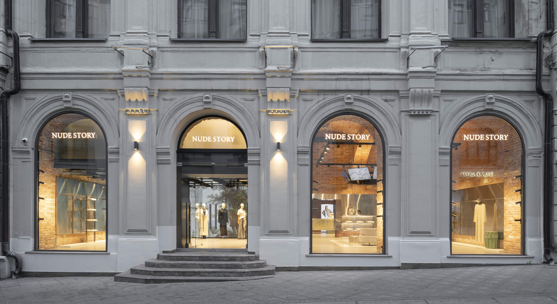 Флагманский бутик бренда Nude Story на Кузнецком мосту в Москве расположен в историческом здании — доходном доме А. С. Хомякова 1899 года. За эти годы сменилось большое количество владельцев, а его интерьеры и планировка претерпевали изменения. Главное достоинство этого пространства — 6-метровые сводчатые потолки и невероятные витрины в форме арок, которые украшают фасад. Дом моды, диджитал-галерея и палаццо — три темы, которые мы хотели объединить в образе нового флагманского магазина. Последний референс возник неслучайно — основатели бренда вдохновляются Италией, а в производстве бренд использует итальянские ткани.