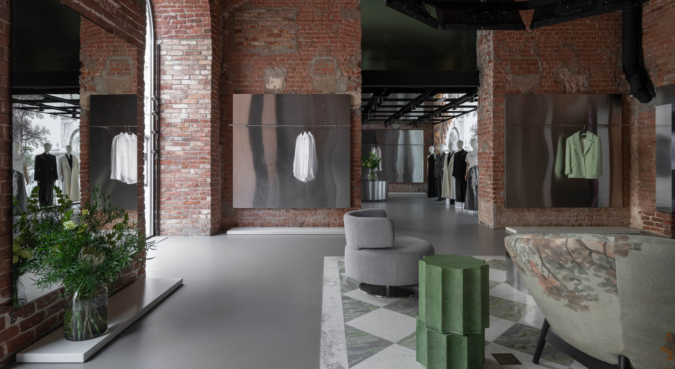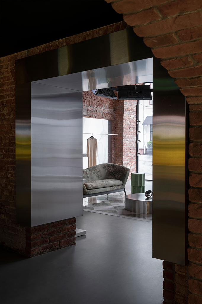 Один из центральных элементов интерьера — «ковер» из оникса и мрамора с шахматным узором – элемент классической роскоши, который добавляет пространству элегантность. Пол с шахматным узором словно отсылает к классике итальянской архитектуры, но в новом, более графичном прочтении. Поиск подходящего камня занял почти два месяца. Подходящий по цвету и фактуре оникс идеально сочетался с нержавеющей сталью и зеленым оттенком зоны примерочной. Он стал отличным дополнением к оранжевому цвету кирпича, а также послужил отсылкой к первому магазину бренда на Петровке и цвету традиционной татарской культуры (родина бренда и его основателей). Таким образом, все элементы общей композиции сложились между собой.