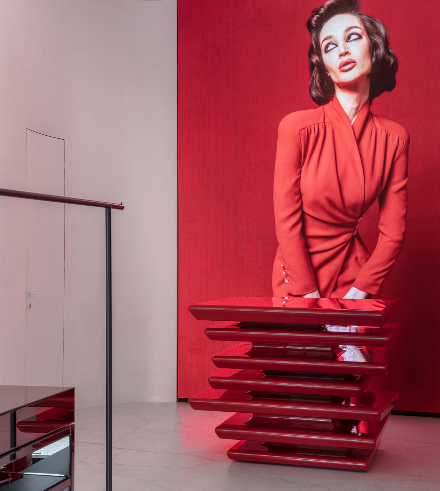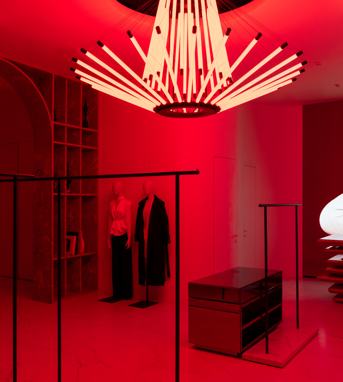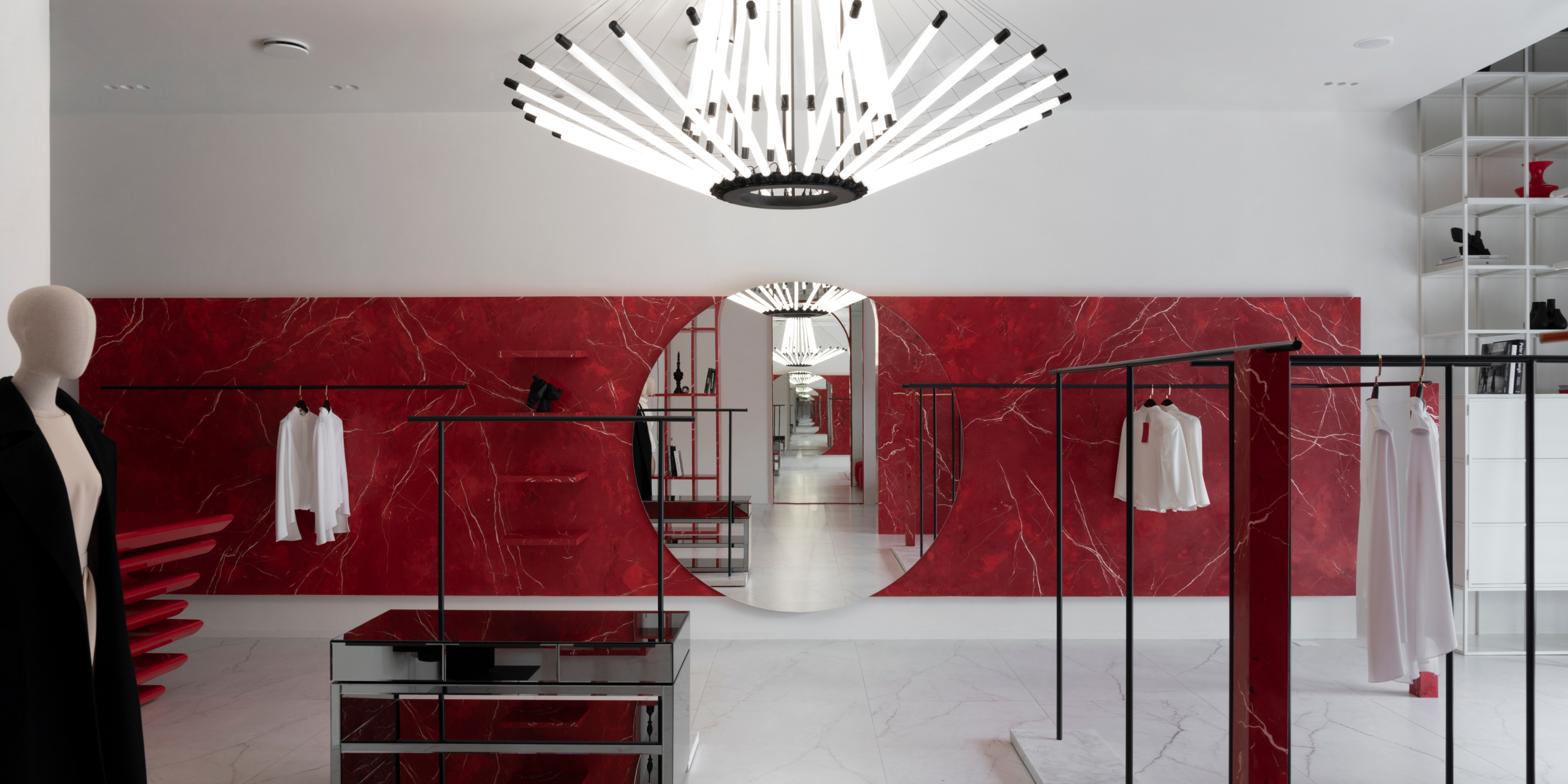 Использование больших или нестандартных LED-экранов стало для нас стандартом, и наши клиенты знают, что в их коммерческом пространстве обязательно будет digital-зона для контента. Одной из главных особенностей интерьера стала кинетическая люстра и кинетический театральный занавес в витрине магазина. В последних проектах мы активно интегрируем кинетику, что придает динамику статичному интерьеру и привлекает внимание посетителей. Люстра никогда не останавливается и имеет несколько цветовых режимов, включая красный свет, который кардинально меняет пространство. Театральный занавес и композиция из манекенов встречают гостей и привлекают прохожих, располагаясь в 5-метровой витрине.