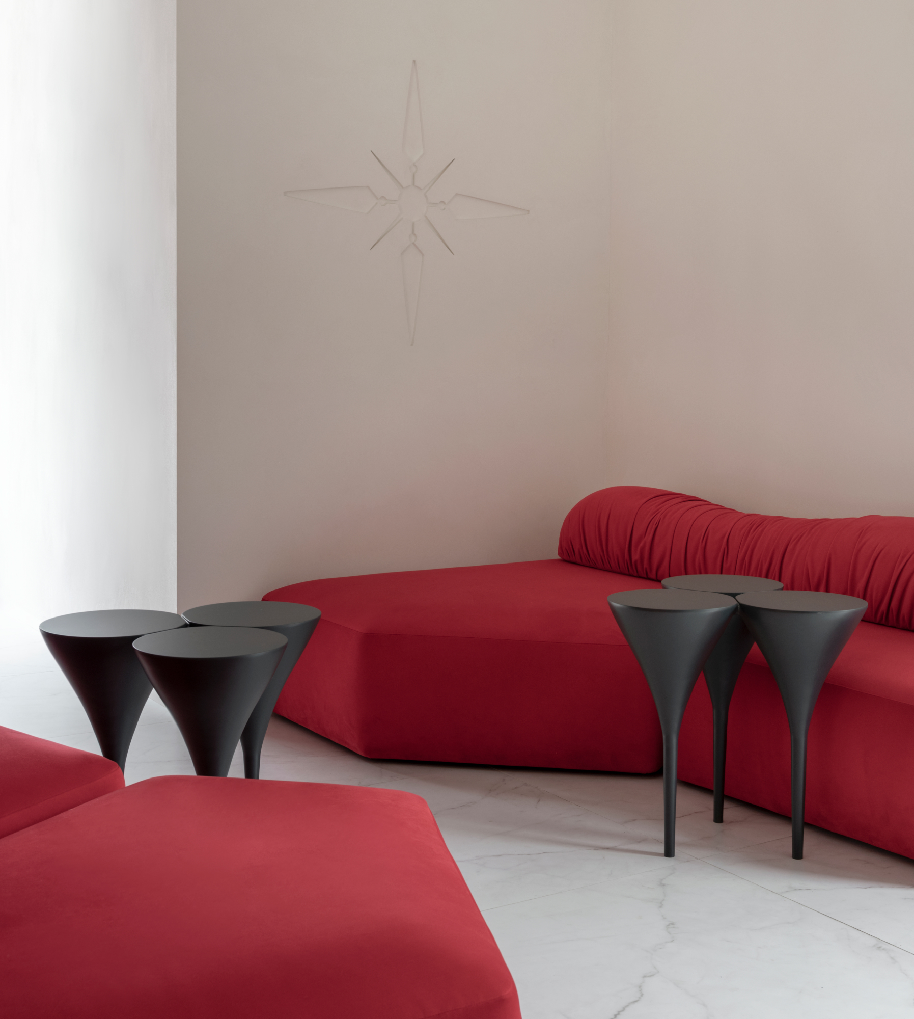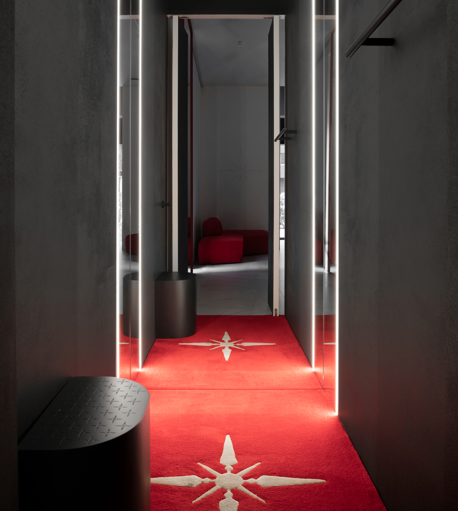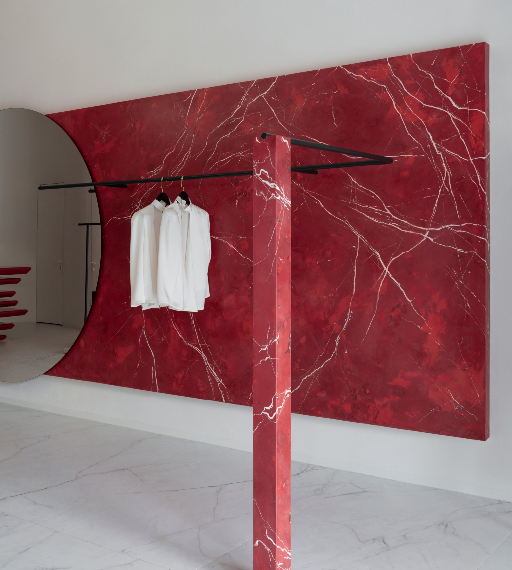 Использование больших или нестандартных LED-экранов стало для нас стандартом, и наши клиенты знают, что в их коммерческом пространстве обязательно будет digital-зона для контента. Одной из главных особенностей интерьера стала кинетическая люстра и кинетический театральный занавес в витрине магазина. В последних проектах мы активно интегрируем кинетику, что придает динамику статичному интерьеру и привлекает внимание посетителей. Люстра никогда не останавливается и имеет несколько цветовых режимов, включая красный свет, который кардинально меняет пространство. Театральный занавес и композиция из манекенов встречают гостей и привлекают прохожих, располагаясь в 5-метровой витрине.