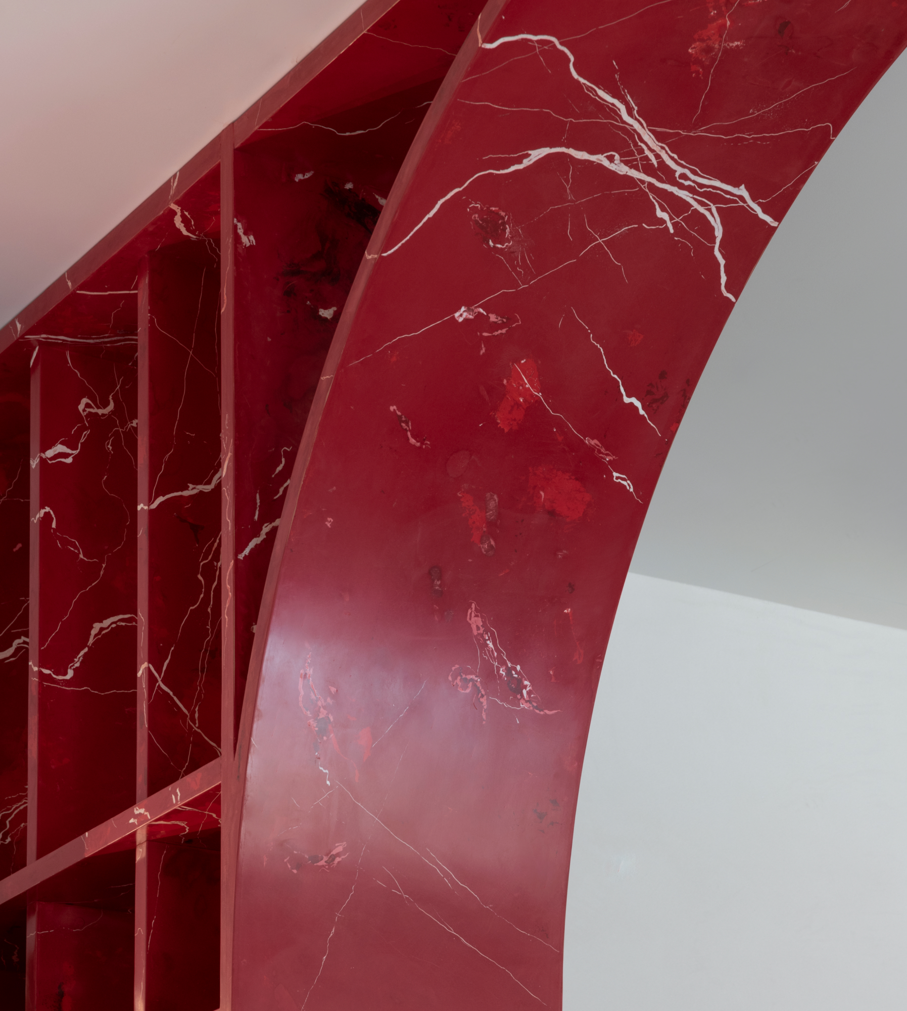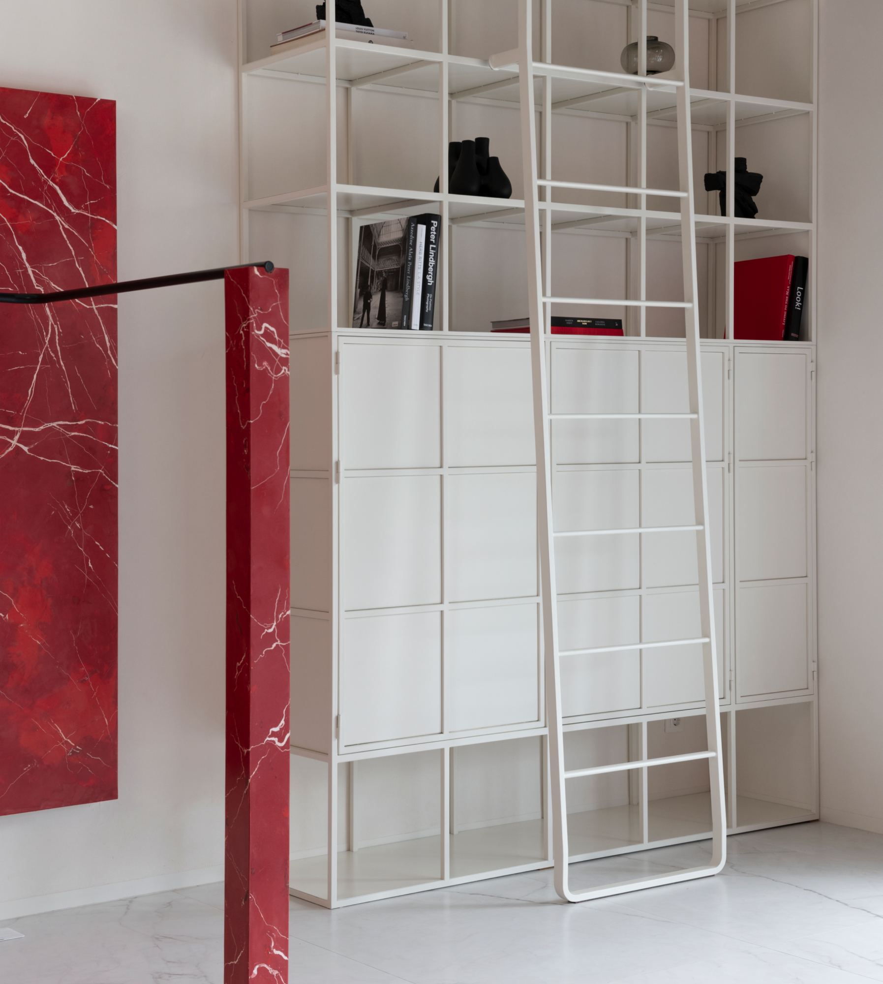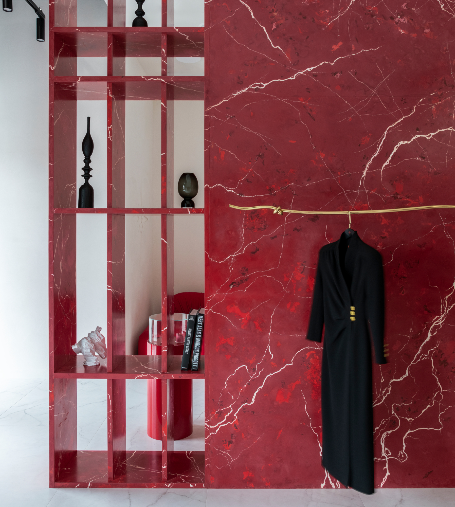 В отделке использована декоративная штукатурка теплого белого оттенка, послужившая базой для цветовых акцентов в виде мебели и предметов интерьера. Яркая акцентная деталь и гордость — стеллаж с аркой «красный мрамор», с у нас чем связано много историй.
