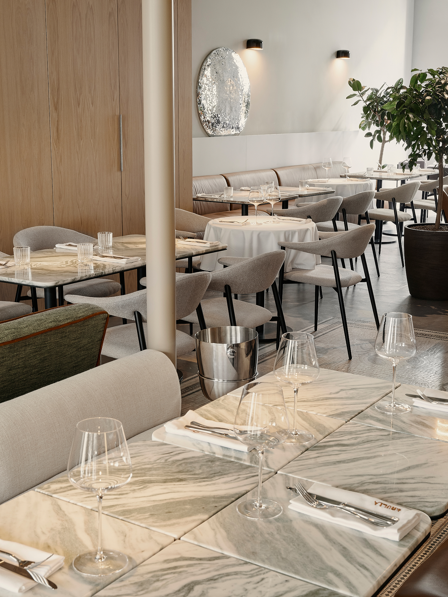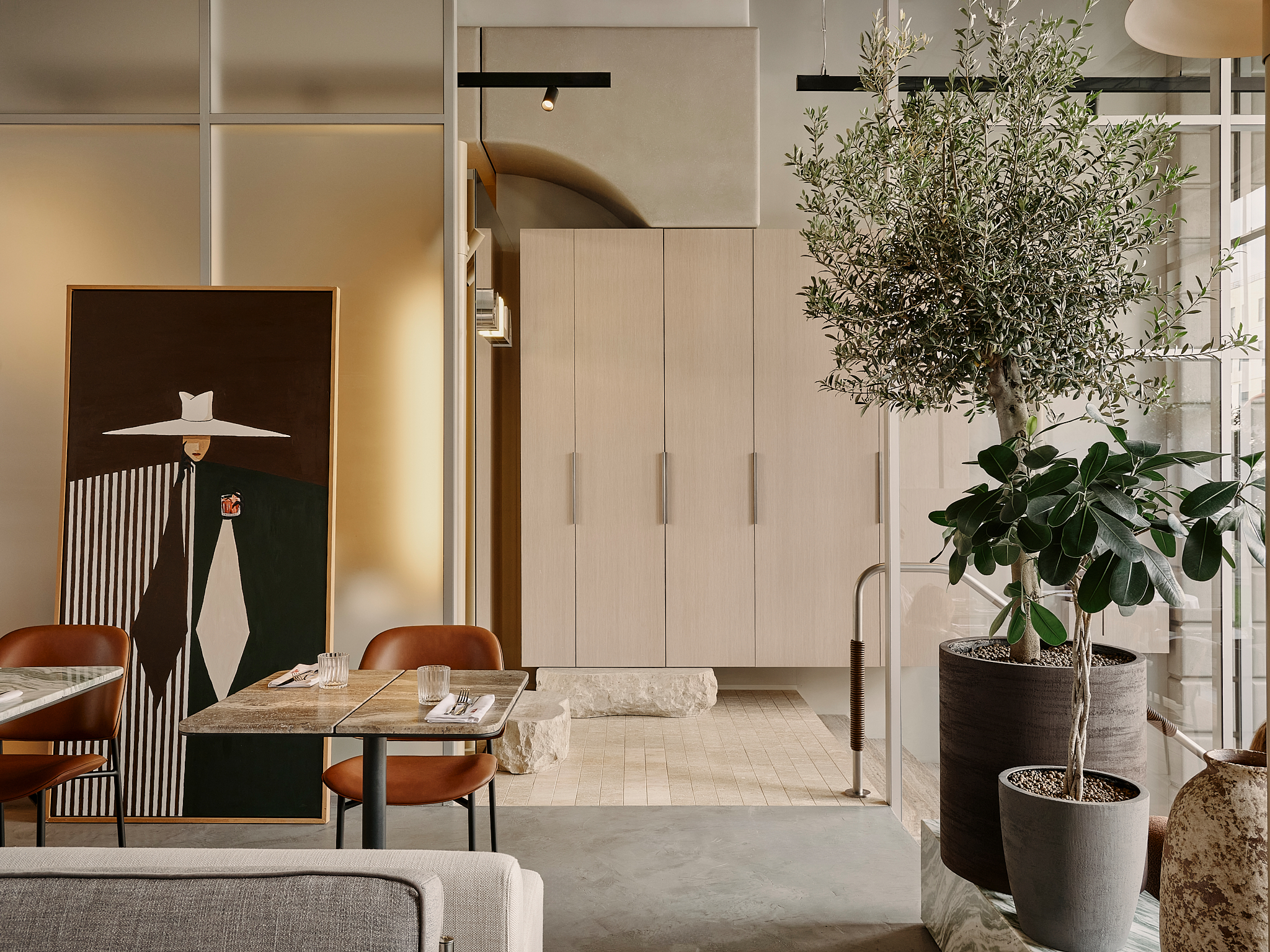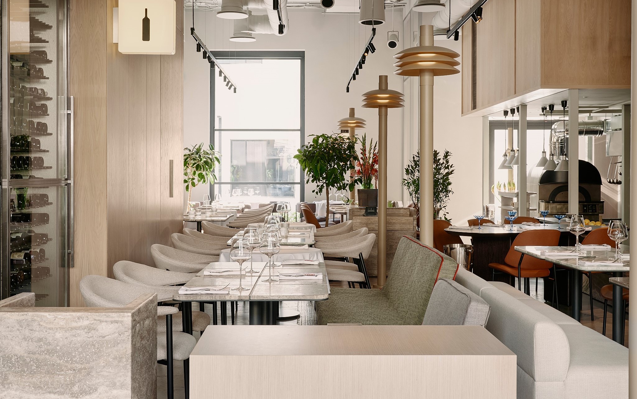 Центральная посадочная зона напоминает городскую улицу с фонарями и деревьями. Здесь нет симметрии — создается впечатление, что элементы собраны случайно и спонтанно: как будто жители соседних домов вынесли на улицу свою мебель и присели отдохнуть в тени. Эффект усиливается благодаря комбинации фасадных элементов вдоль стены: где-то выступает антресоль кухни, где-то — козырек бара или арка. Эти разные по форме и материалам элементы выстроены в единую линию, что создает атмосферу настоящей миланской улицы, строгой и слегка хулиганской. На полу – авторская мозаика.