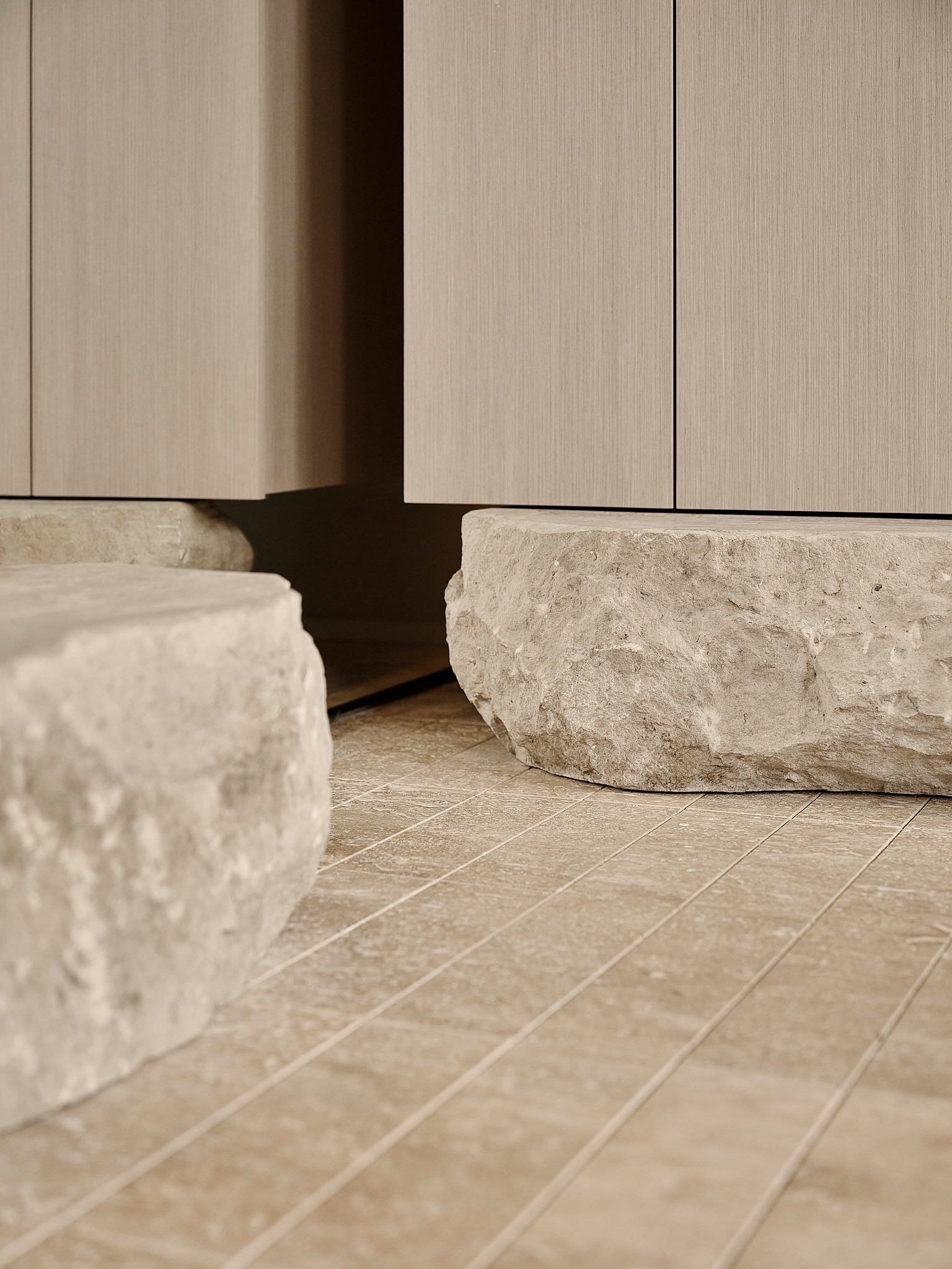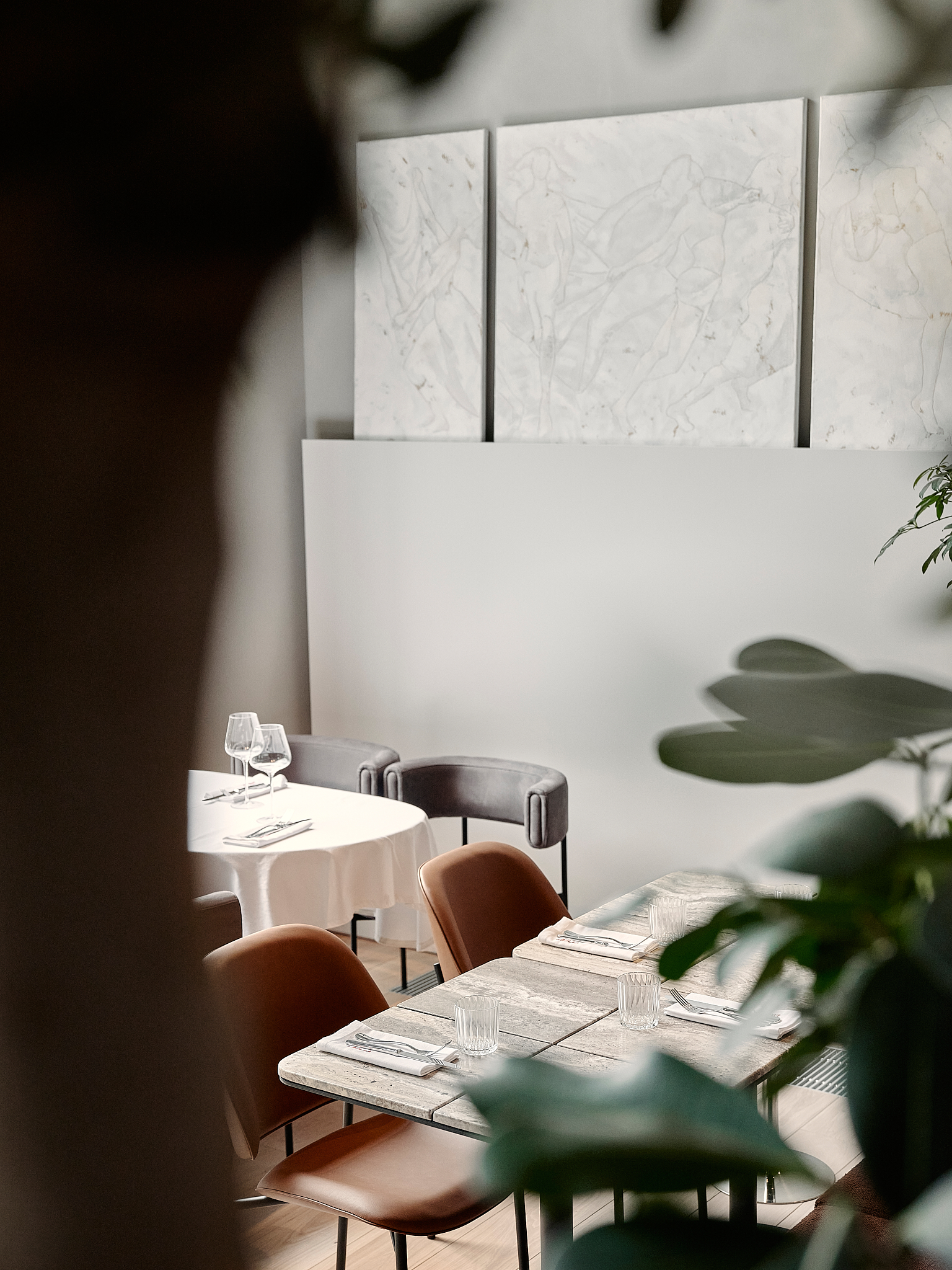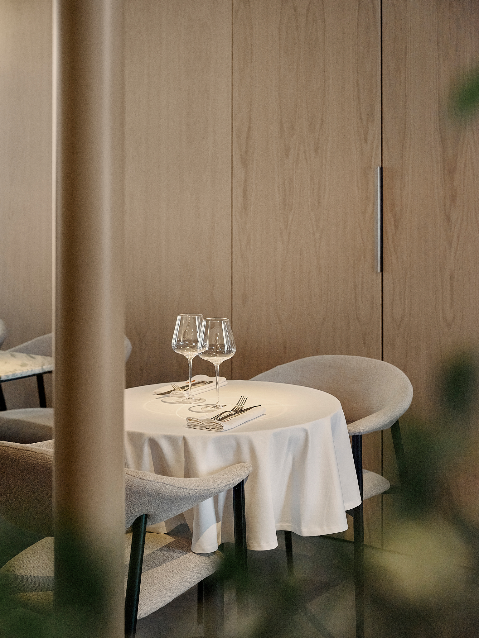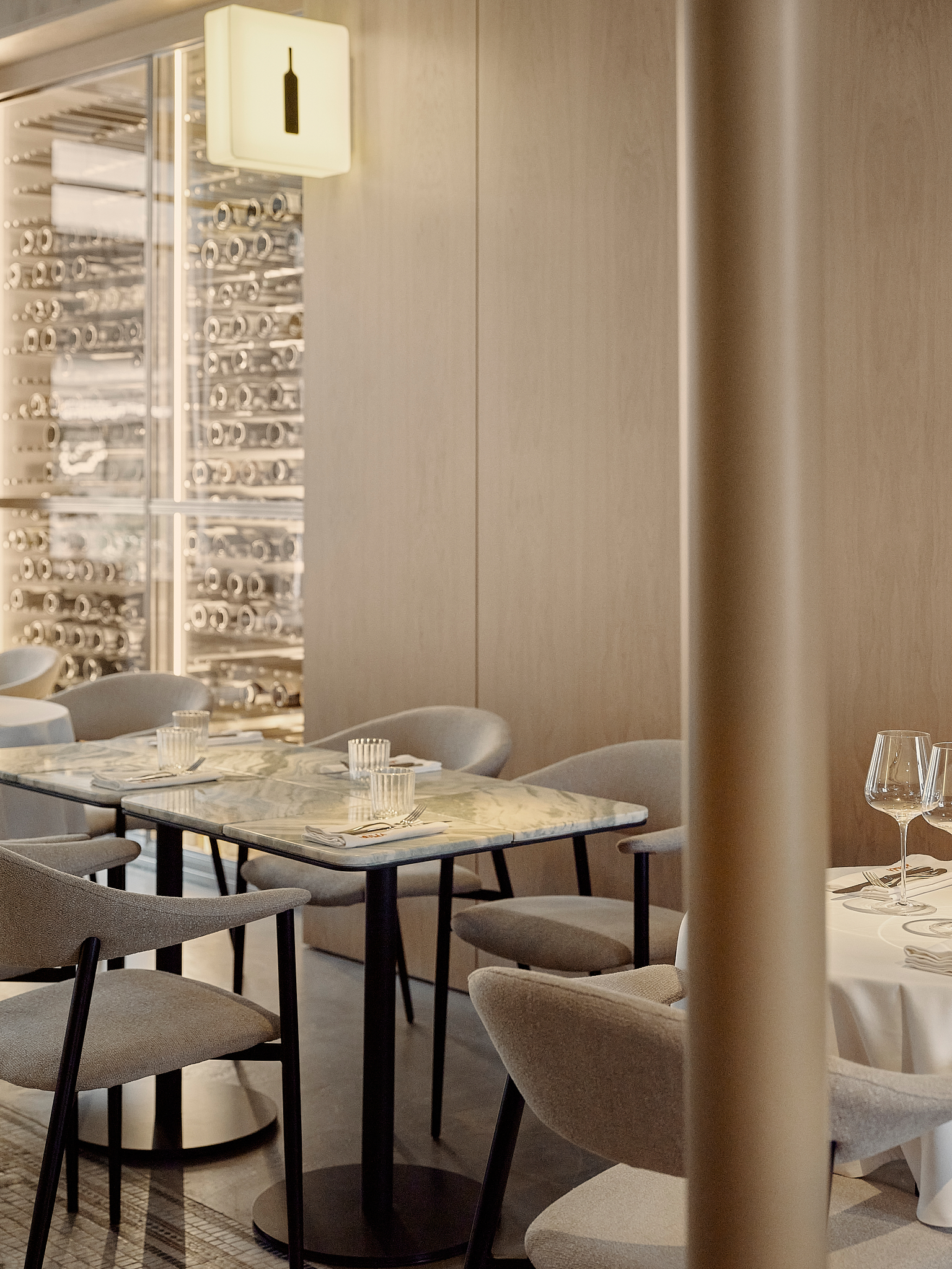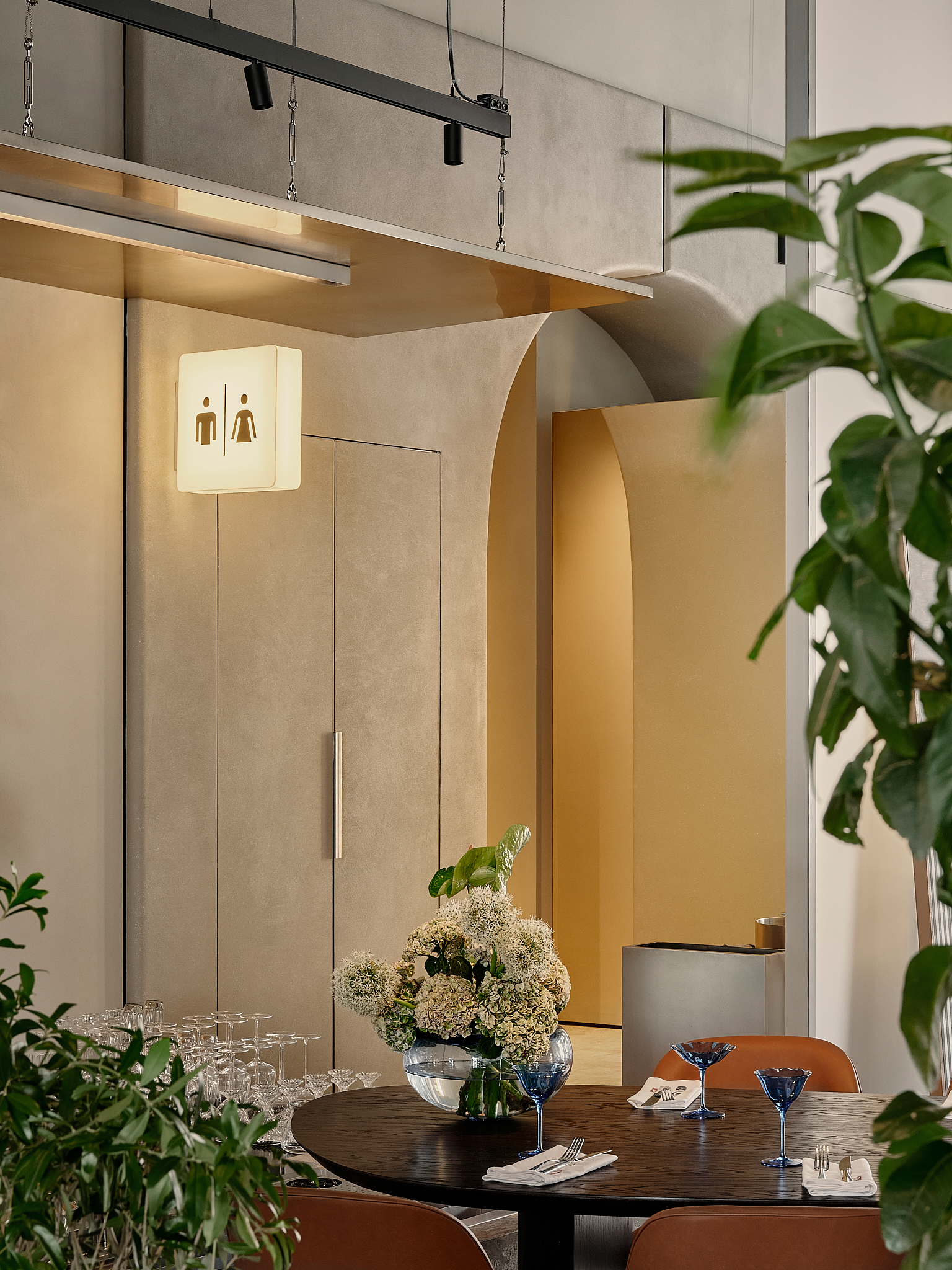 Контраст основной динамике задают две более камерные зоны, расположенные ниже уровня главного зала. Открытая кухня и бар заметно заглублены, что позволяет гостям наблюдать за процессами, но визуально отделяет эти зоны от общего пространства. Возникает эффект «открытости с барьером» — все на виду, но без вторжения.