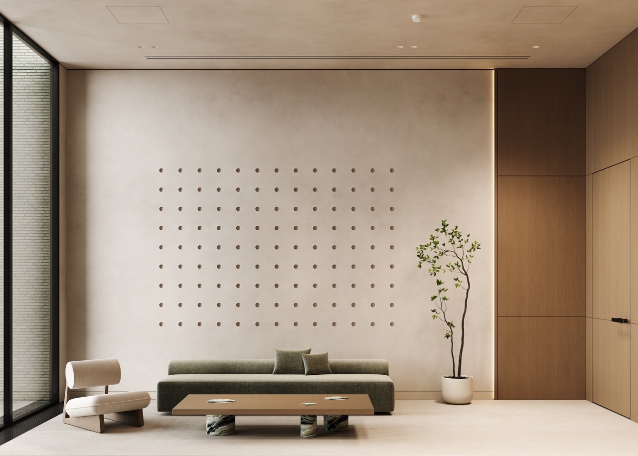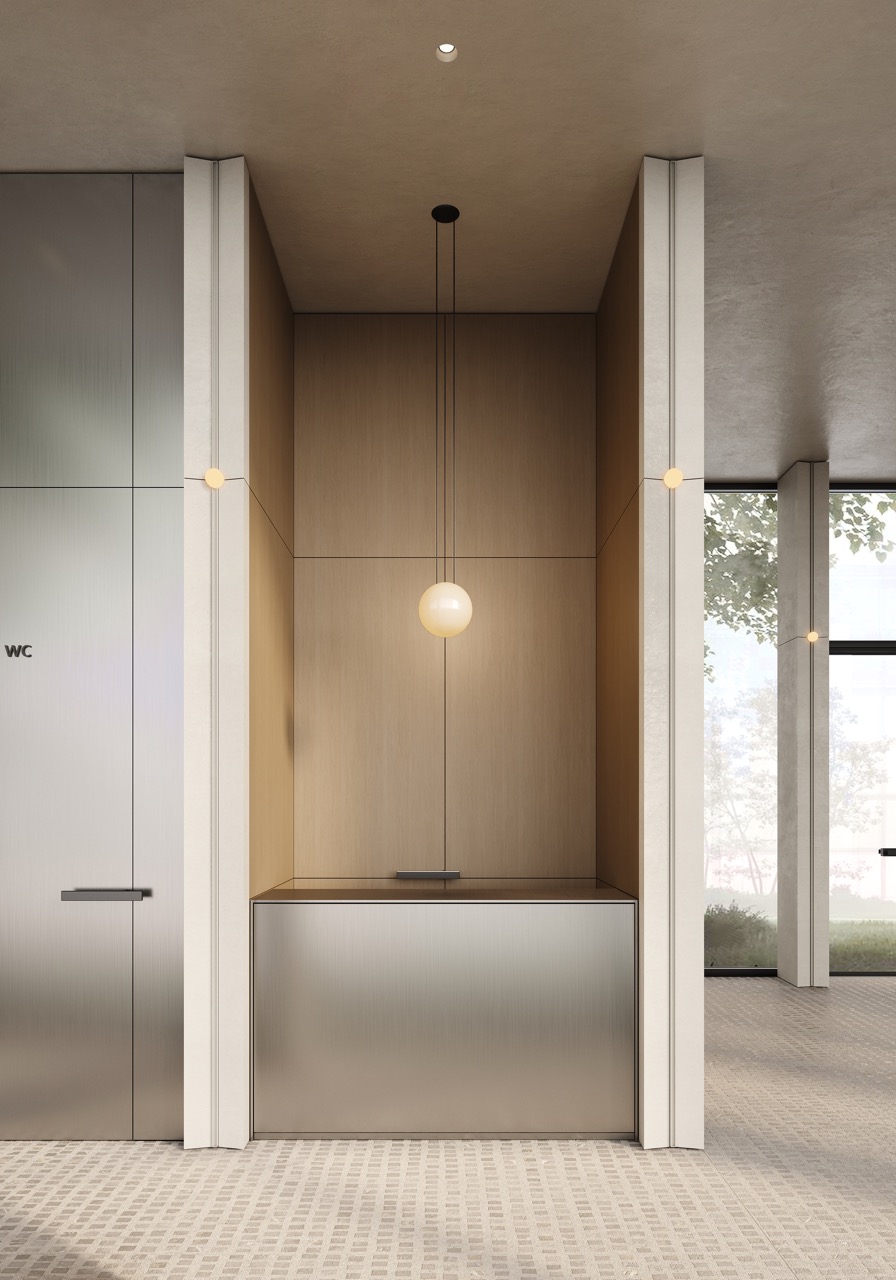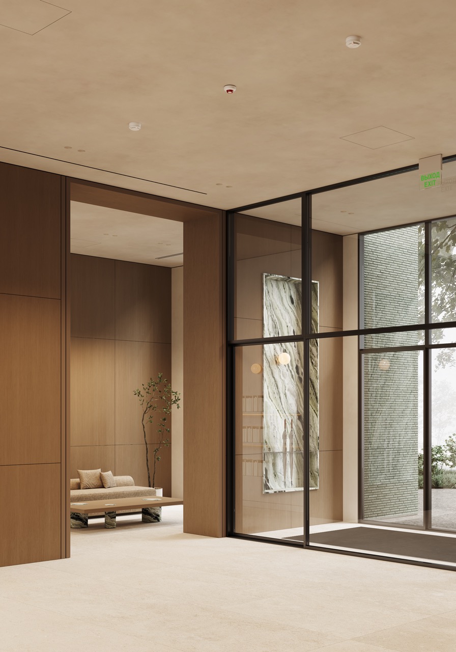 Минималистичный декор, живые растения и мягкое рассеянное освещение создают атмосферу уединения и комфорта с первого шага в лобби. В интерьере использованы тканевые панели, ставшие удобной альтернативой традиционным шторам. Они легко перемещаются и позволяют изменять внешний вид пространства и мягко выделяют лаунж-зону. В коридоре, ведущем к почтовой зоне, предусмотрена зона ожидания для курьеров, что делает пространство комфортным не только для резидентов, но и для их гостей.