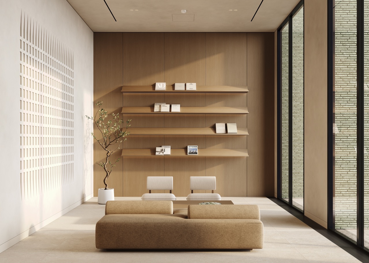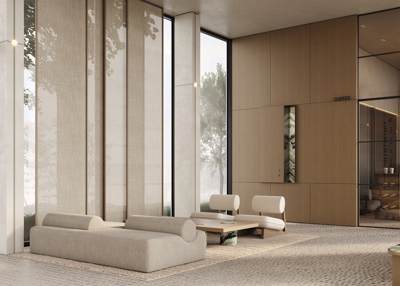 Интерьер лобби жилого комплекса STONE RISE воплощает идею элегантной простоты и продуманного комфорта. Просторное помещение с панорамным остеклением наполнено естественным светом, который подчеркивает теплую фактуру дерева, светлых текстильных панелей-штор и мягкой мебели в приглушенных тонах.