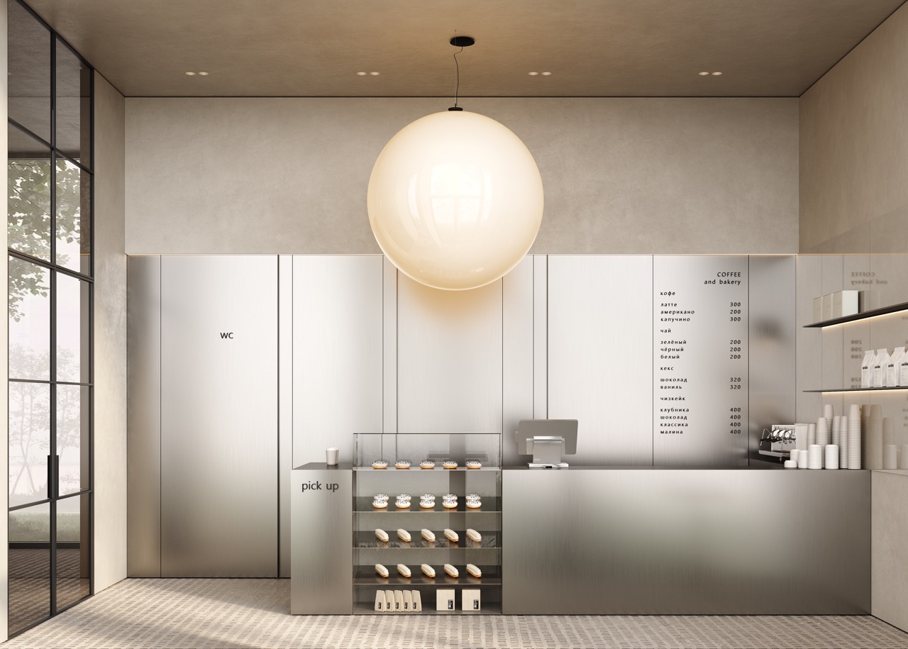 В пространстве лобби и кофейни много внимания уделено световым решениям. Еще один акцент — люстра-шар, виднеющаяся сквозь прозрачную стеклянную перегородку. В зоне кафе использованы более технологичные и долговечные материалы — нержавеющая сталь с мягкими рефлексами, мебель выполнена из натурального дерева.