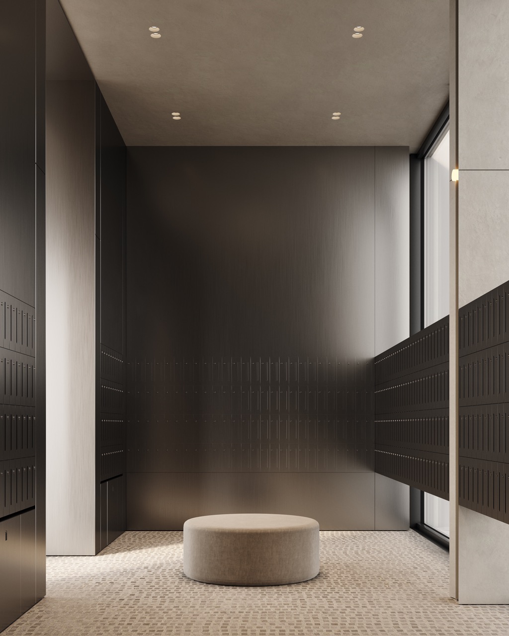 Интерьер наполнены только нужными, функциональными предметами. Постаматы встроены в общую систему почтовой зоны и являются неотъемлемой частью системы доставок, что позволяет получить свою посылку без дополнительных коммуникаций или ожидания. Центром почтовой зоны становится мягкий круглый пуф — не просто элемент дизайна, а продуманное решение. Он делает функциональную зону не просто утилитарной, но и комфортной частью жилого комплекса.