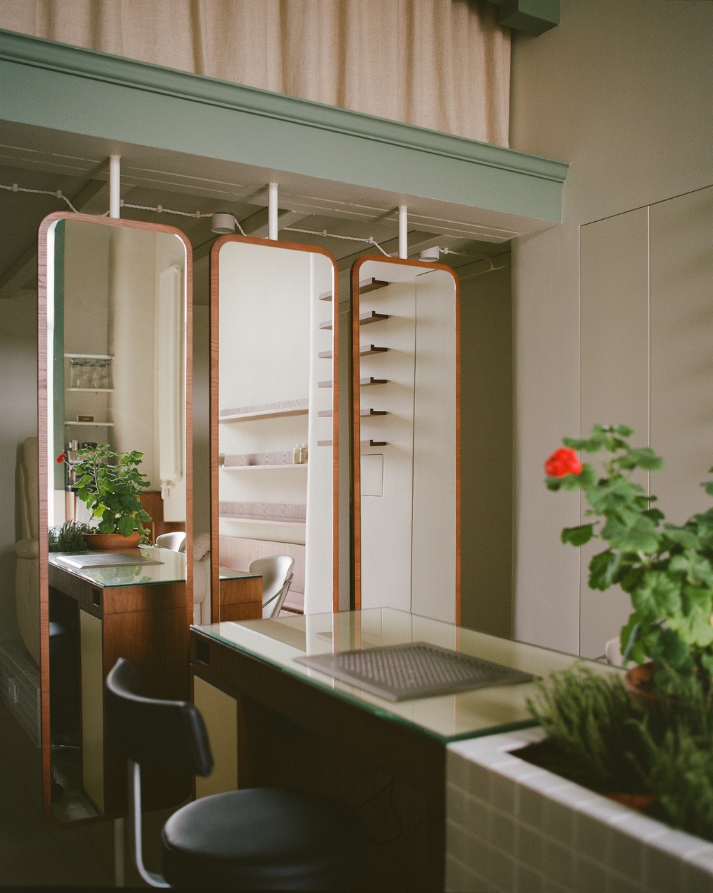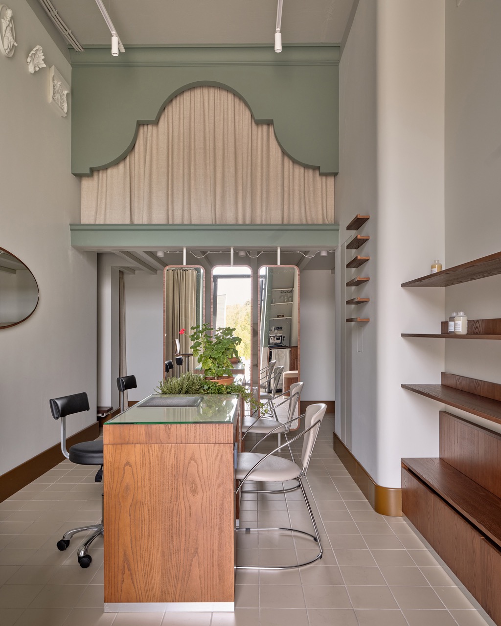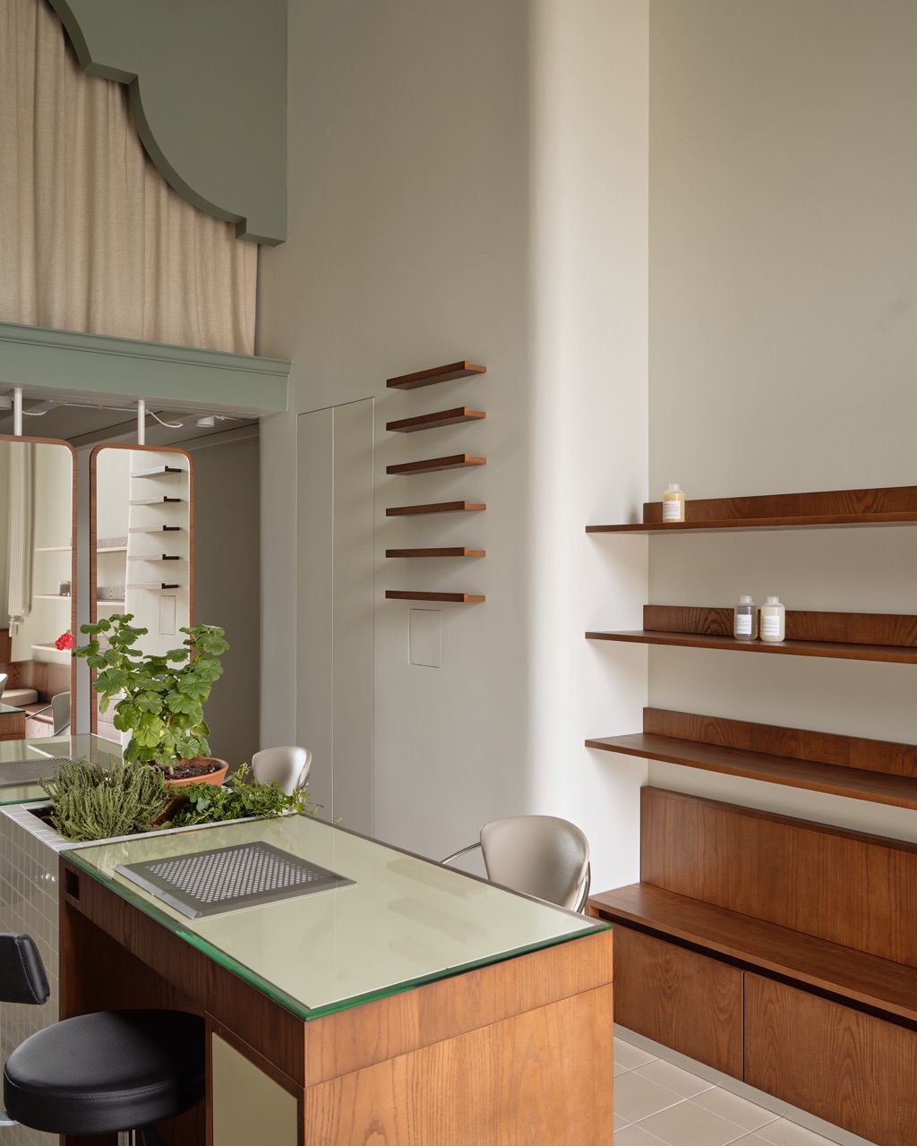 Все цвета и текстуры построены на нюансах: на полу — испанская керамическая плитка нежно-терракотового цвета, стены молочного тона, шторы из неотбеленного натурального льна. Основной шпон — насыщенный, служащий визуальным якорем пространства, и в пару к нему — серо-зеленый тон фасадной части антресоли. В маникюрные столы интегрирован светло-лимонный цвет для визуального облегчения. Стулья клиента — винтажные итальянские Effezeta с обивкой цвета кофе с молоком.