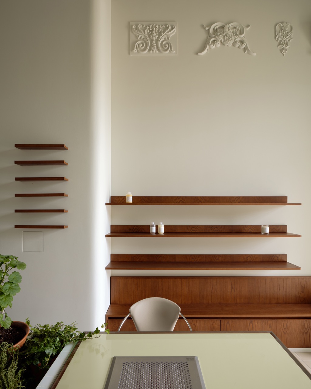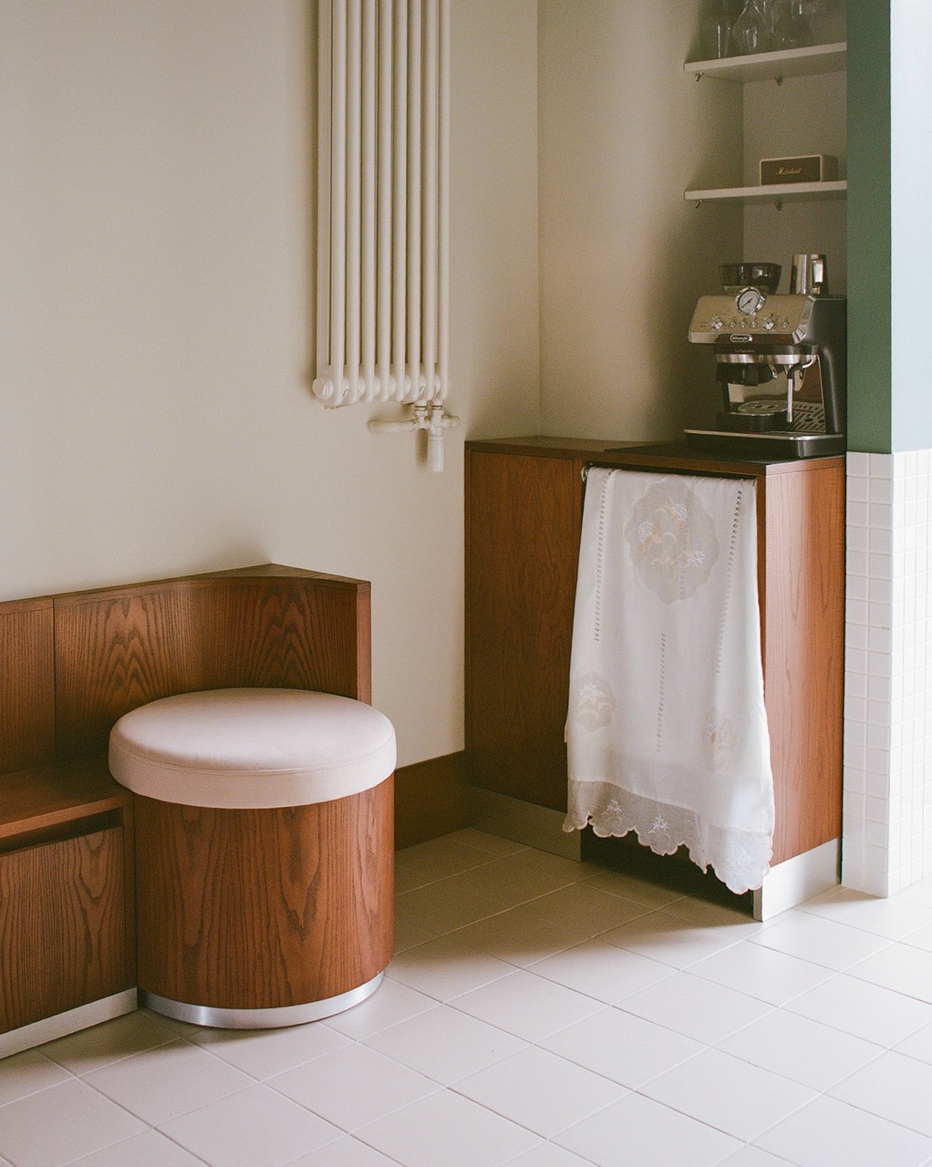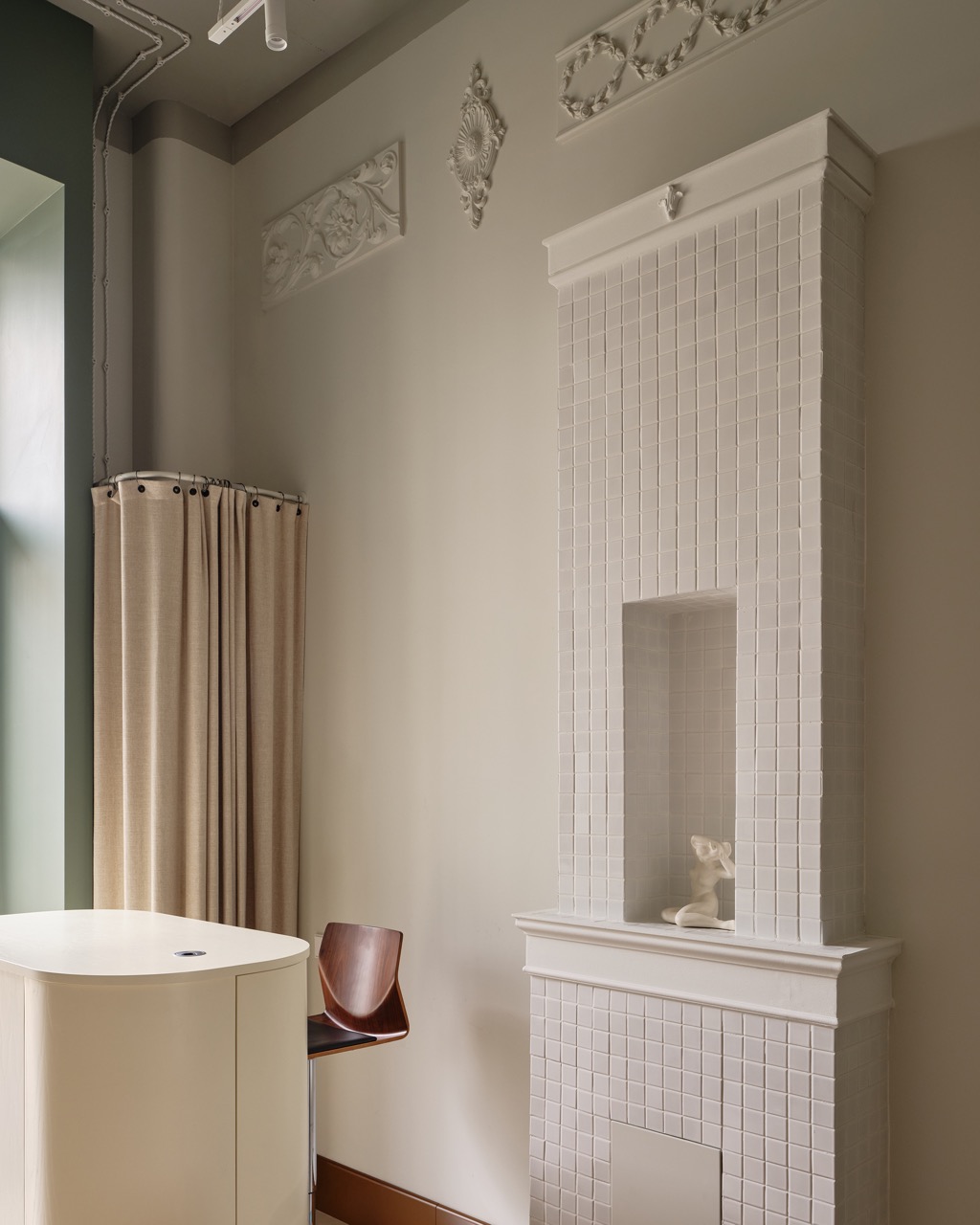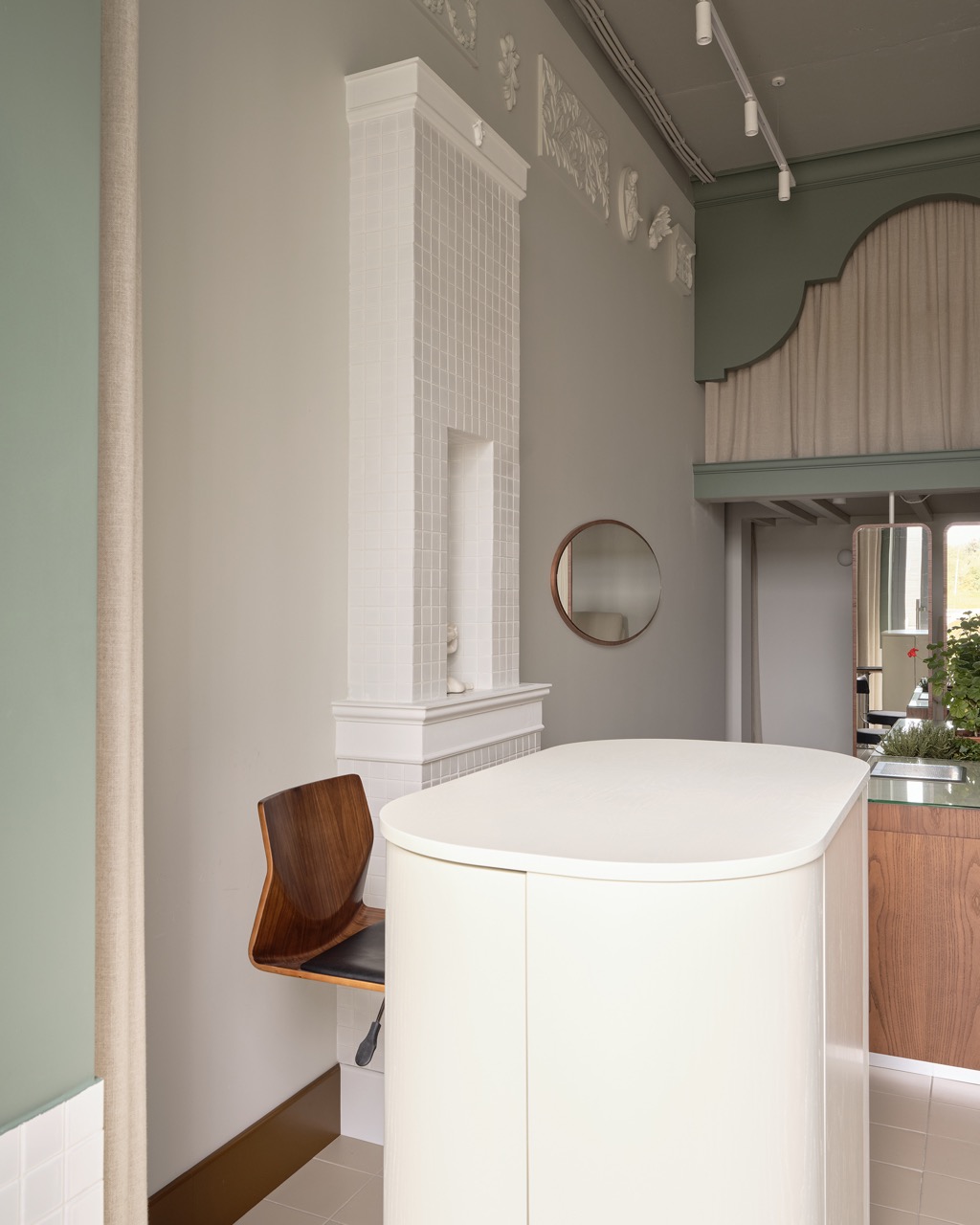 Все цвета и текстуры построены на нюансах: на полу — испанская керамическая плитка нежно-терракотового цвета, стены молочного тона, шторы из неотбеленного натурального льна. Основной шпон — насыщенный, служащий визуальным якорем пространства, и в пару к нему — серо-зеленый тон фасадной части антресоли. В маникюрные столы интегрирован светло-лимонный цвет для визуального облегчения. Стулья клиента — винтажные итальянские Effezeta с обивкой цвета кофе с молоком.