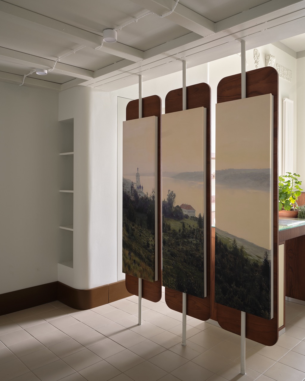 Пространство работает с темой дома, развивая ее не напрямую, а благодаря архитектурным элементам и деталям. Камин — «якорь дома» — оказывается декорацией и скульптурой одновременно. Занавес второго этажа напоминает задернутые шторы. Лепные элементы на стенах, размещенные словно в произвольном порядке, отсылают к домашним коллекциям античных слепков. Модернистская, отчасти пуристская оболочка, лаконичные мебельные формы подчеркивают немногочисленные фигуративные элементы.