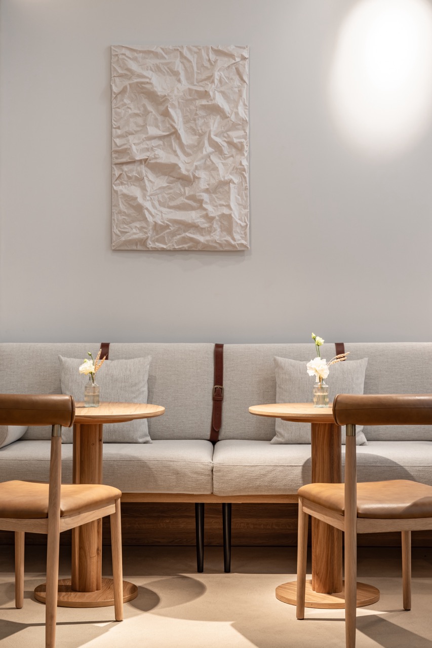Кондитерская плавно переходит во второй, обеденный зал. Светлые оштукатуренные стены украшены ненавязчивыми арт-объектами, выполненными из мятой бумаги. Детали интерьера напоминают и об истории этого места, и ненавязчиво обращаются к теме старинной конюшни, которая все больше раскрывается в двух дальних залах ресторана.