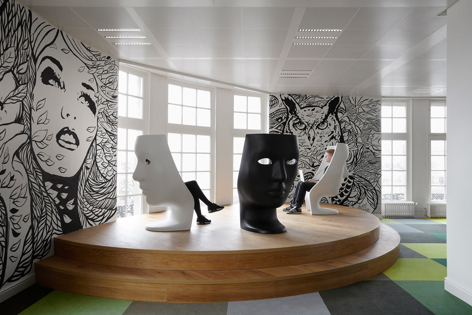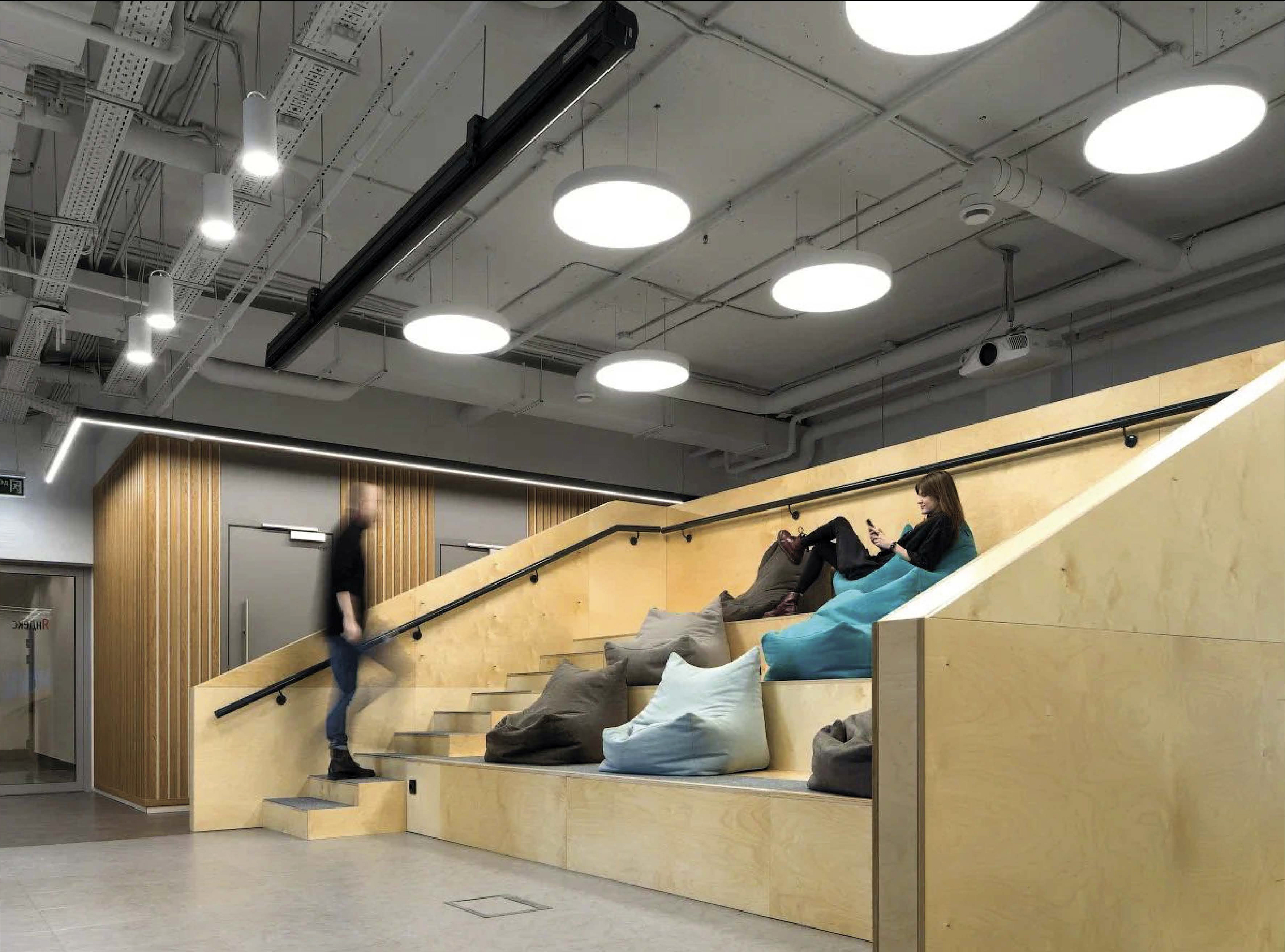 Игровой неформальный элемент важен, но он должен быть уместен. Например, лестницы-амфитеатры с широкими ступенями можно использовать и как место для лекций, неформальных мероприятий, общения и отдыха.Такое решение, например, мы реализовали в офисе для компании Яндекс в Москве.