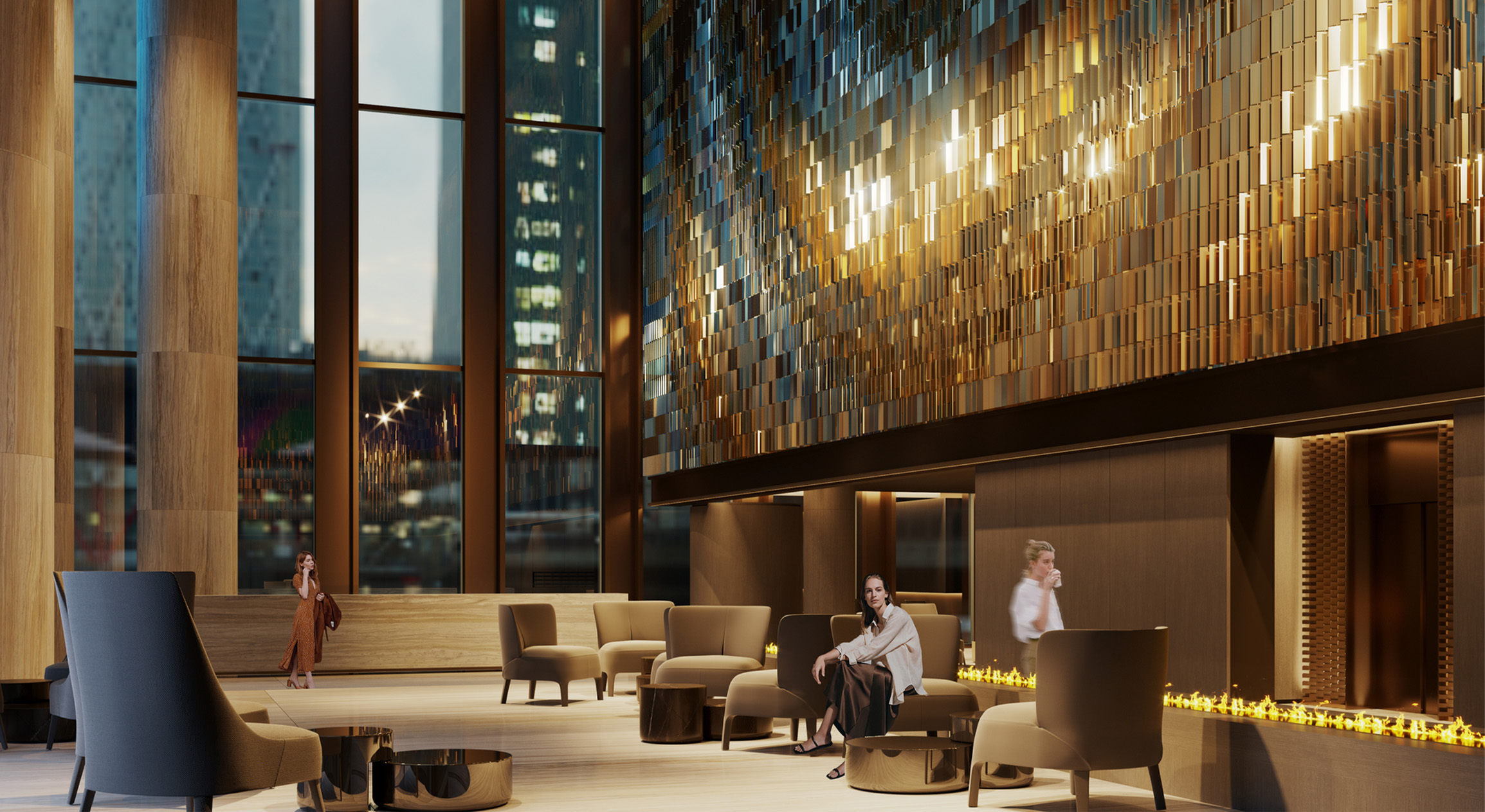 Проект, разработанный командой архитекторов UNK interiors под руководством Юлии Тряскиной, призван решить важную задачу: привнести в пространство «Москва-Сити» значимый арт-объект и создать новую точку притяжения для горожан. Центральным элементом проекта стала художественная инсталляция известного мультидисциплинарного художника Андрея Бергера. Концепция, родившаяся в коллаборации UNK interiors и художника, основана на образе луча света, проникающего в здание и заполняющего интерьер бликами и отражениями. Этот образ воплощен в виде двух монументальных панно размером 32х11 метров каждое, где тысячи металлических пластин с золотистым покрытием формируют динамичный рисунок.